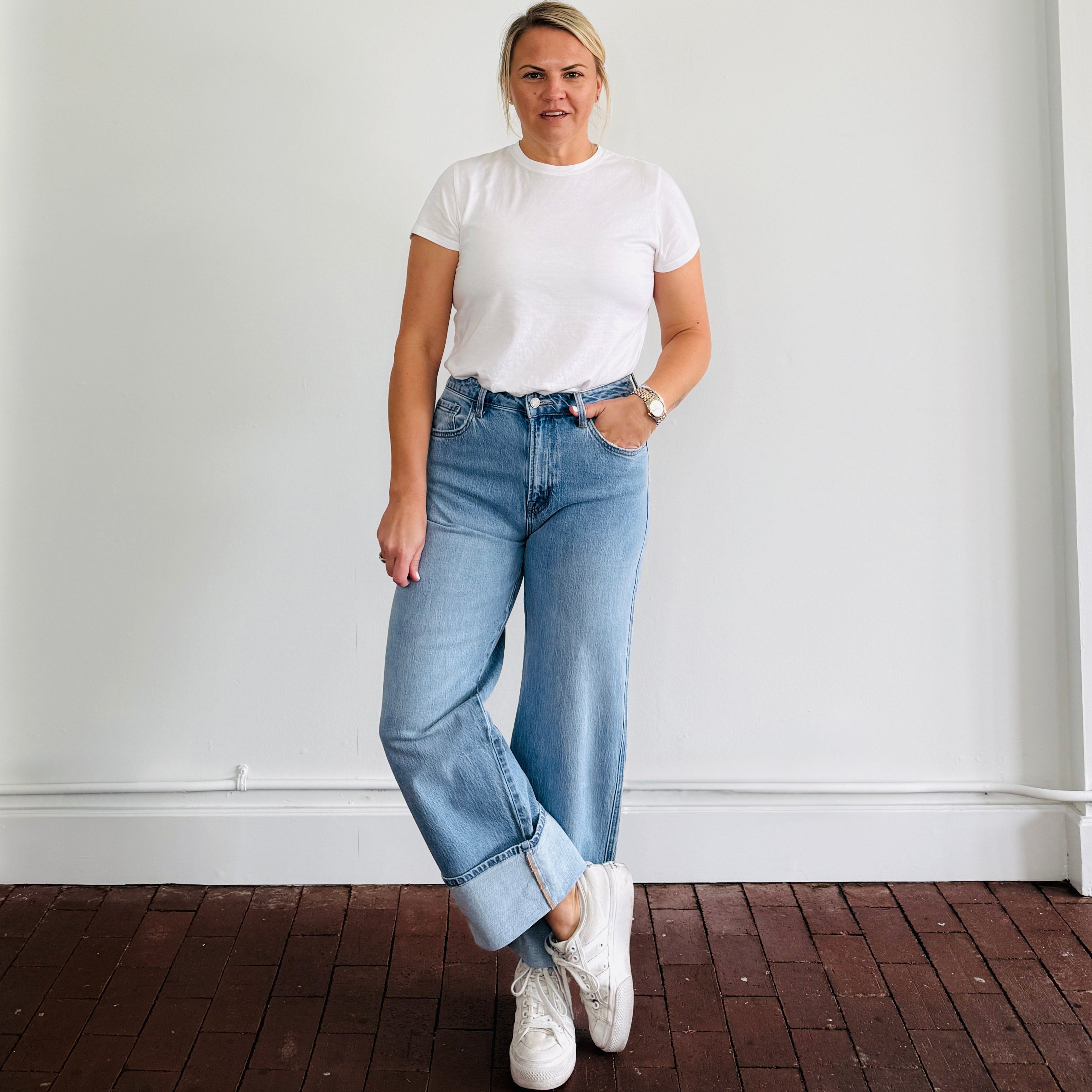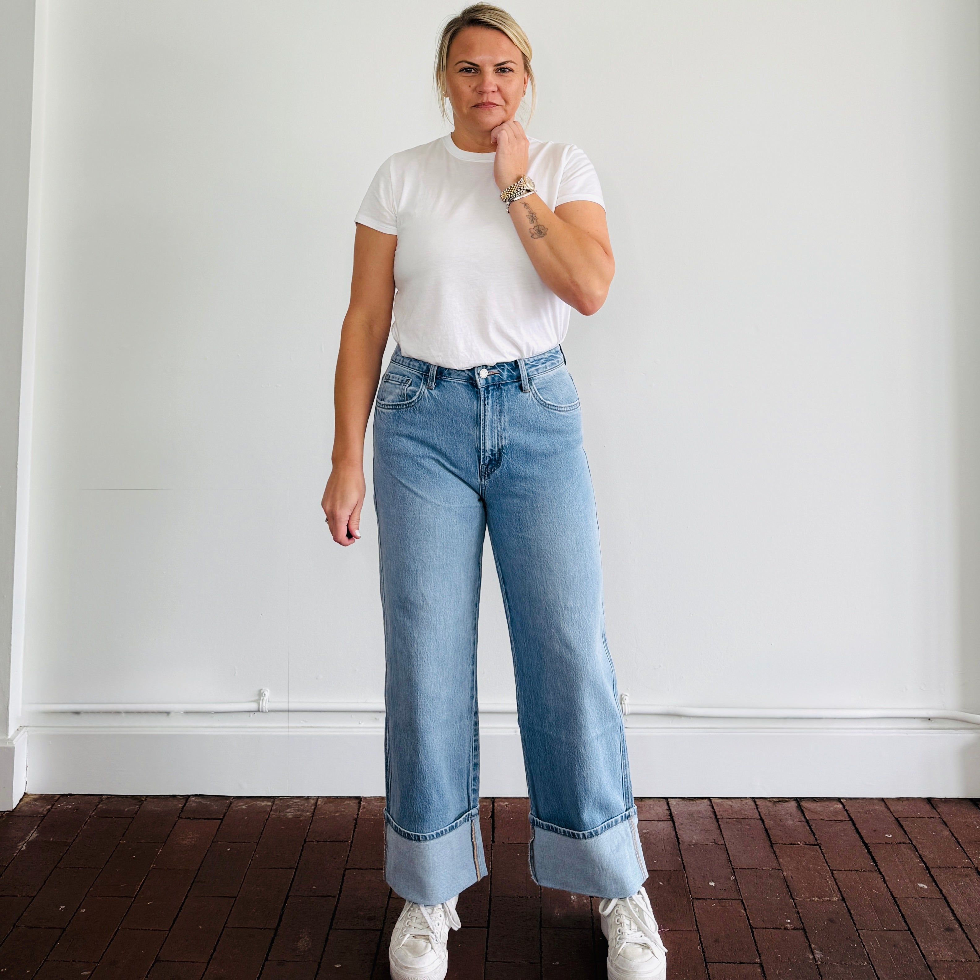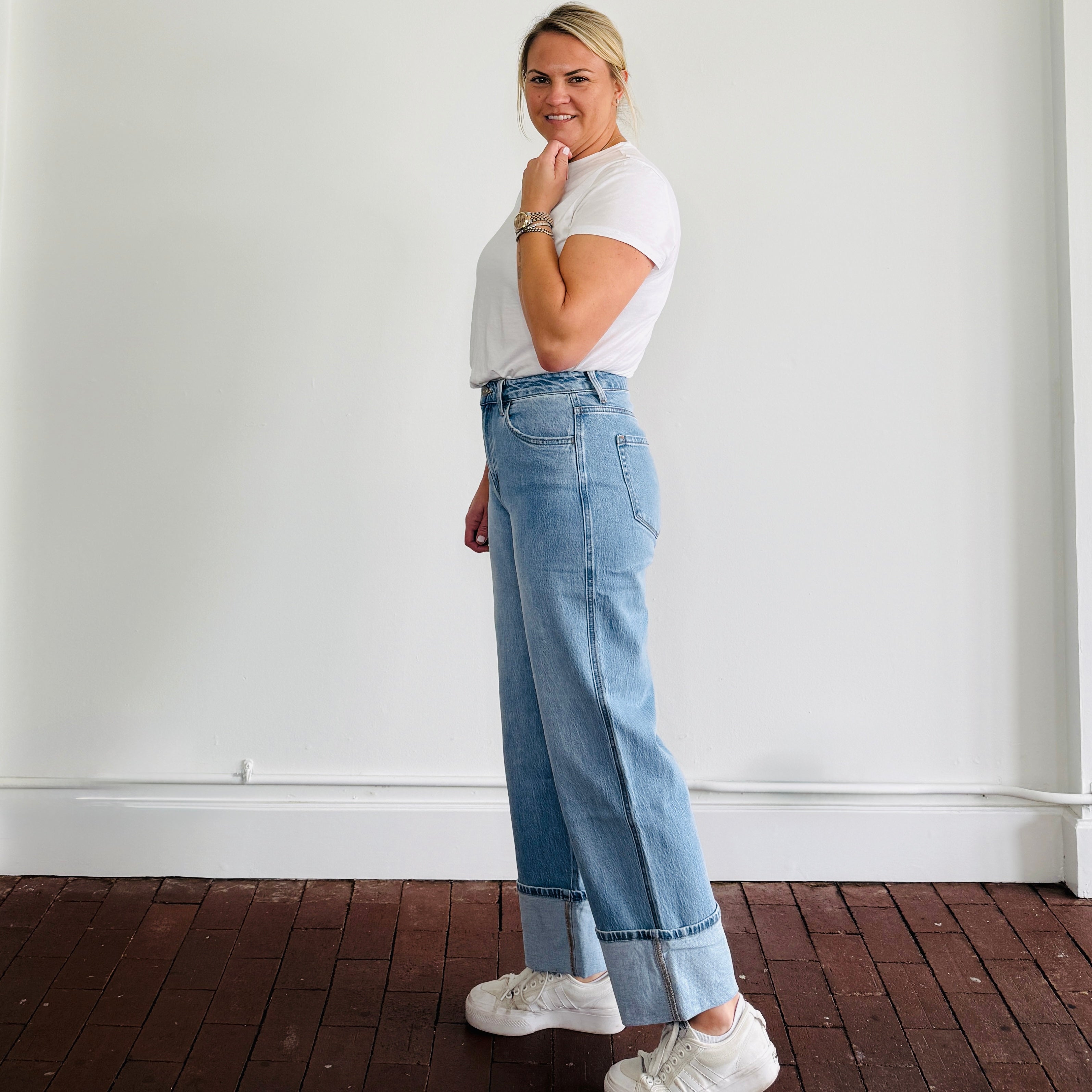 Super high rise, cuffed baggy straight leg jeans. Comfort stretch denim, single cuff hem, cropped length.