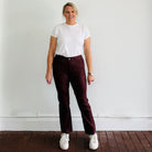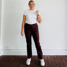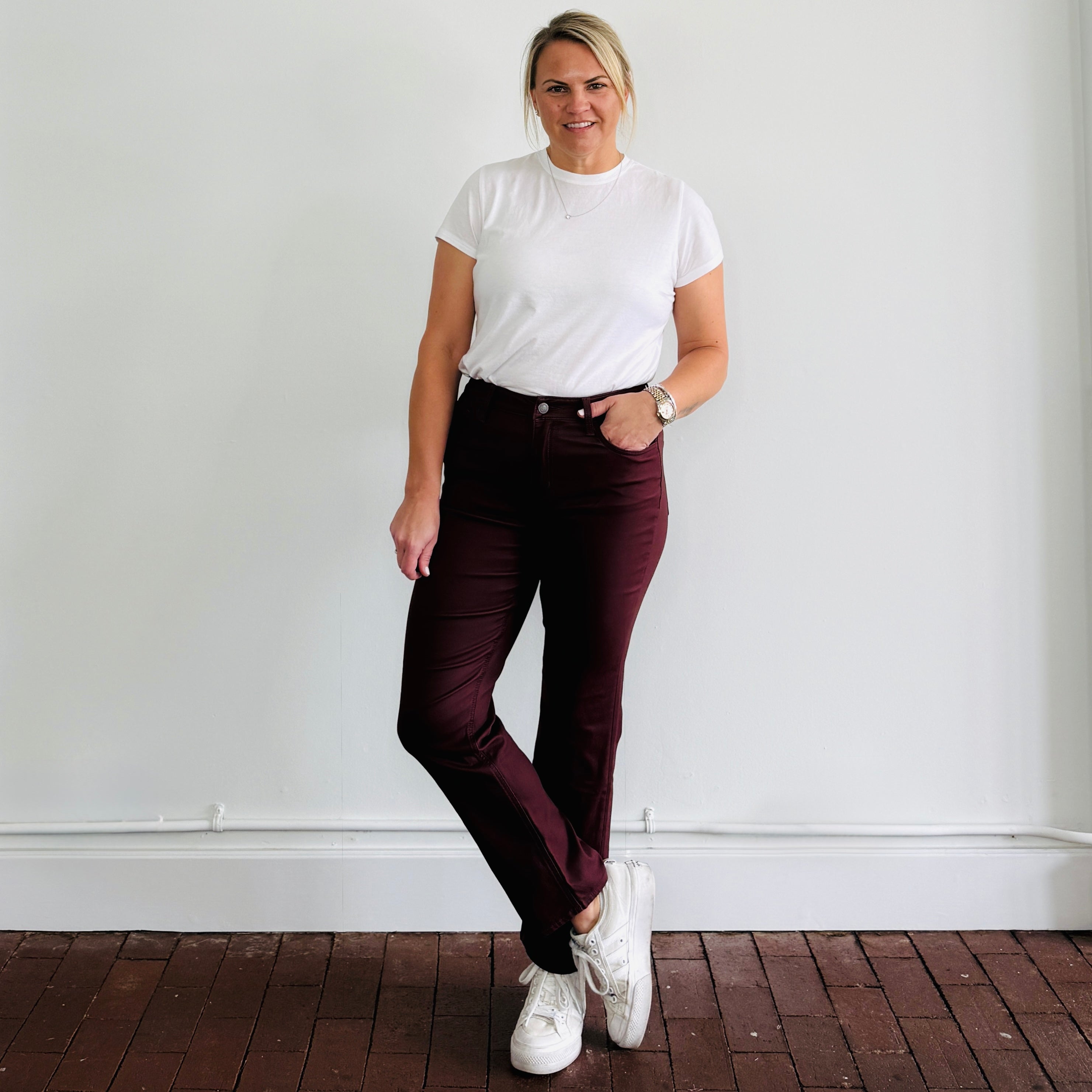 High rise, wine color slim straight jeans. Comfort stretch denim, high rise waist, finished hem
