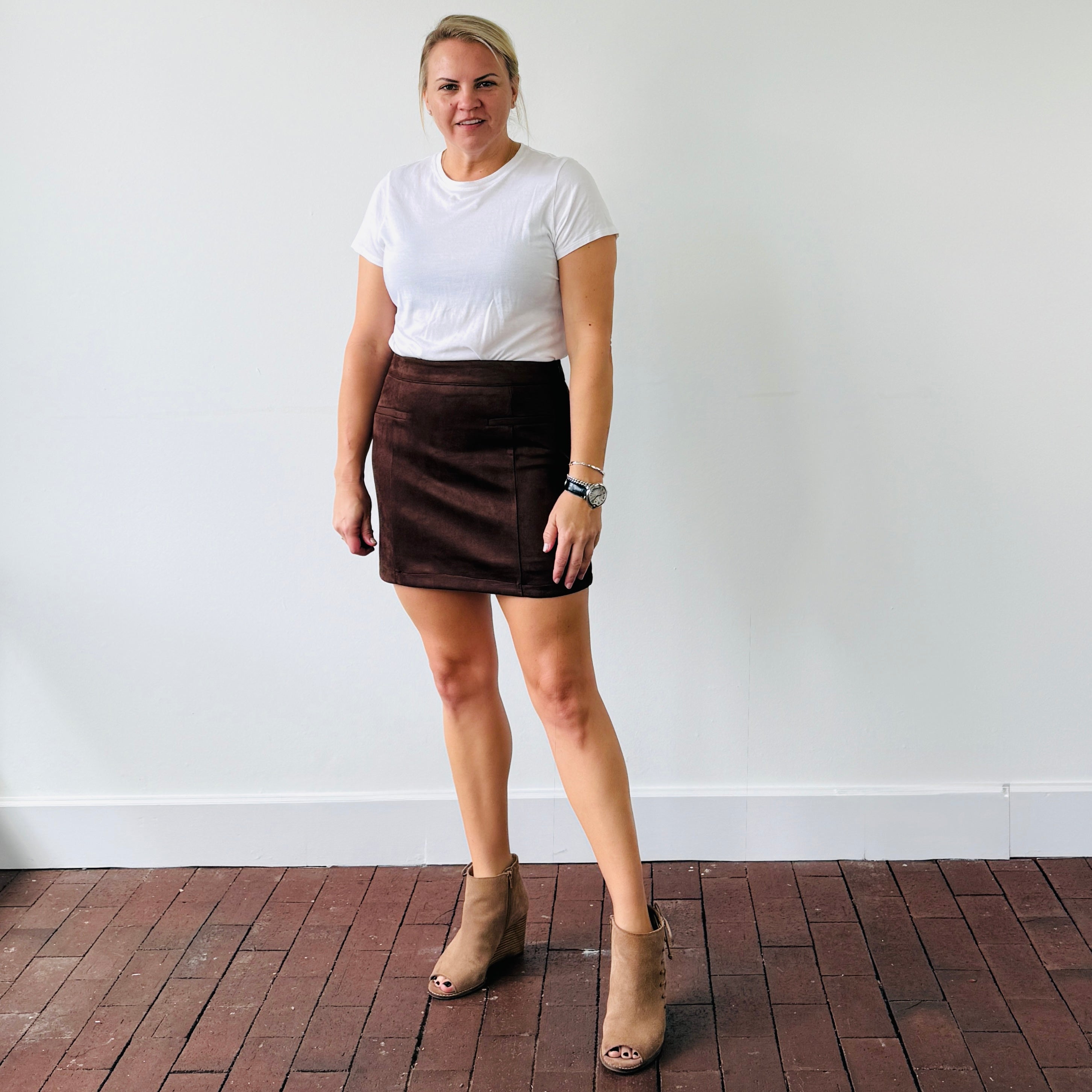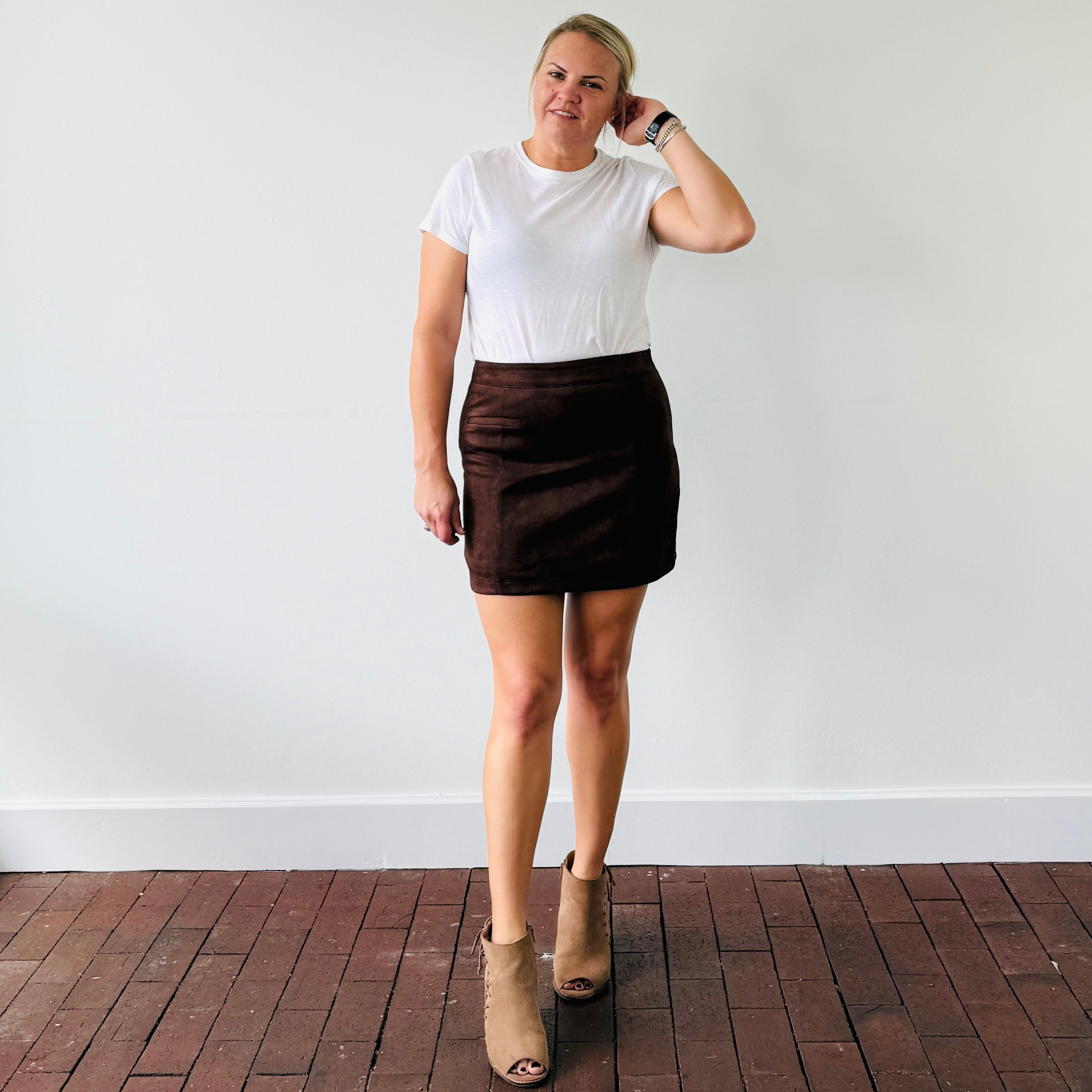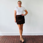 Elevate your everyday style with the Nicole Faux Suede Skirt...a rich, chocolatey mini with the perfect mix of polish and edge. This ultra-soft, high-waisted number hugs just right and pairs effortlessly with everything from a tucked tee to a chunky knit.