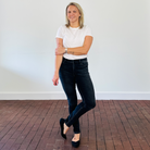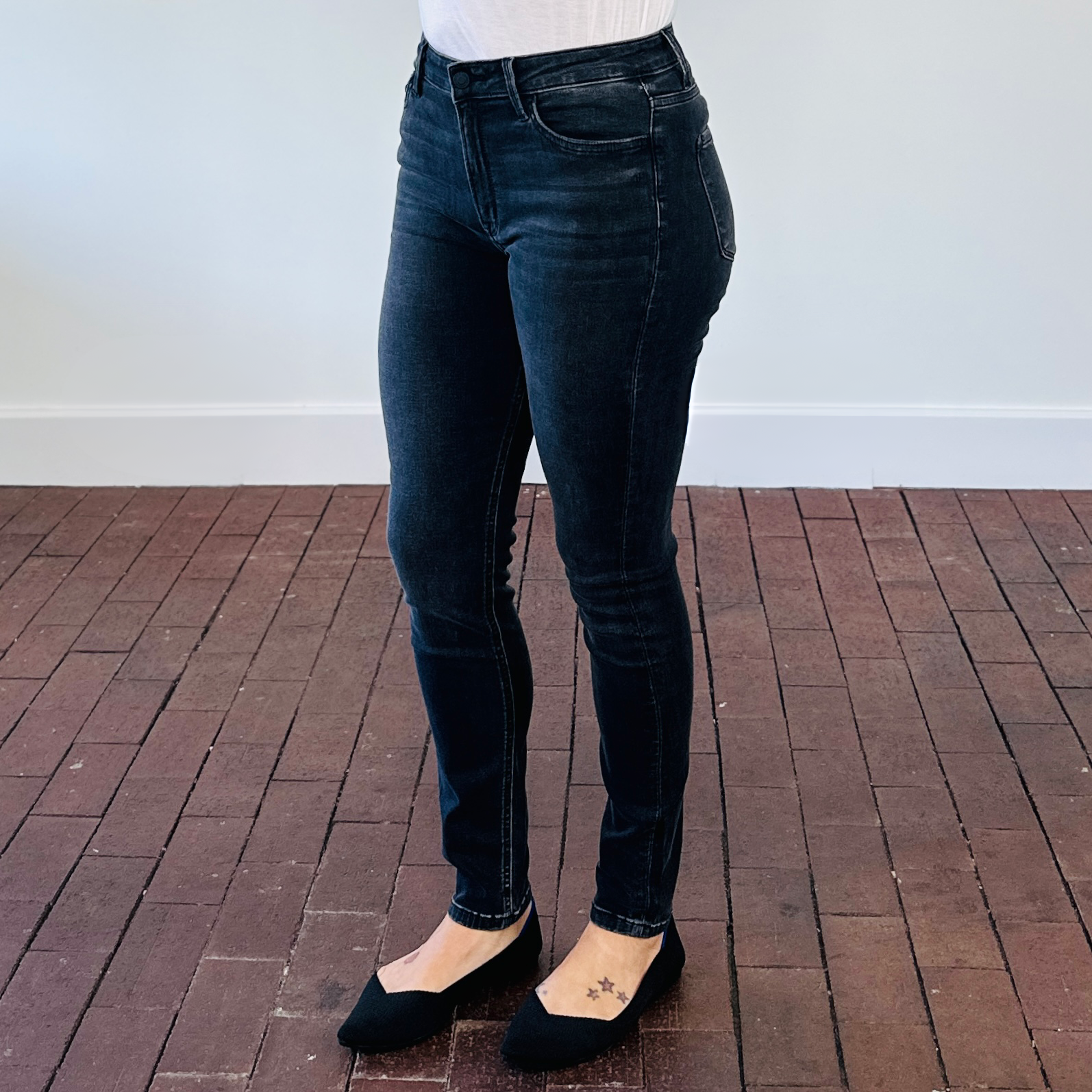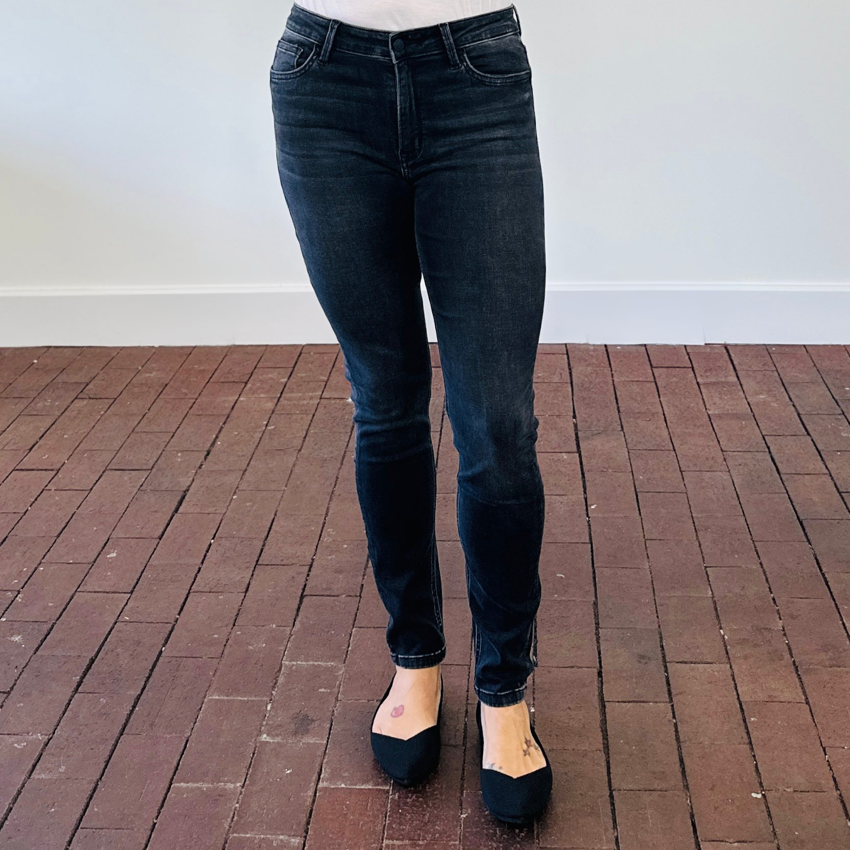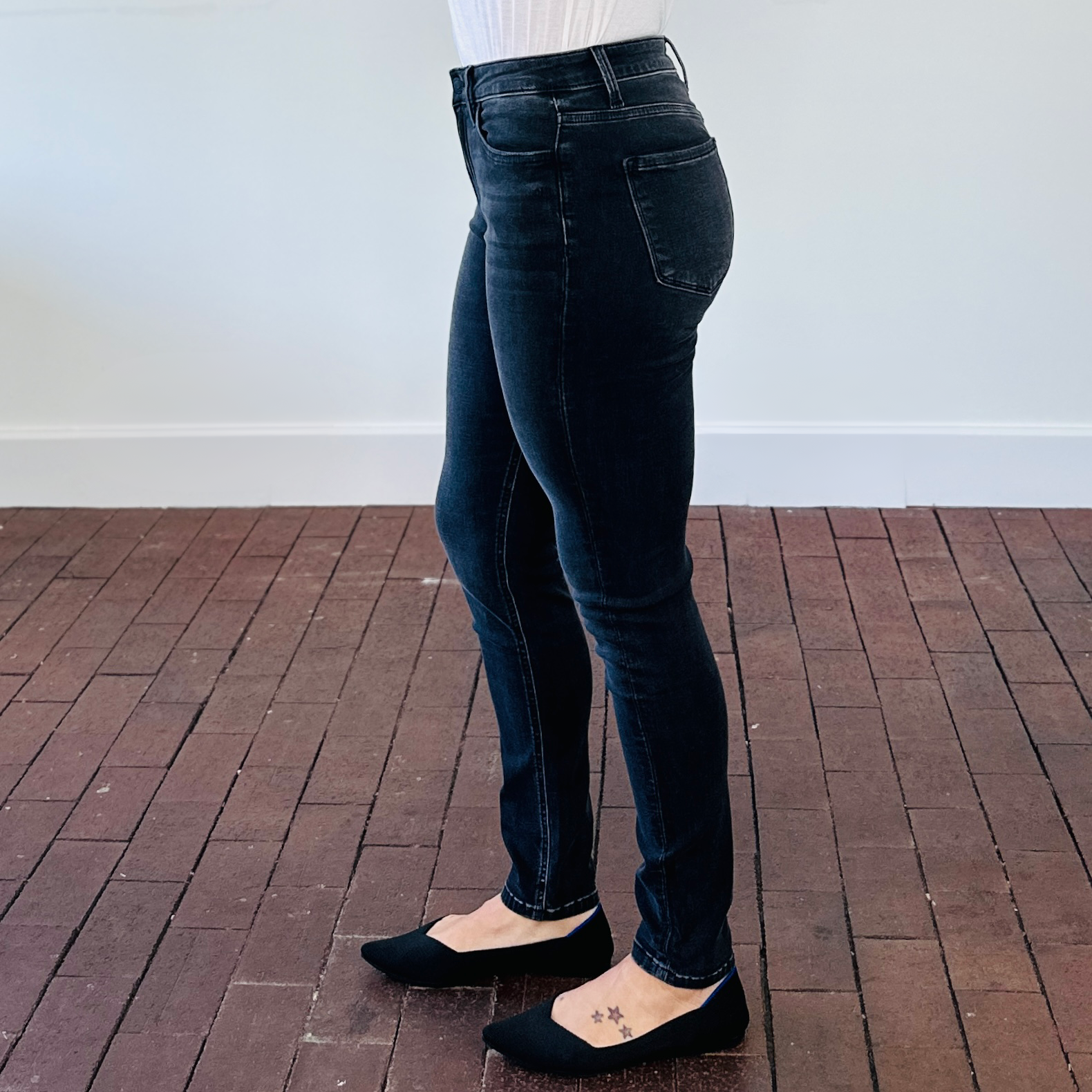 Super soft high rise skinny features the classic 5 pockets, zip and button fly, faded black wash, high rise, and a true skinny fit.