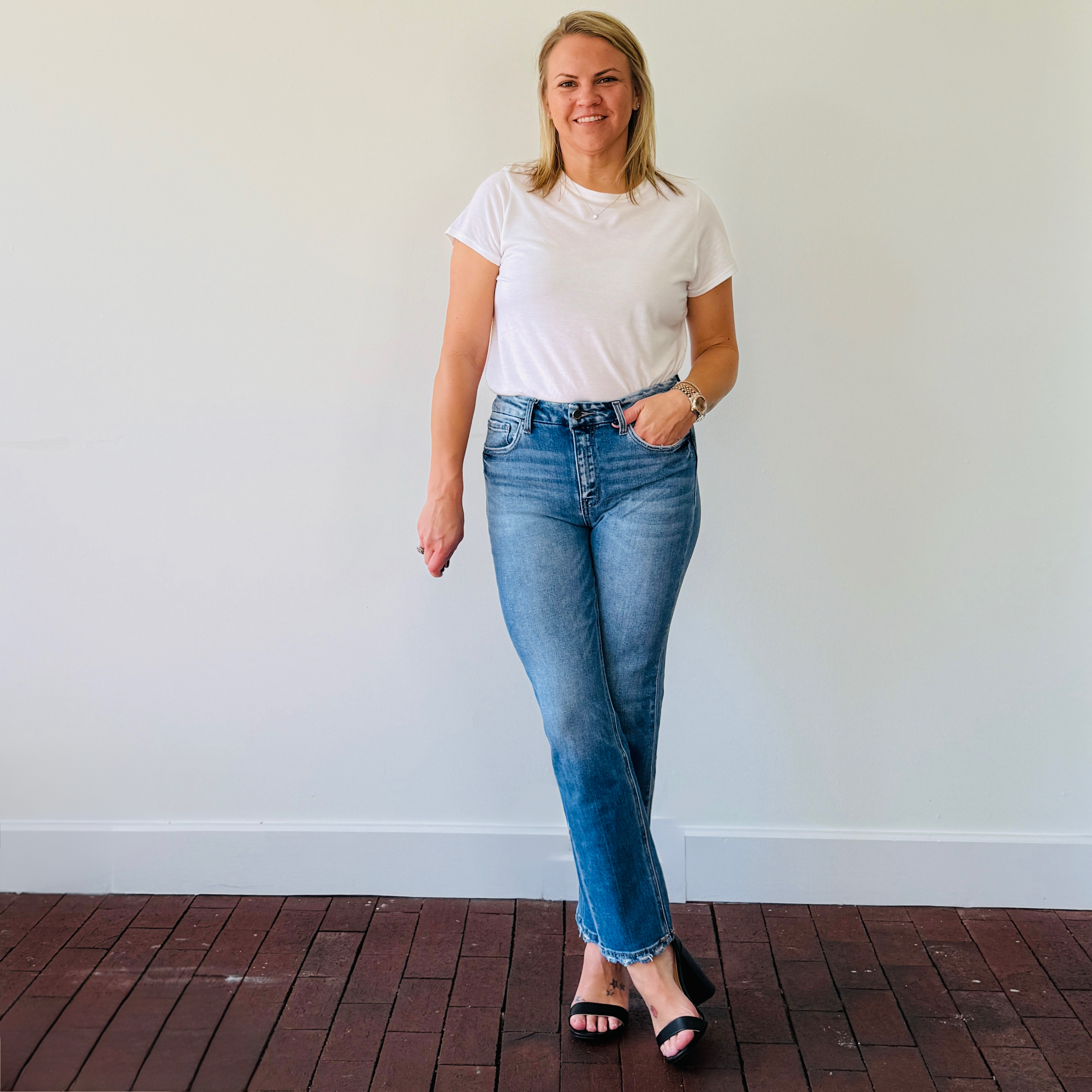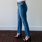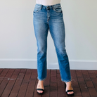 The Poised High Rise Slim Straight Jeans from Flying Monkey are crafted to flatter your figure. Made from comfort stretch denim, these jeans effortlessly mold to your shape, featuring a high-rise waist and a sleek slim straight leg for a timeless, comfortable fit.