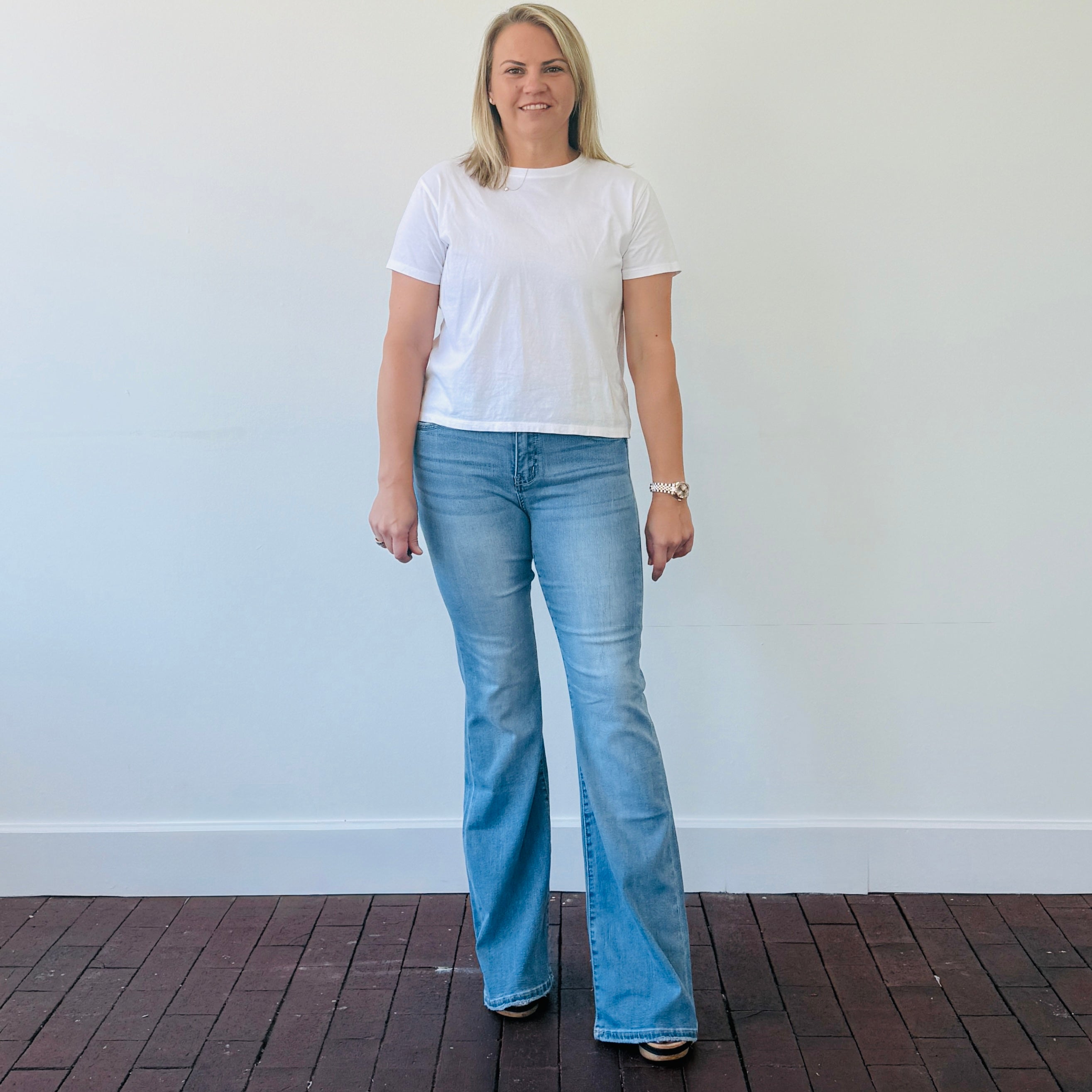 The Vervet Just Fine High Rise Flare is designed to elongate your legs and hug in all the right places. Crafted from comfort stretch denim, this full-length jean features a flattering high rise and a sleek flare silhouette that pairs perfectly with everything from a tucked-in tee to a structured blazer. It's polished, effortless, and made for movement.