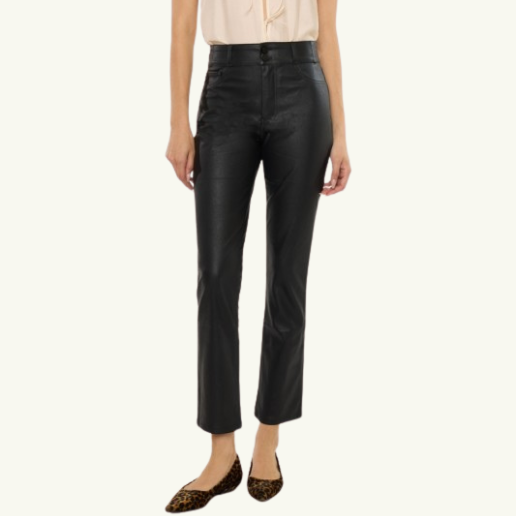 Vegan leather, high rise skinny pants. Comfort stretch, double button waistband, zipper fly.