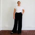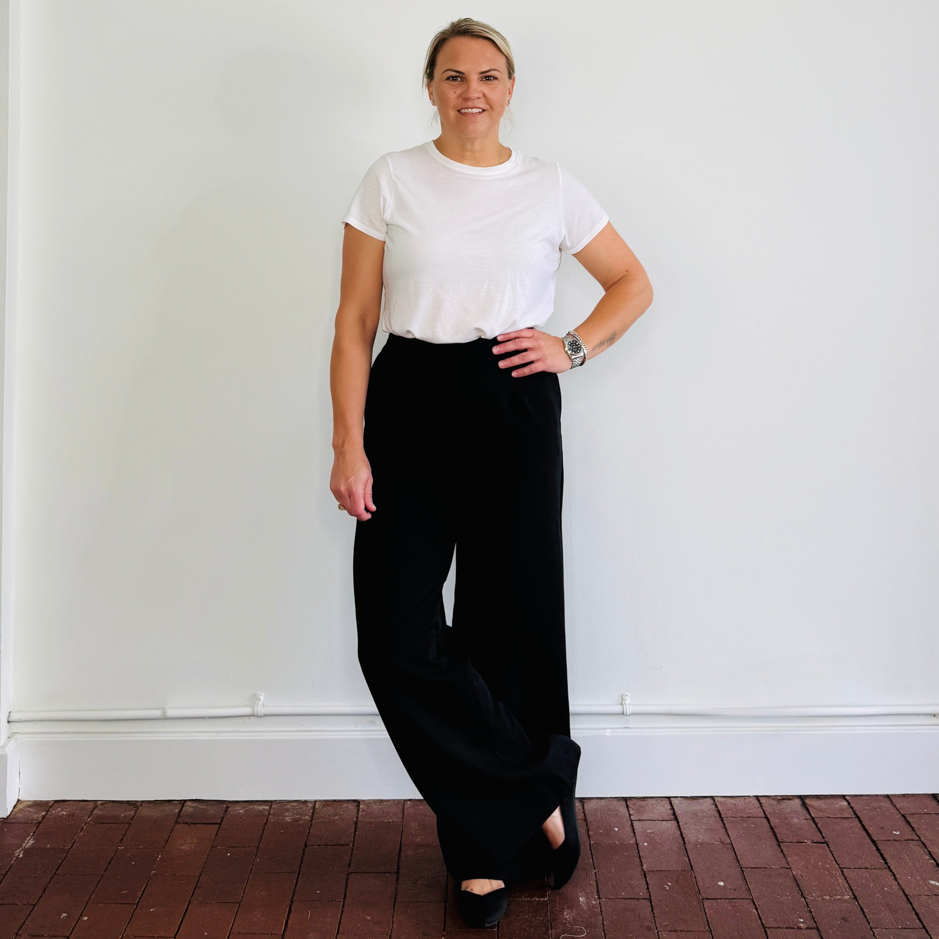 High waisted pleat front trouser with zip & button closure. Model is 5'4" and pants hit floor length.