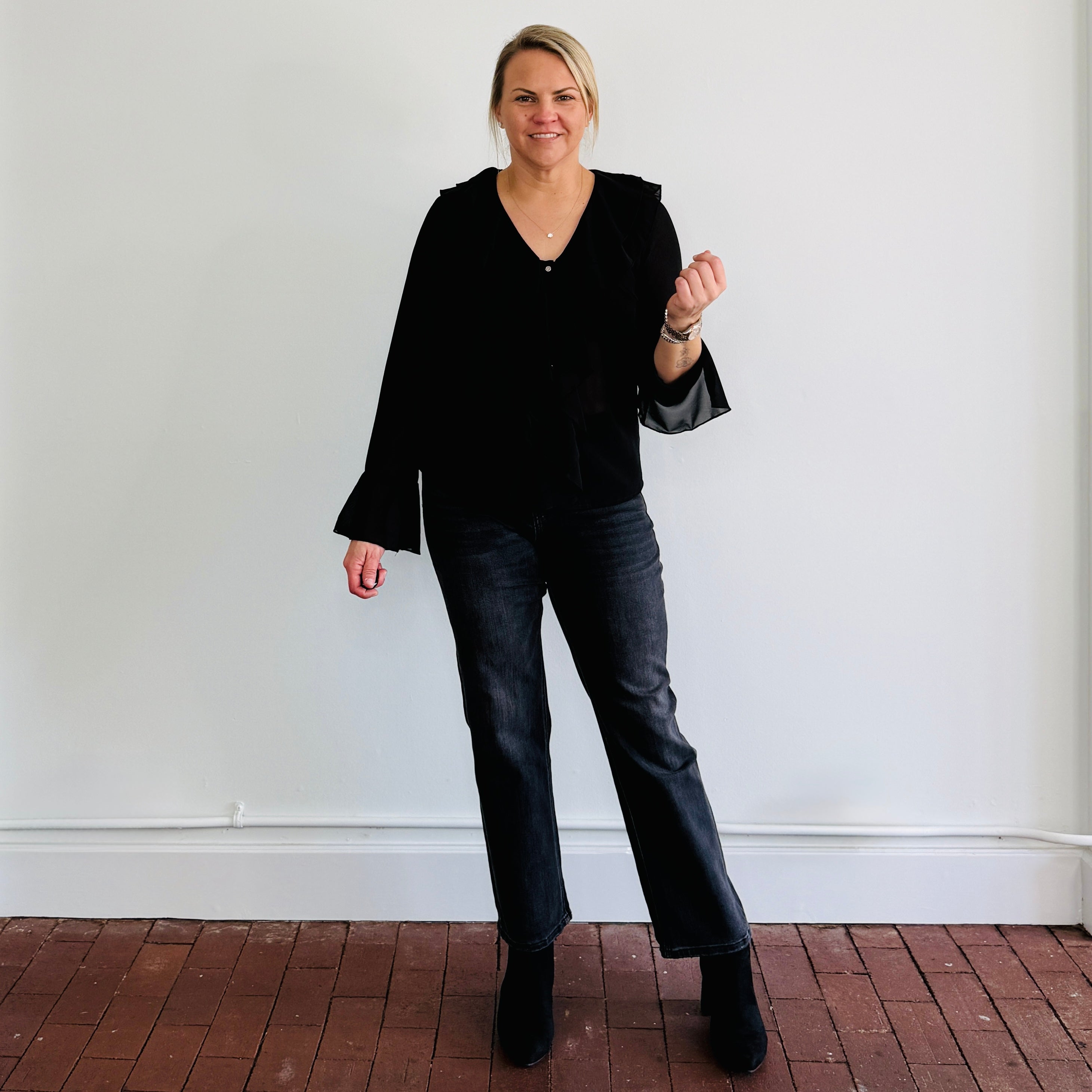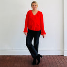V neck, ruffle front detail, ruffle sleeve blouse. Semi-sheer.