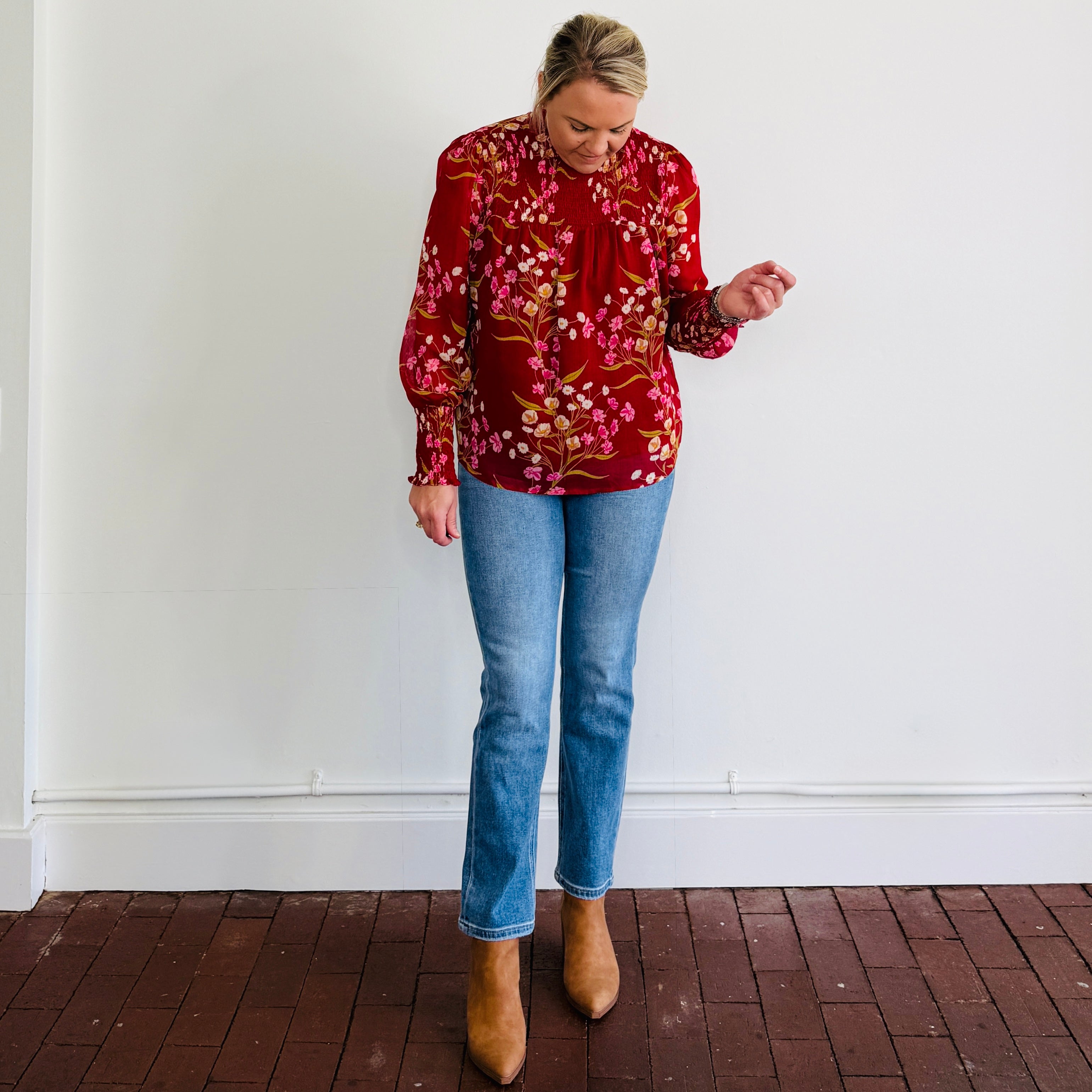 Long sleeve floral blouse with sheer balloon sleeves, smocking around the cuffs and on the neck.