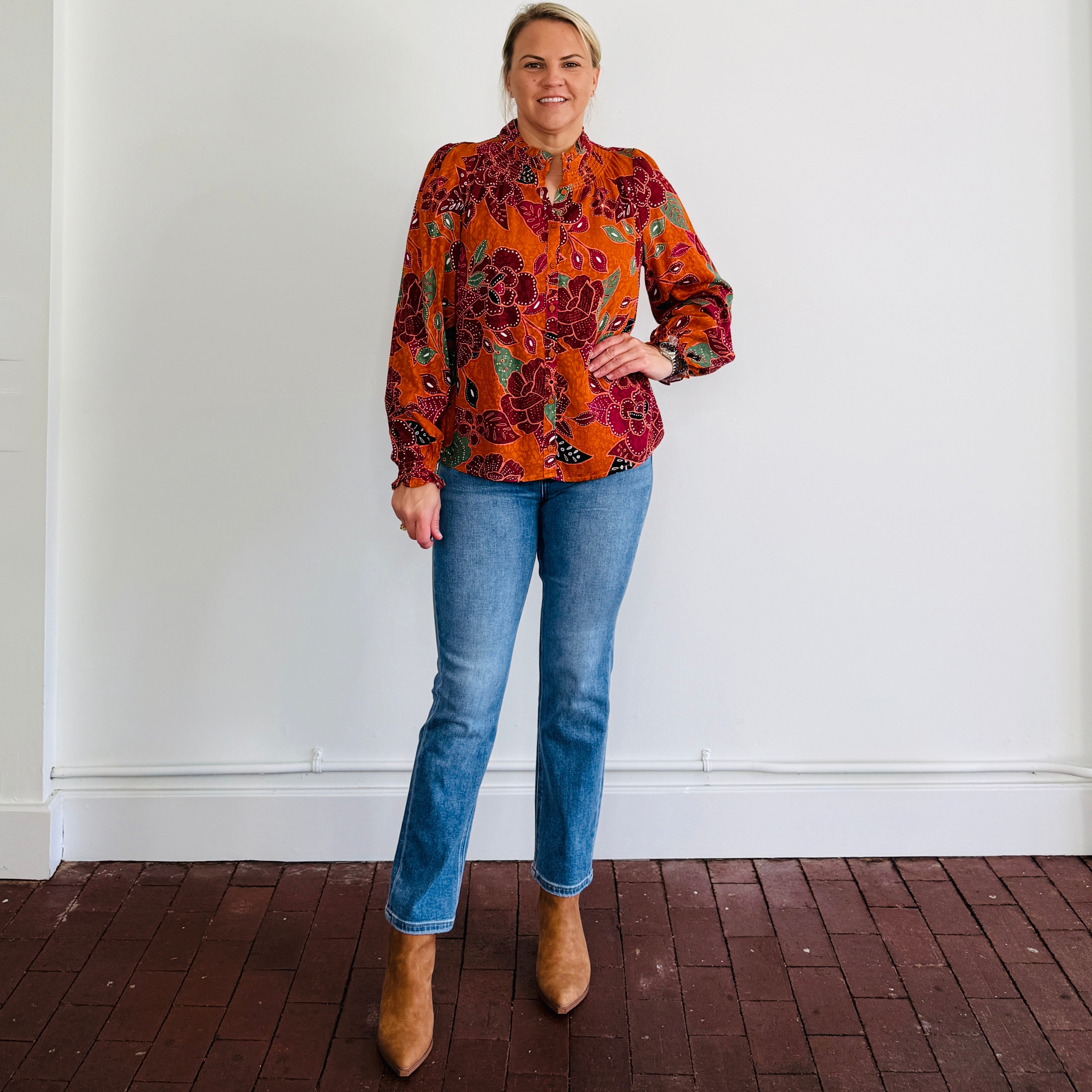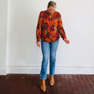 Rust floral print takes over this top with long sleeves, ruffles, and button front.