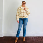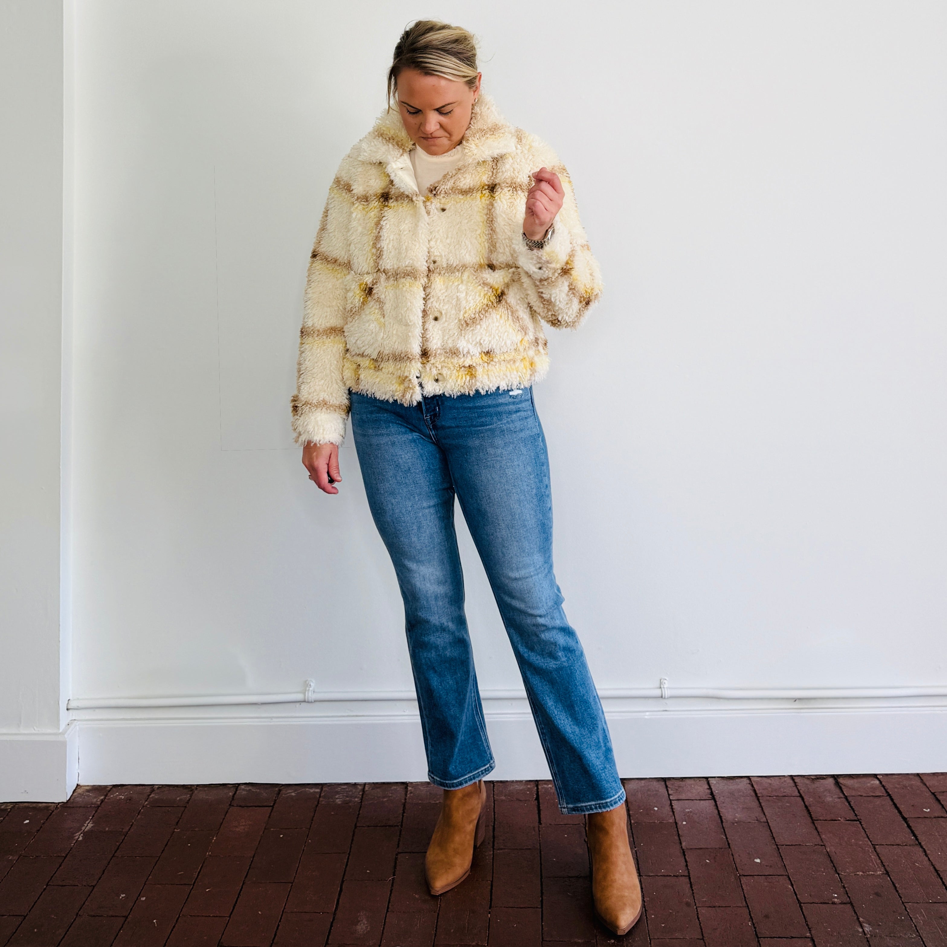 Faux Sherpa Fur Plaid Button Down Shirt Jacket.
