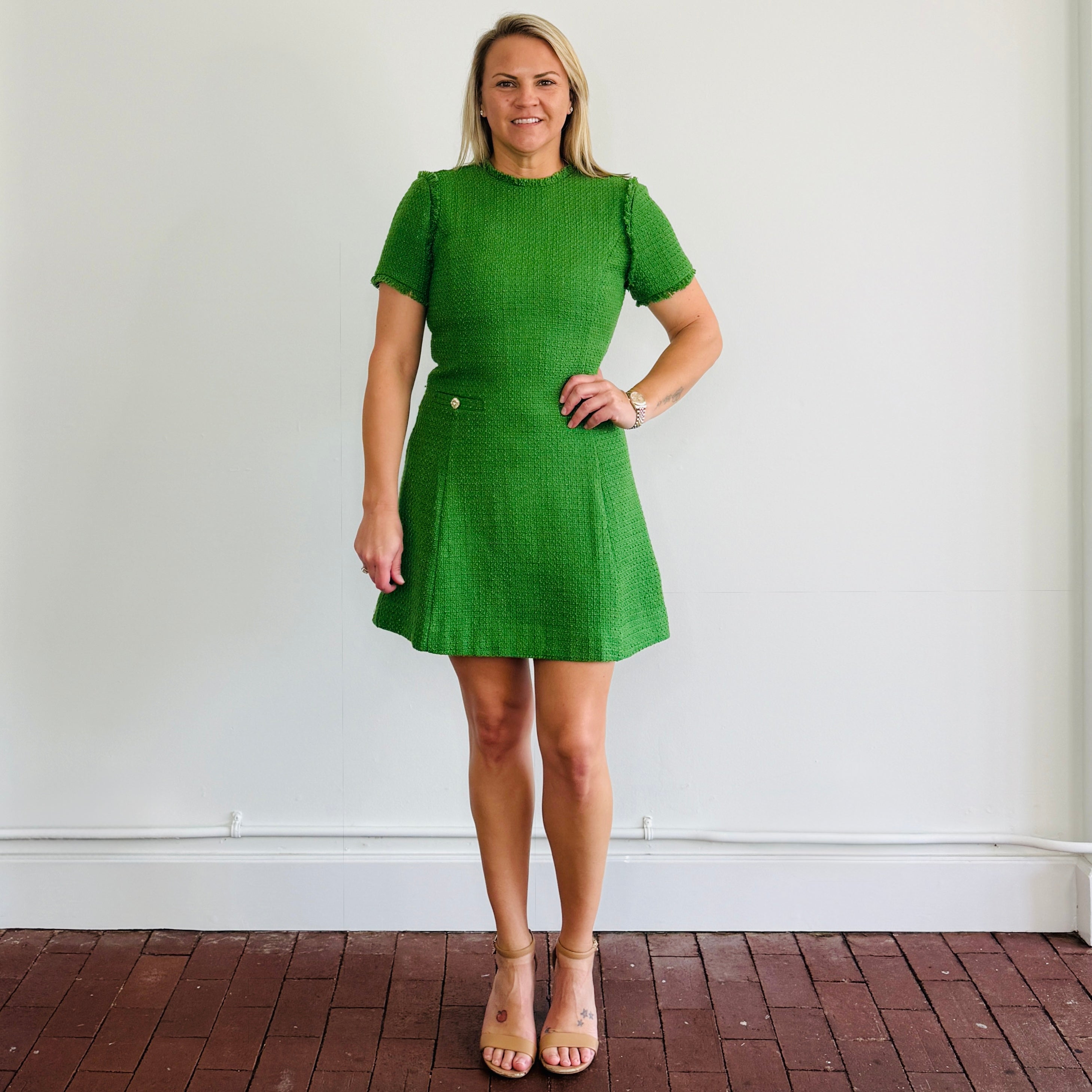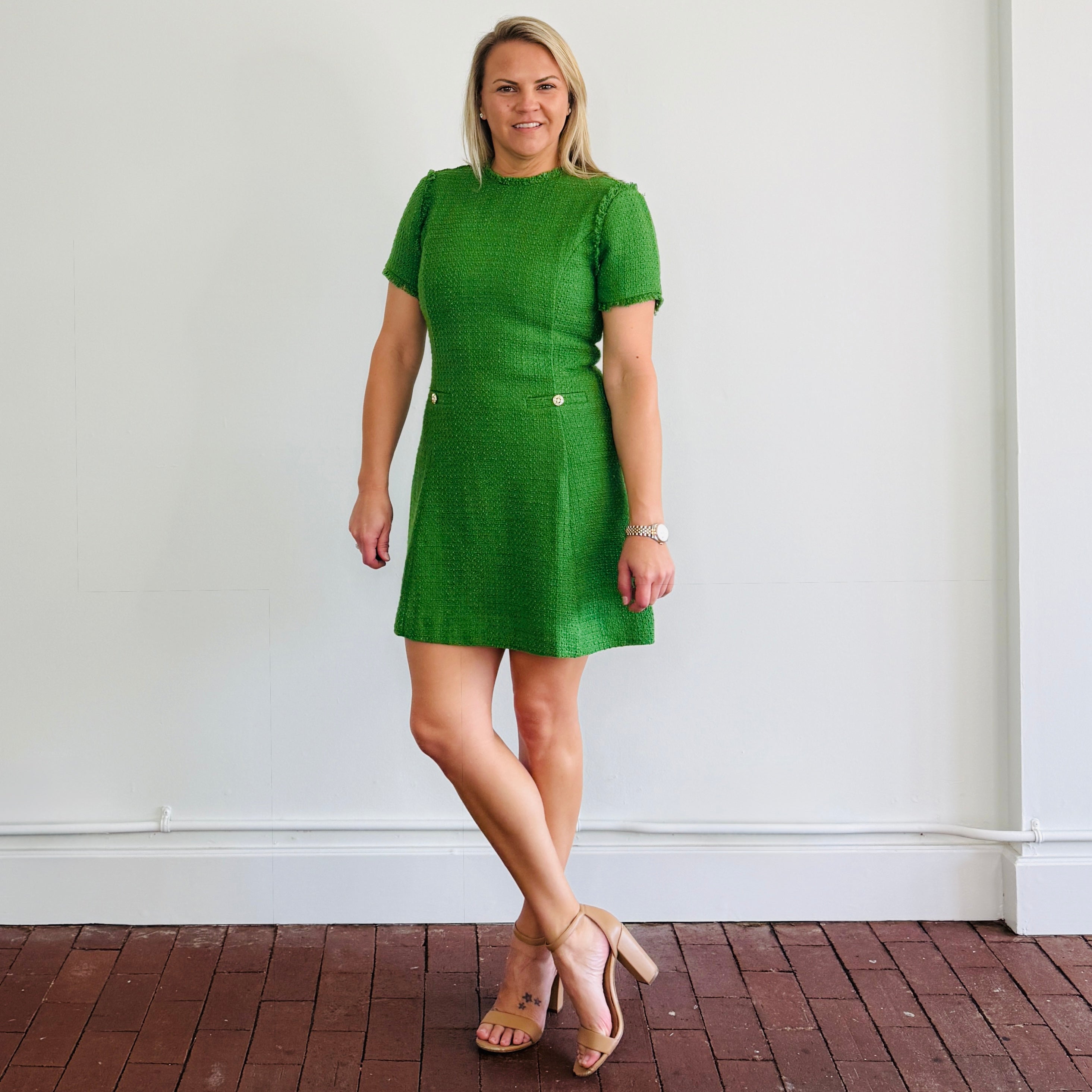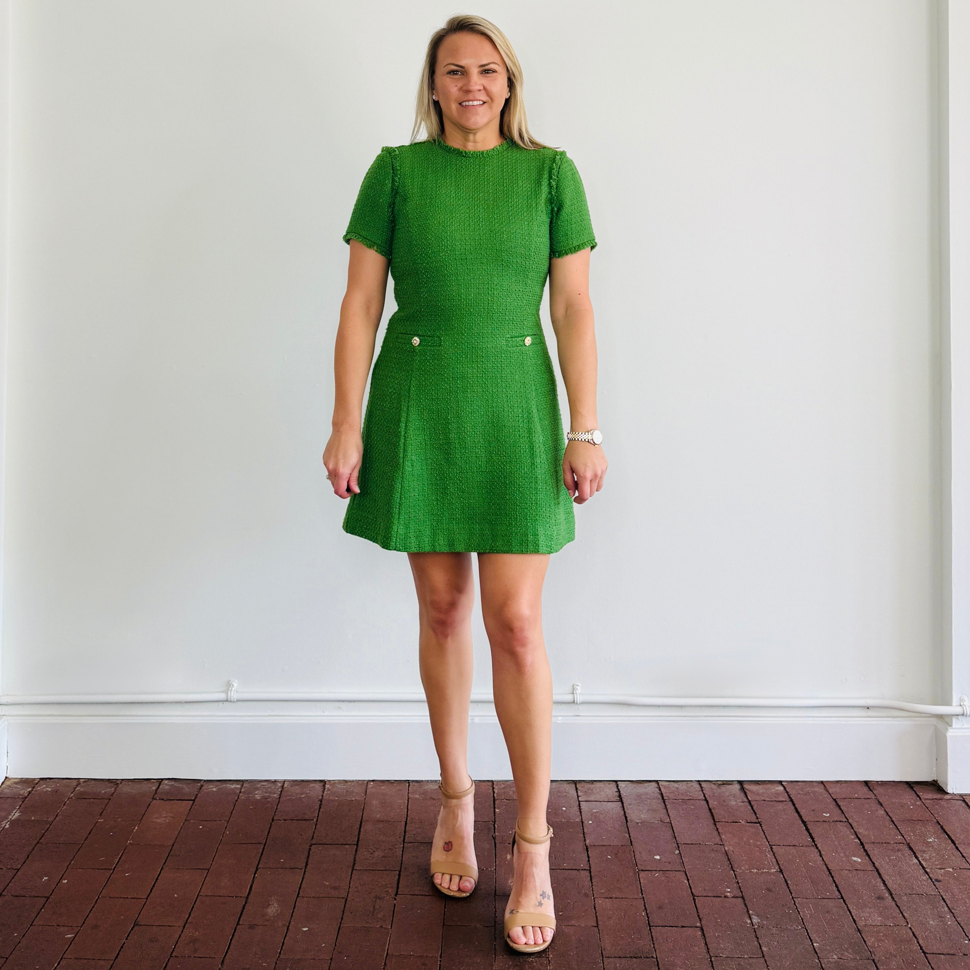 Short sleeve jacquard with faux pockets with jeweled buttons. Back zipper. Lined