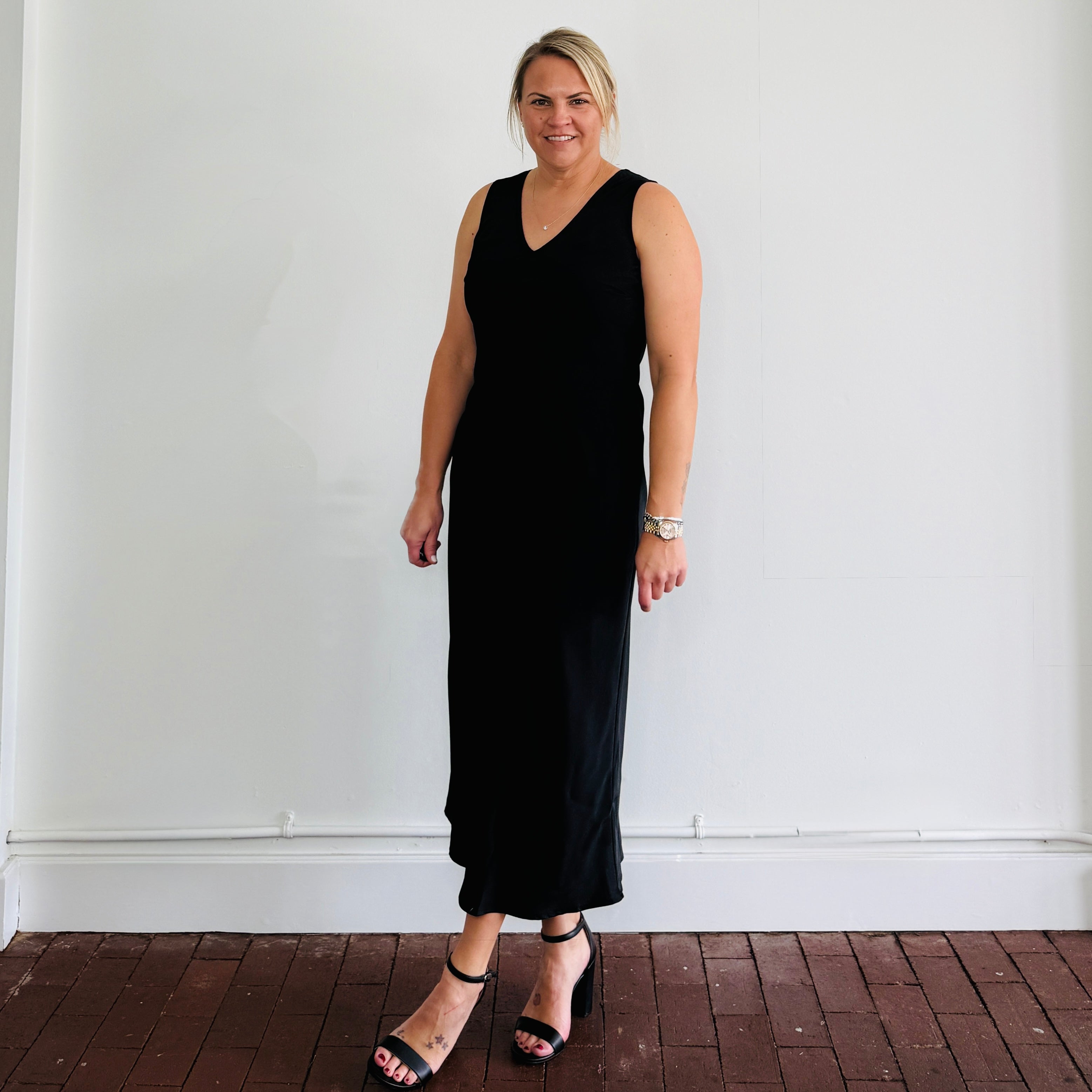 Satin V Neck Maxi Dress. Hidden back zipper. Bust darting. Unlined.