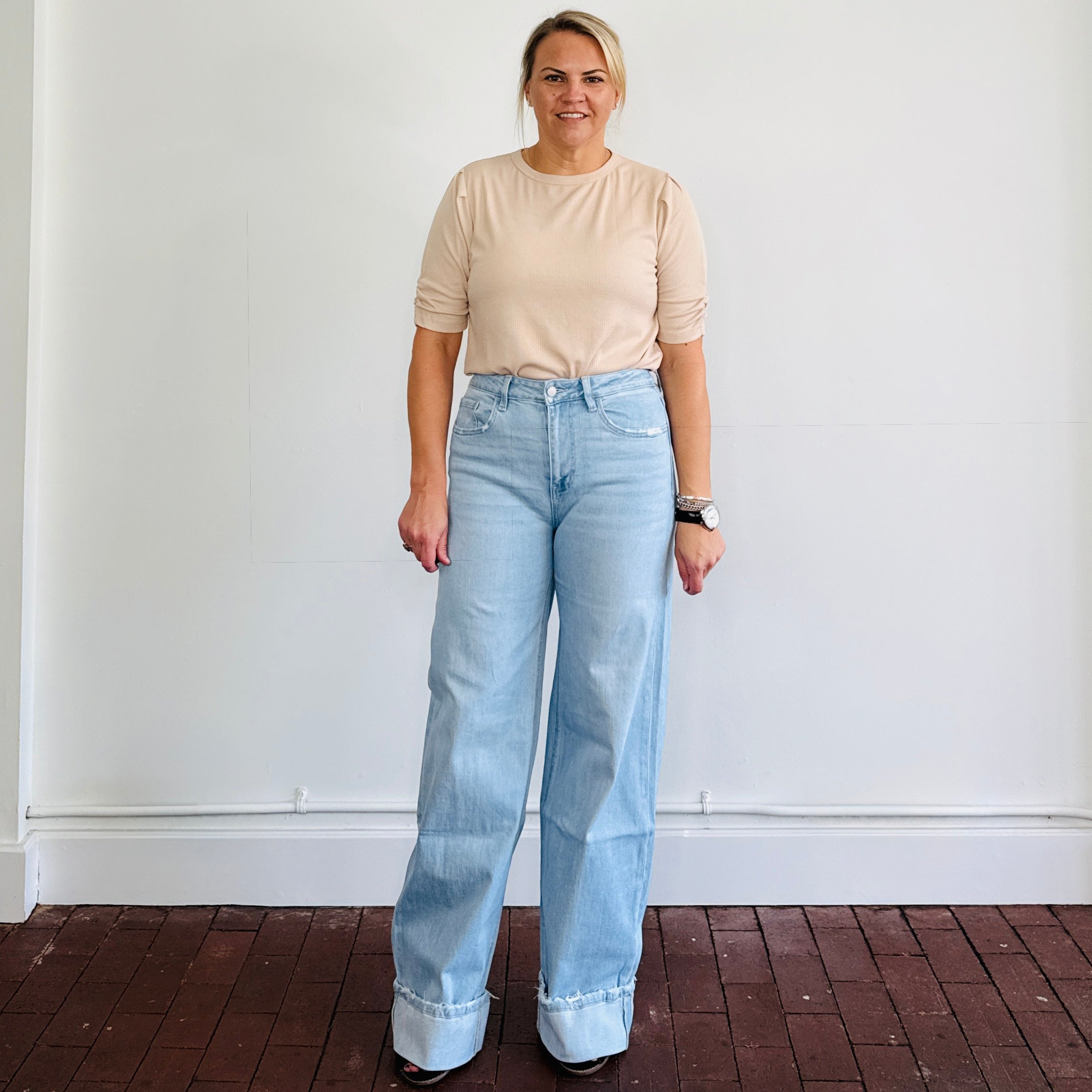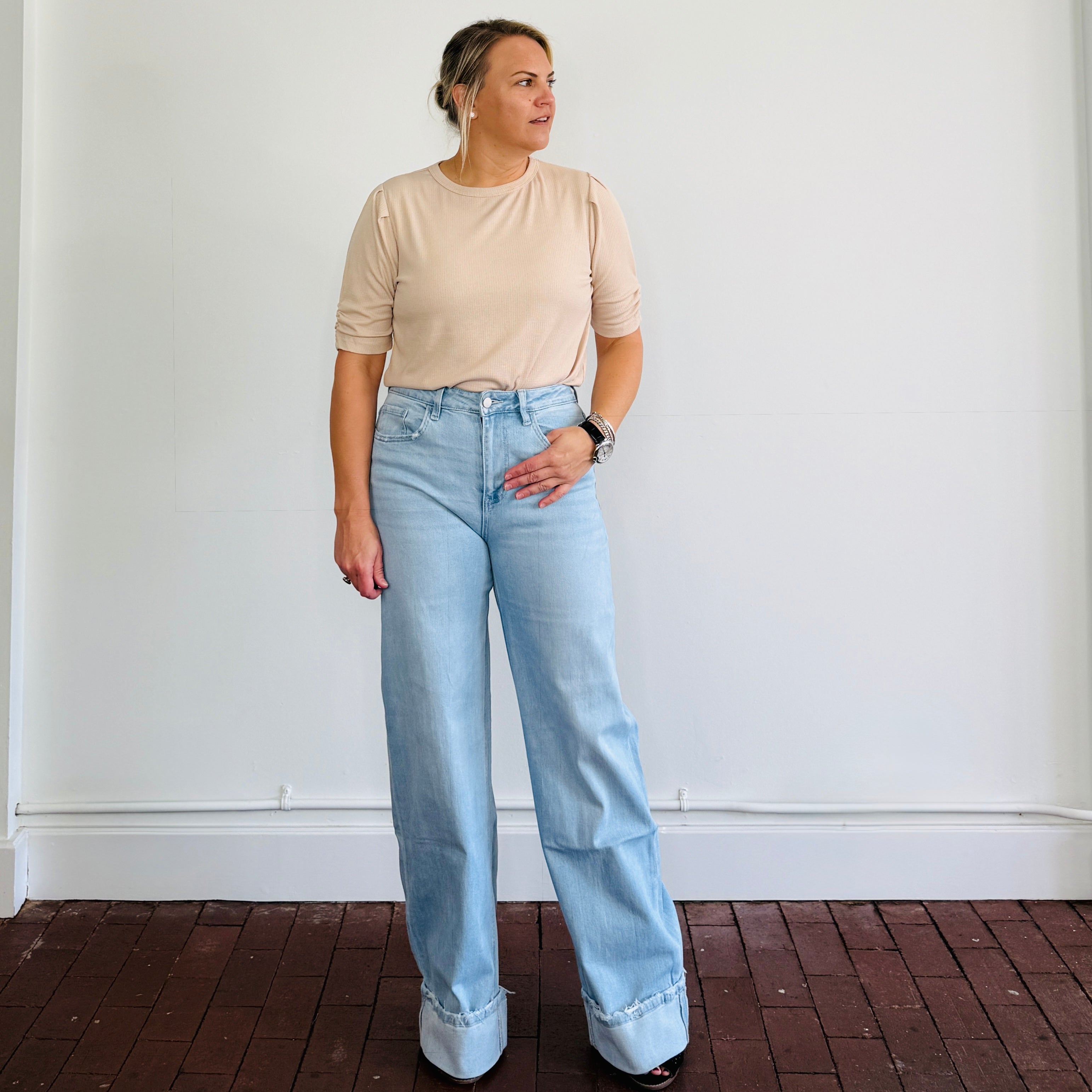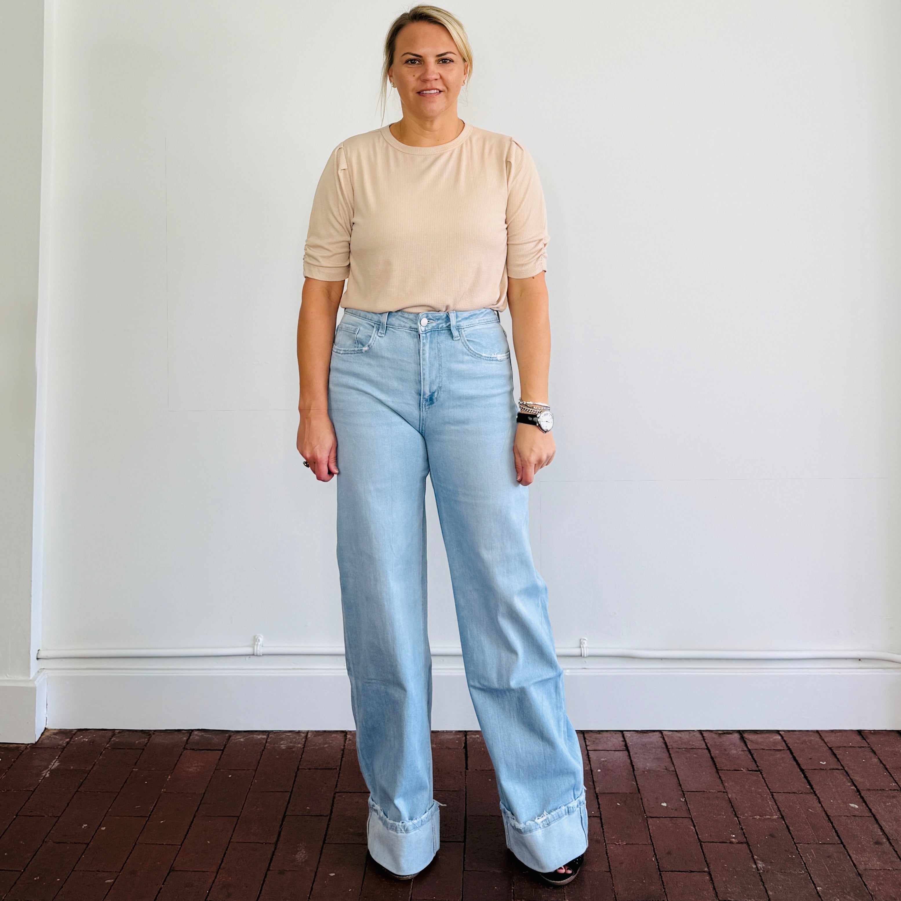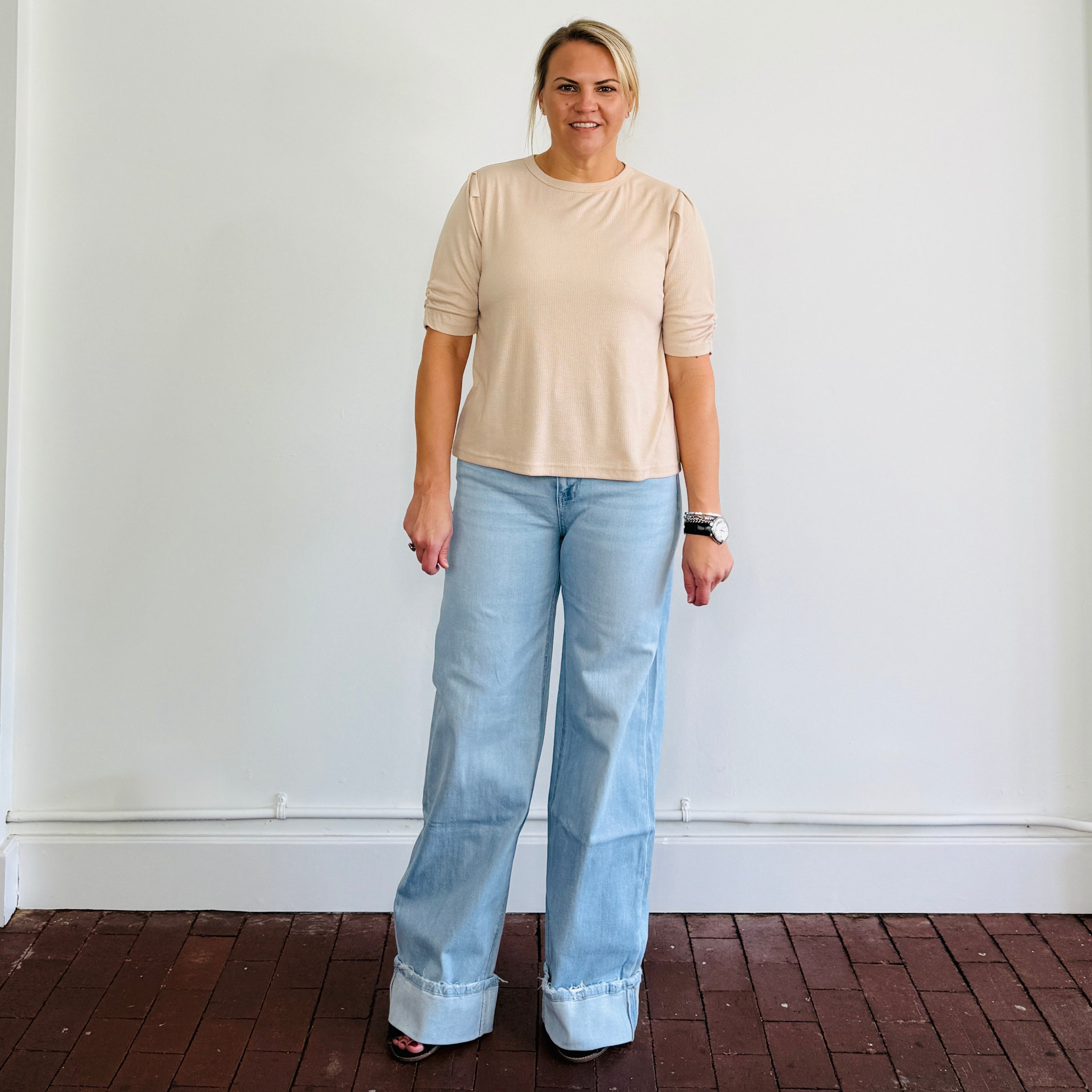 Short sleeve, textured knit puff sleeve top