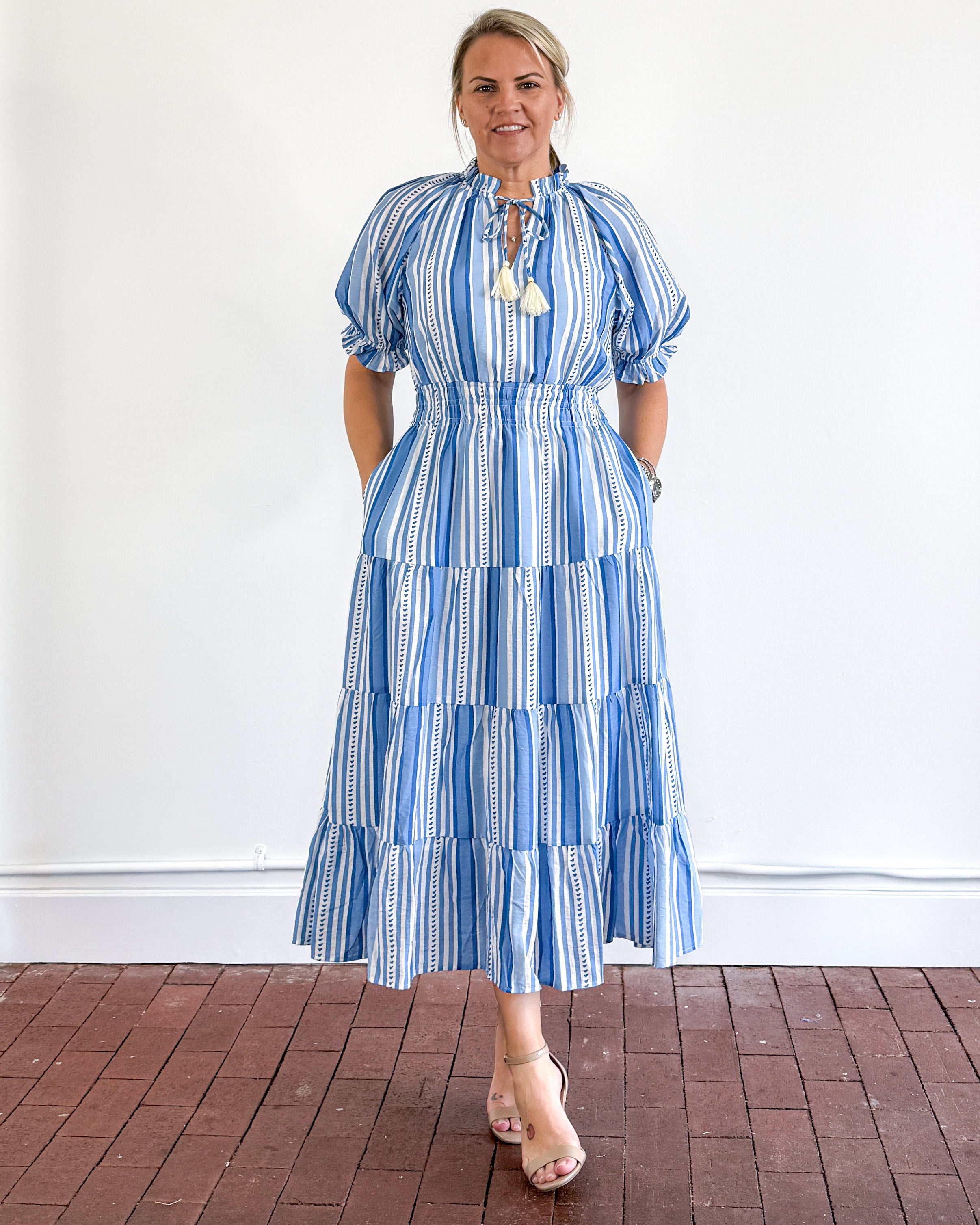 Striped midi dress with a smocked waist, tassel neck tie, & functioning side pockets. Lined.