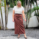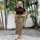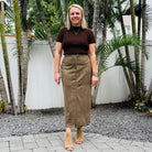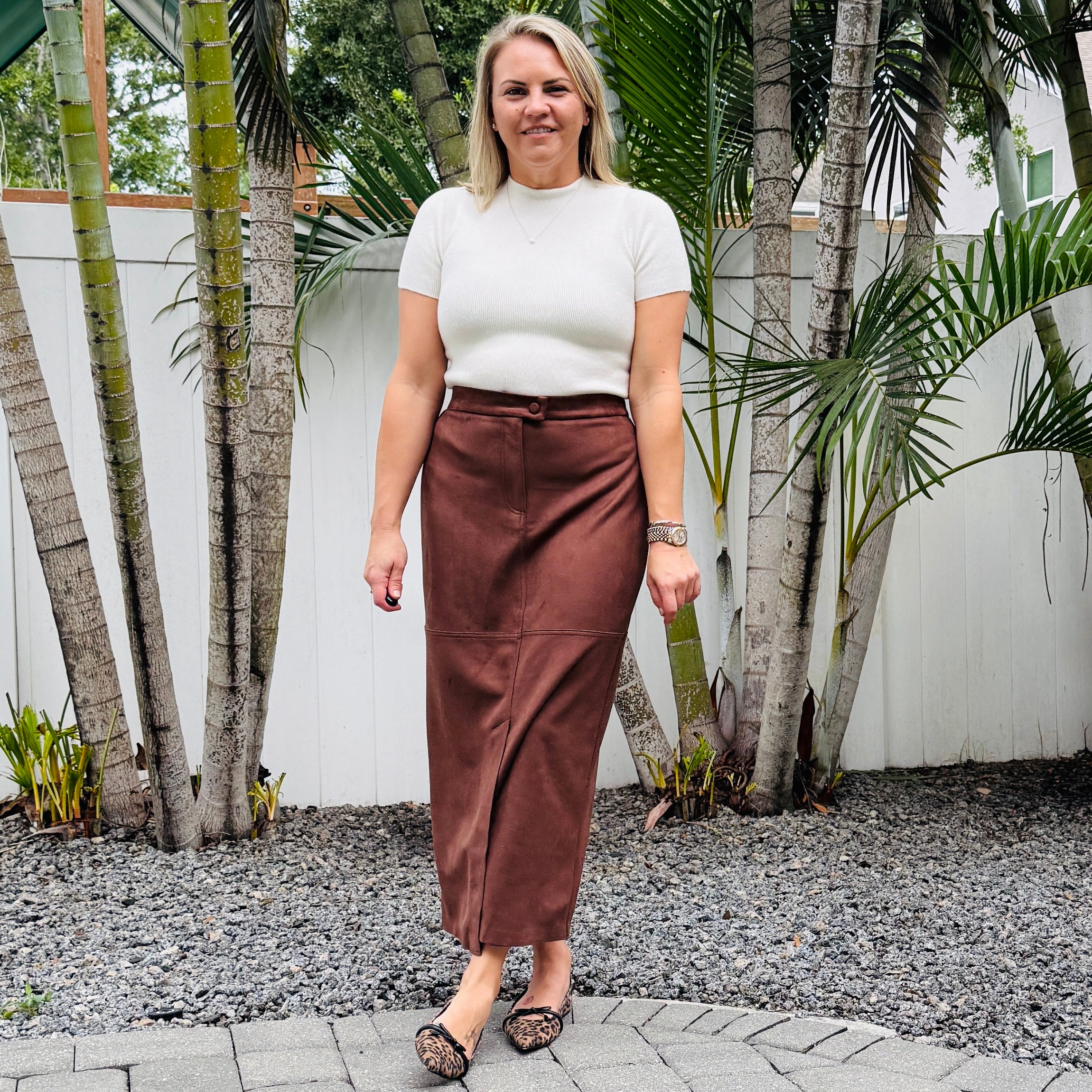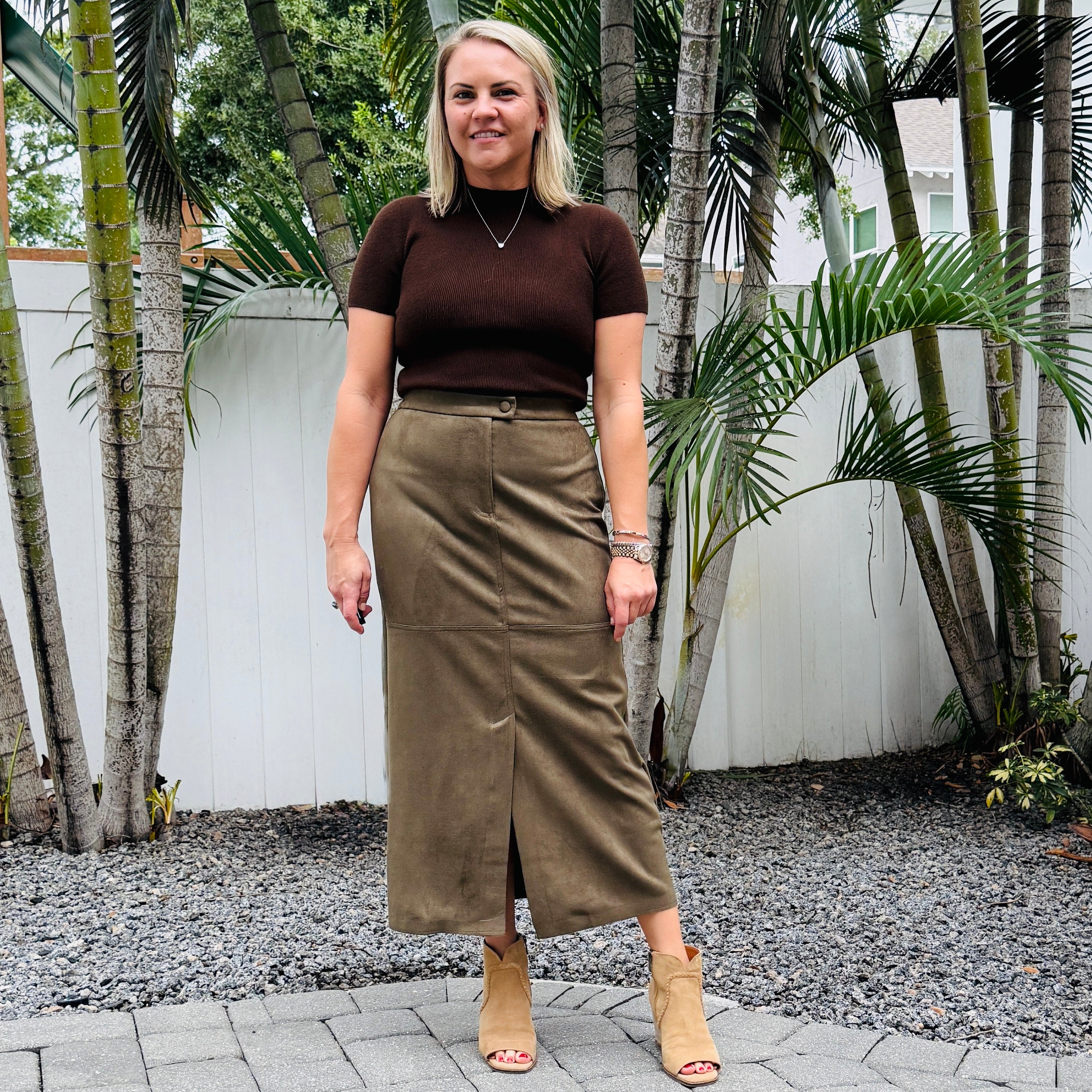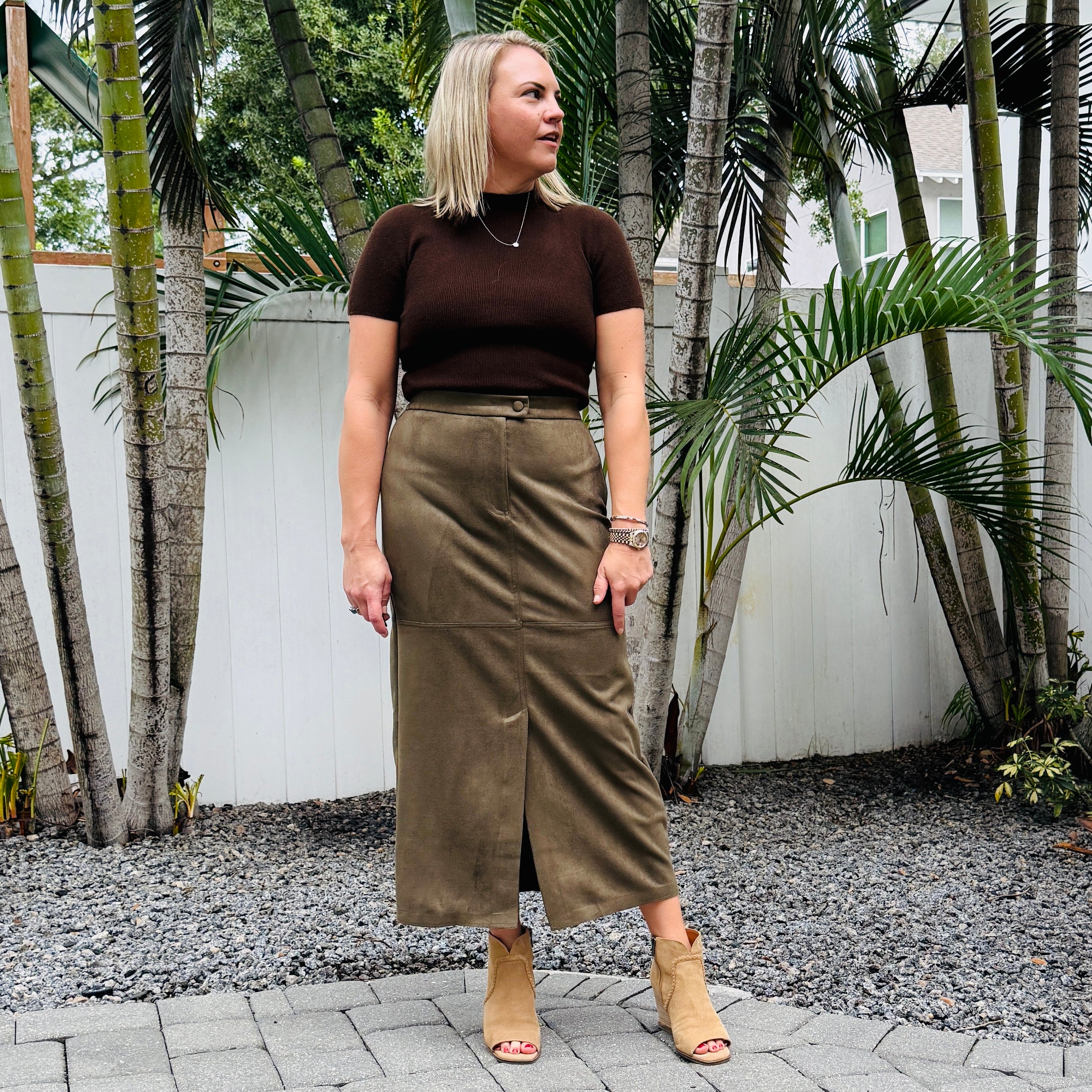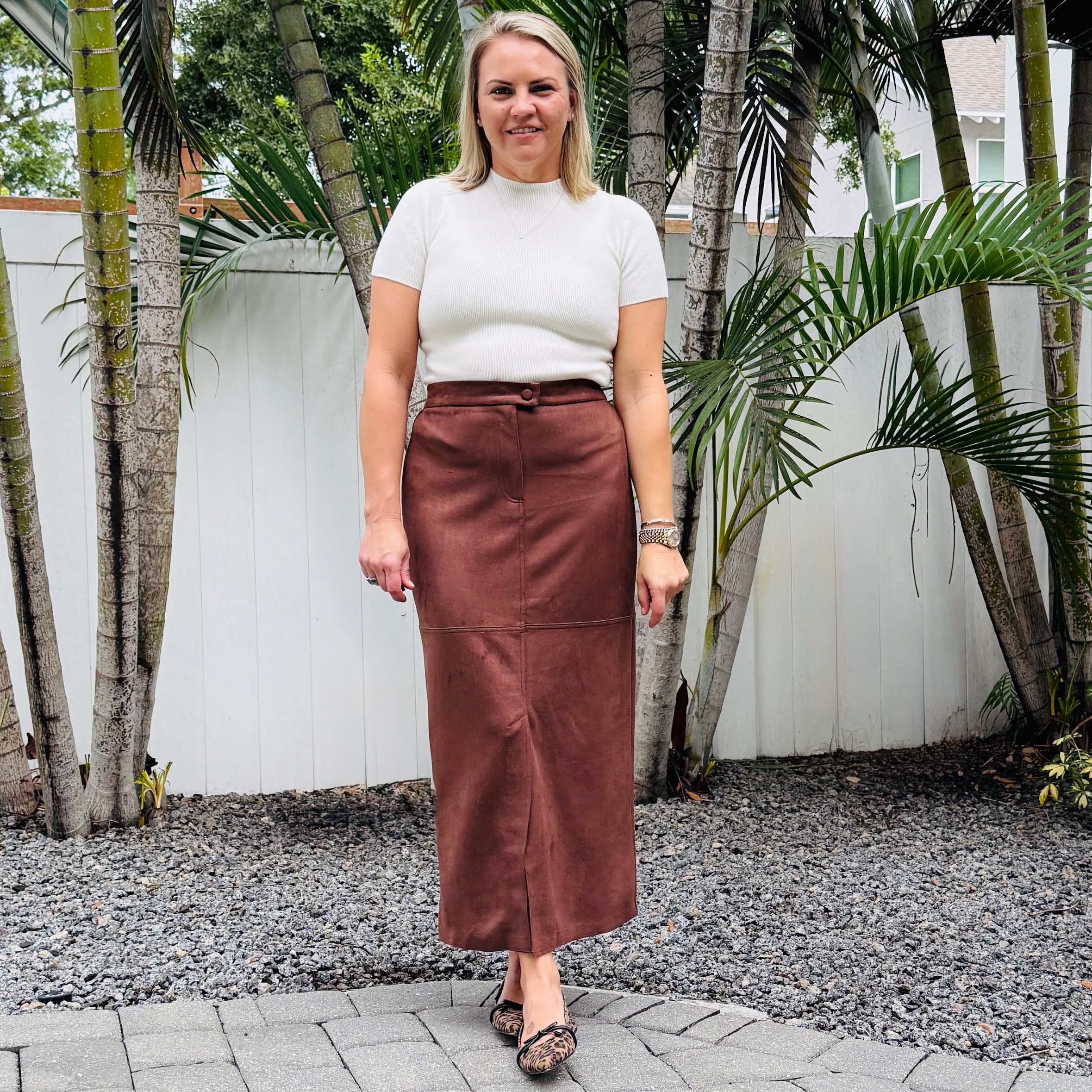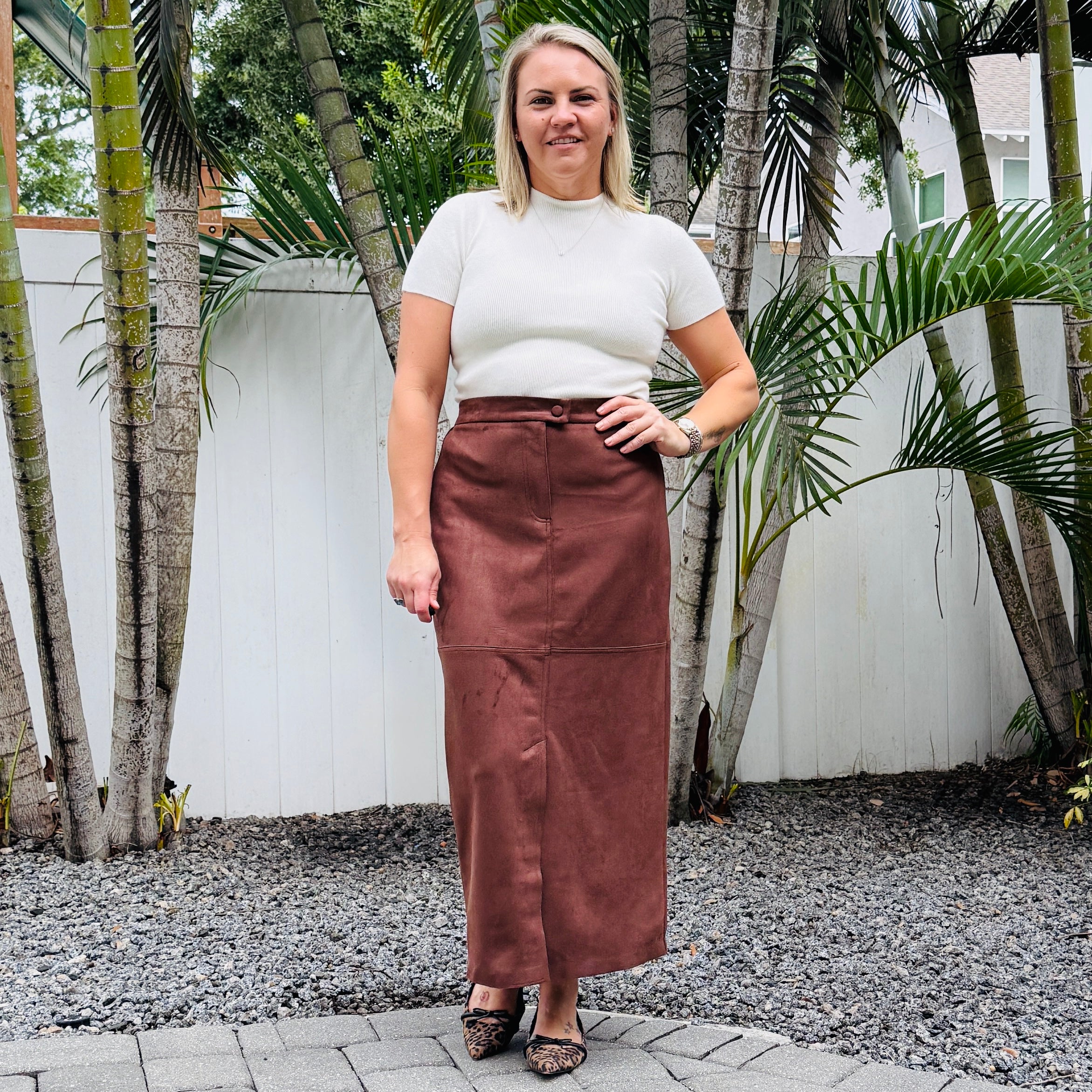 Ankle length faux suede maxi skirt. Button and zip front closure. Light weight & perfect for Florida Fall!