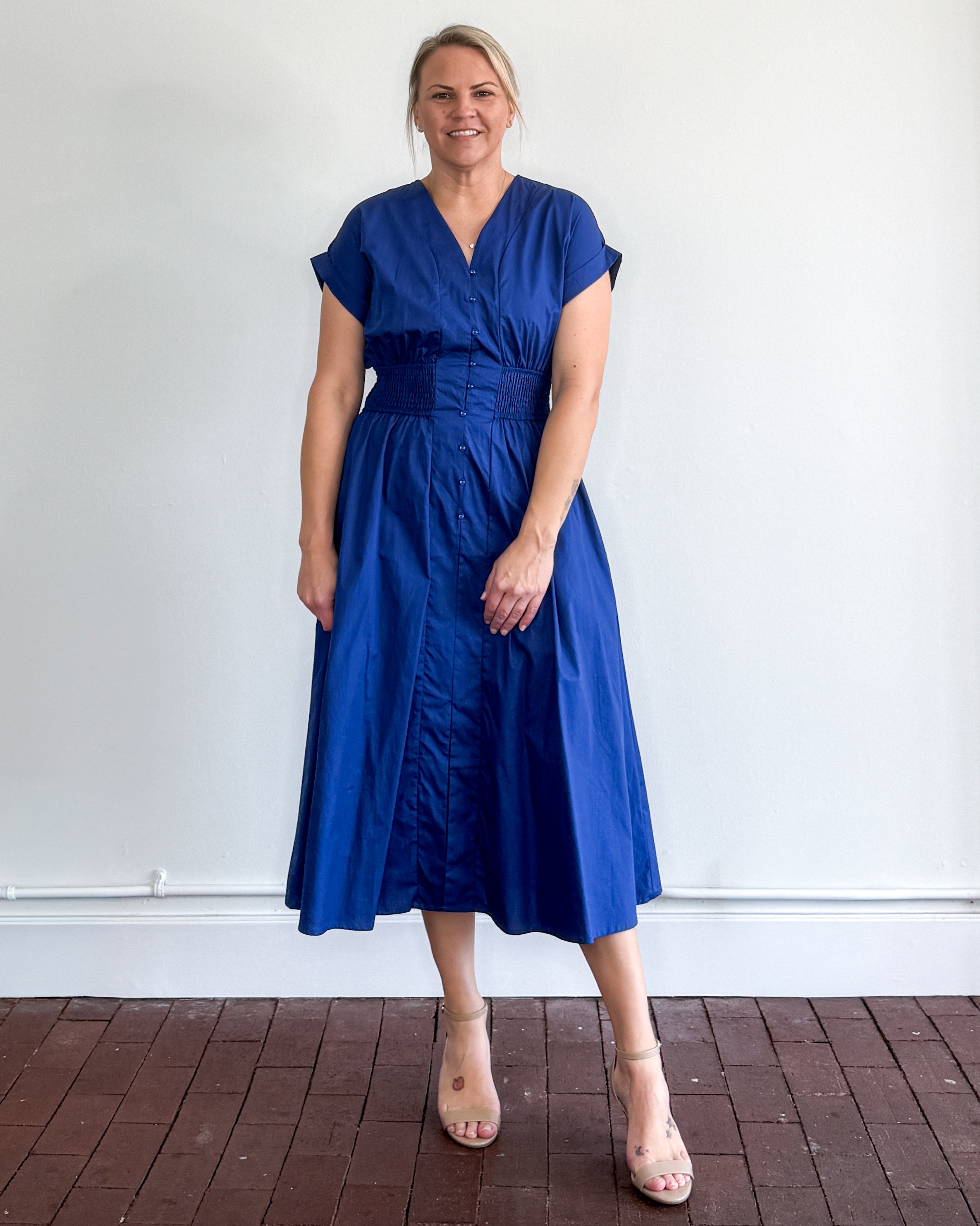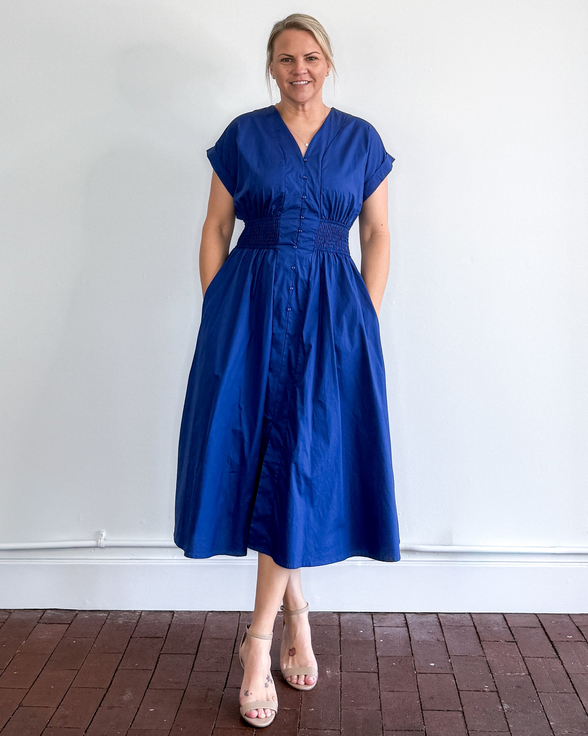 Drop shoulder smocked waist midi dress with pockets.
