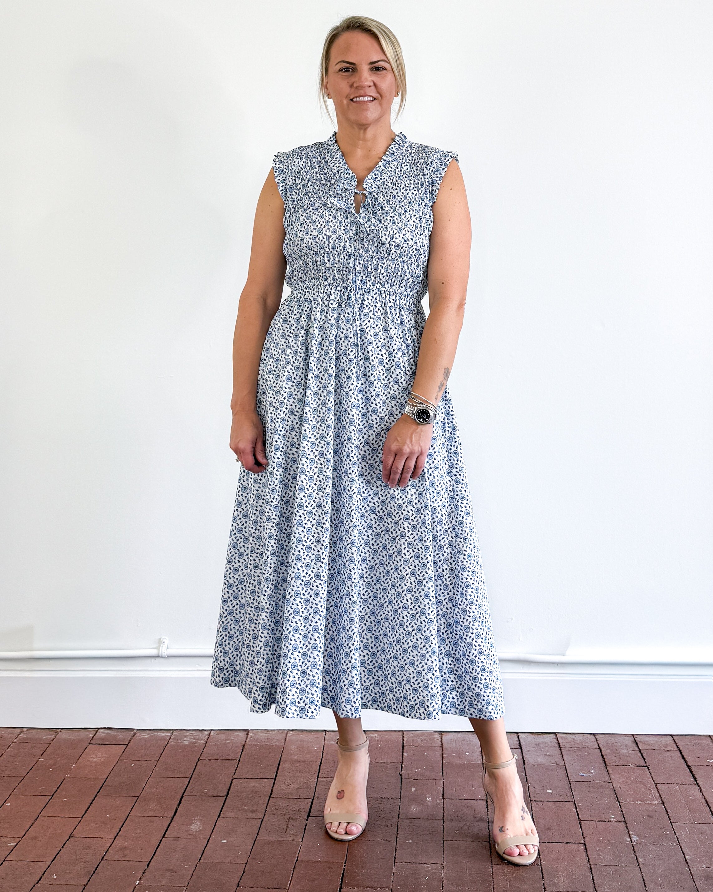 3 front tie smocked midi dress. Functioning side pockets. Lined.