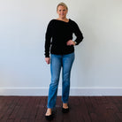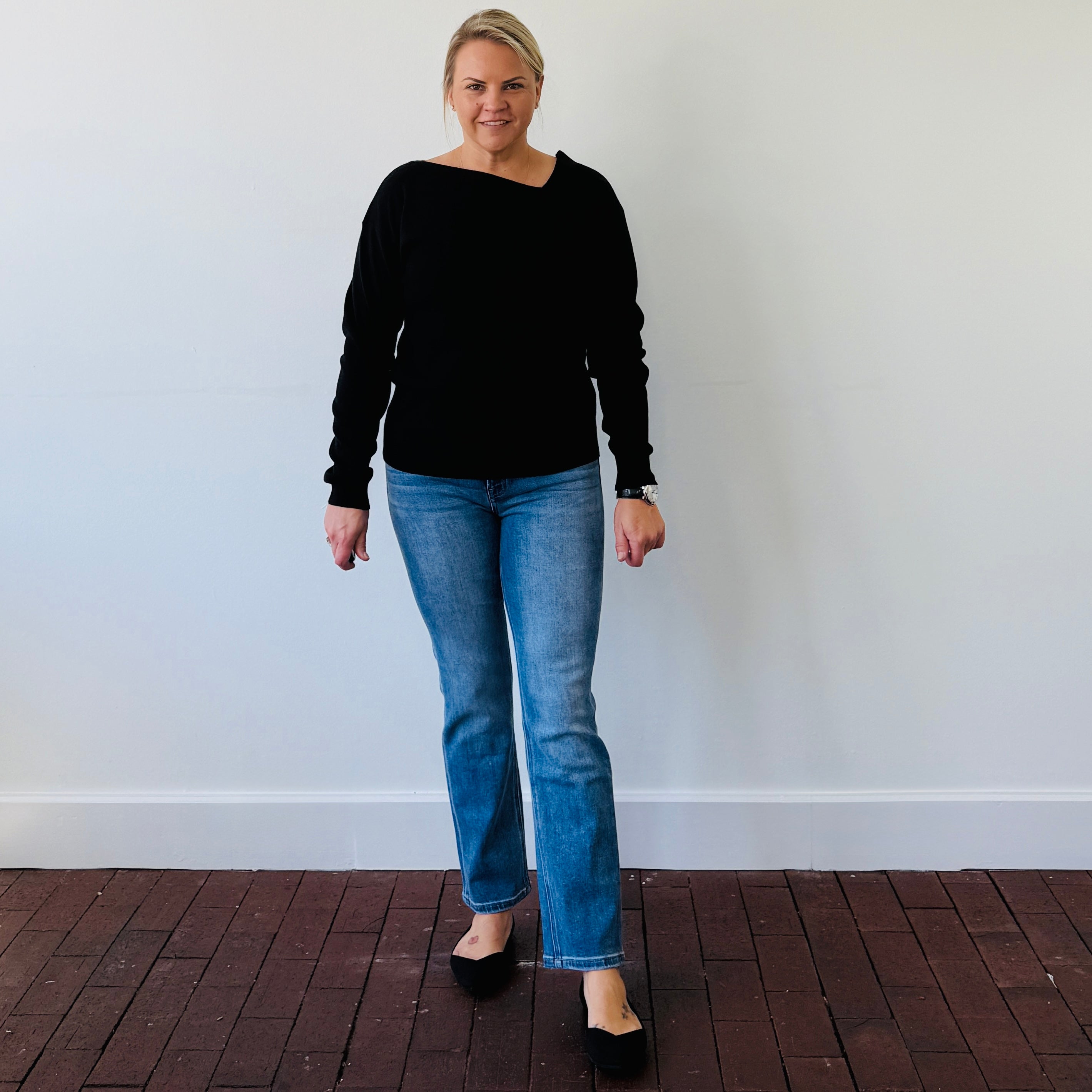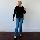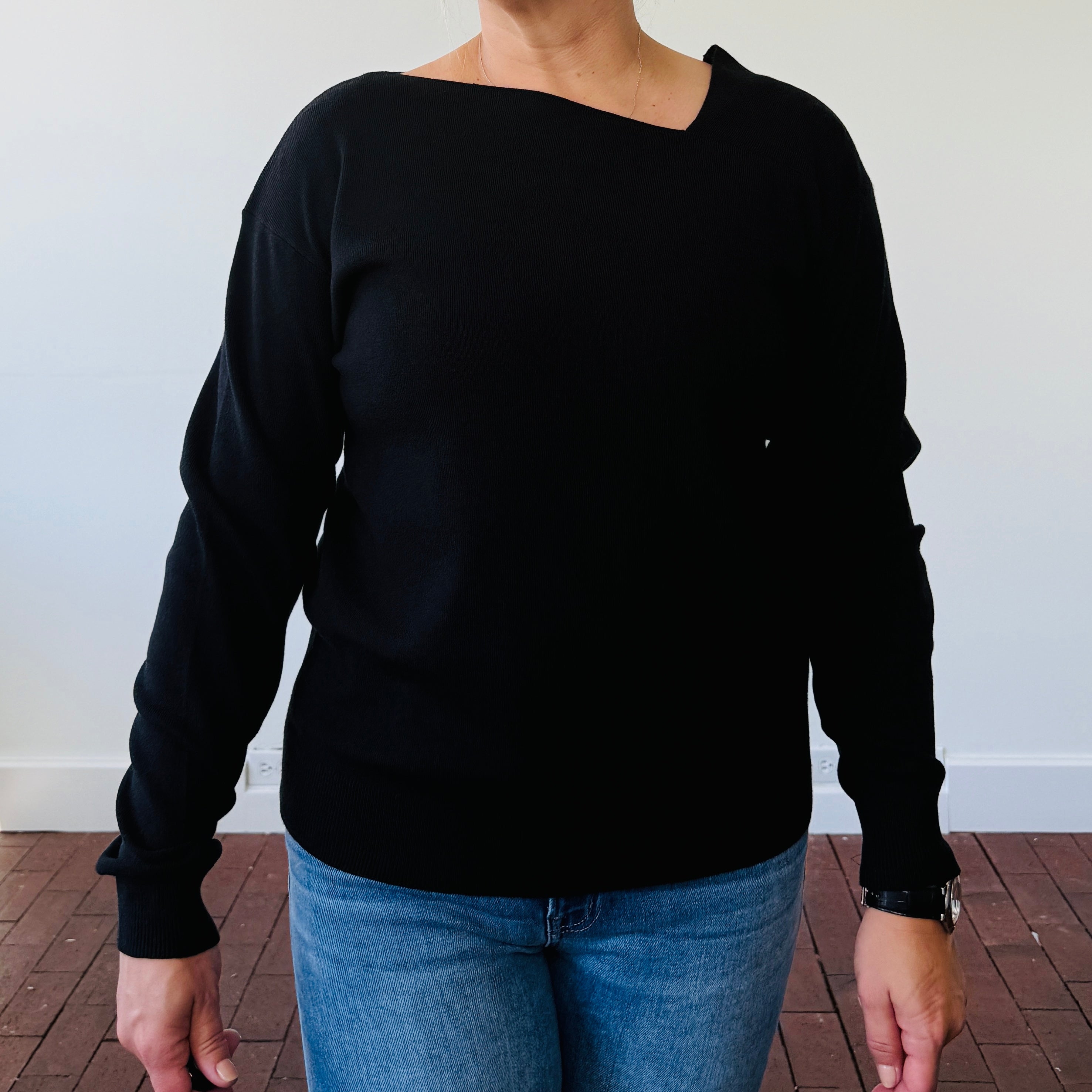 A twist on the classic black sweater, the Emery delivers just the right amount of edge with its asymmetric neckline and sleek silhouette.