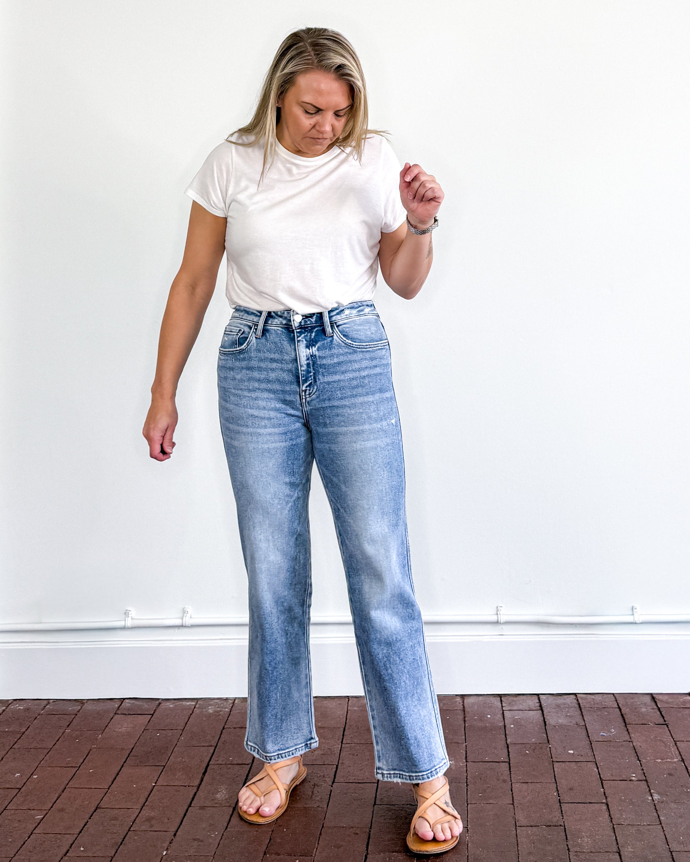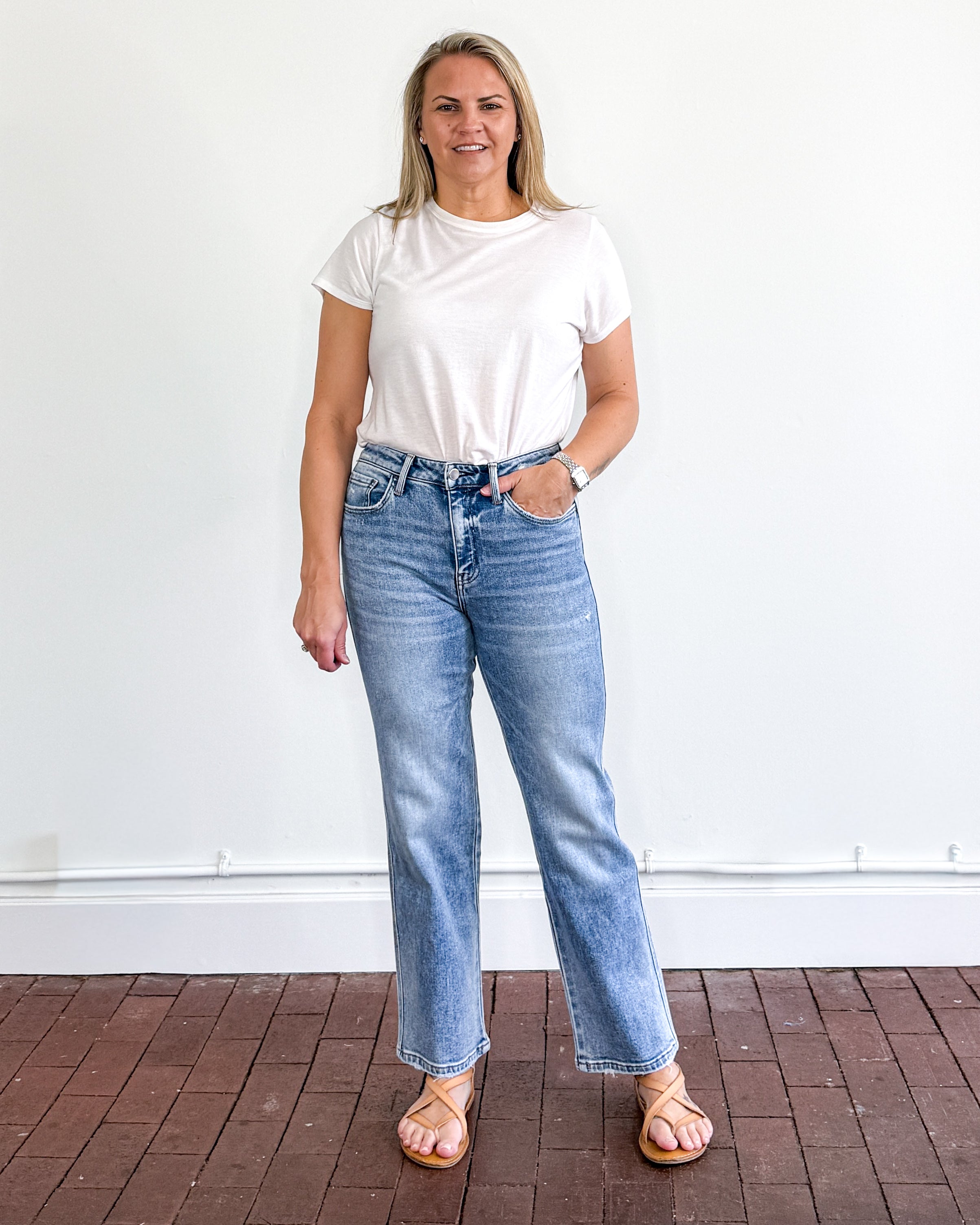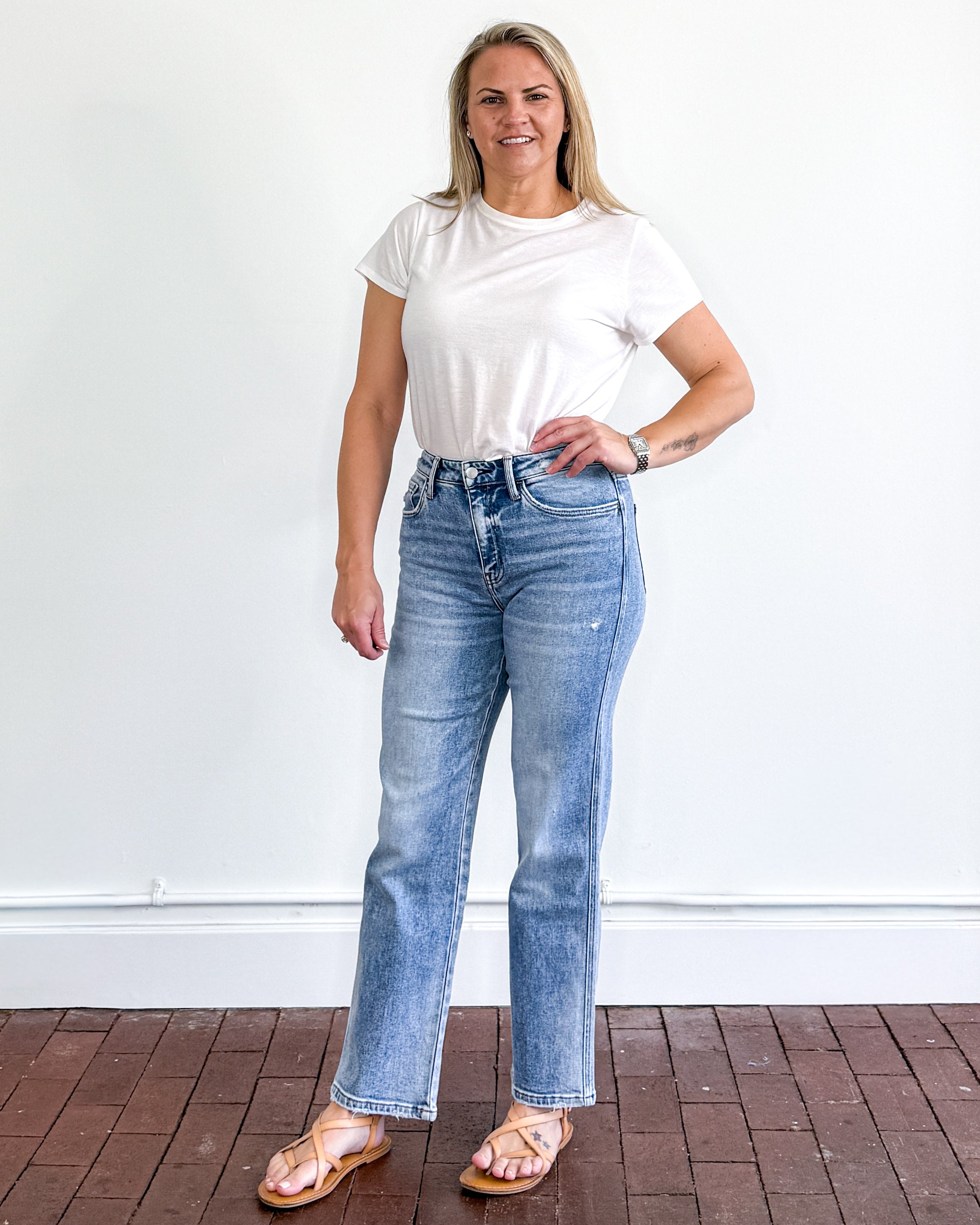 High rise, light wash ankle straight leg jeans. Comfort stretch denim & a finished hem.