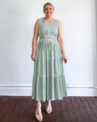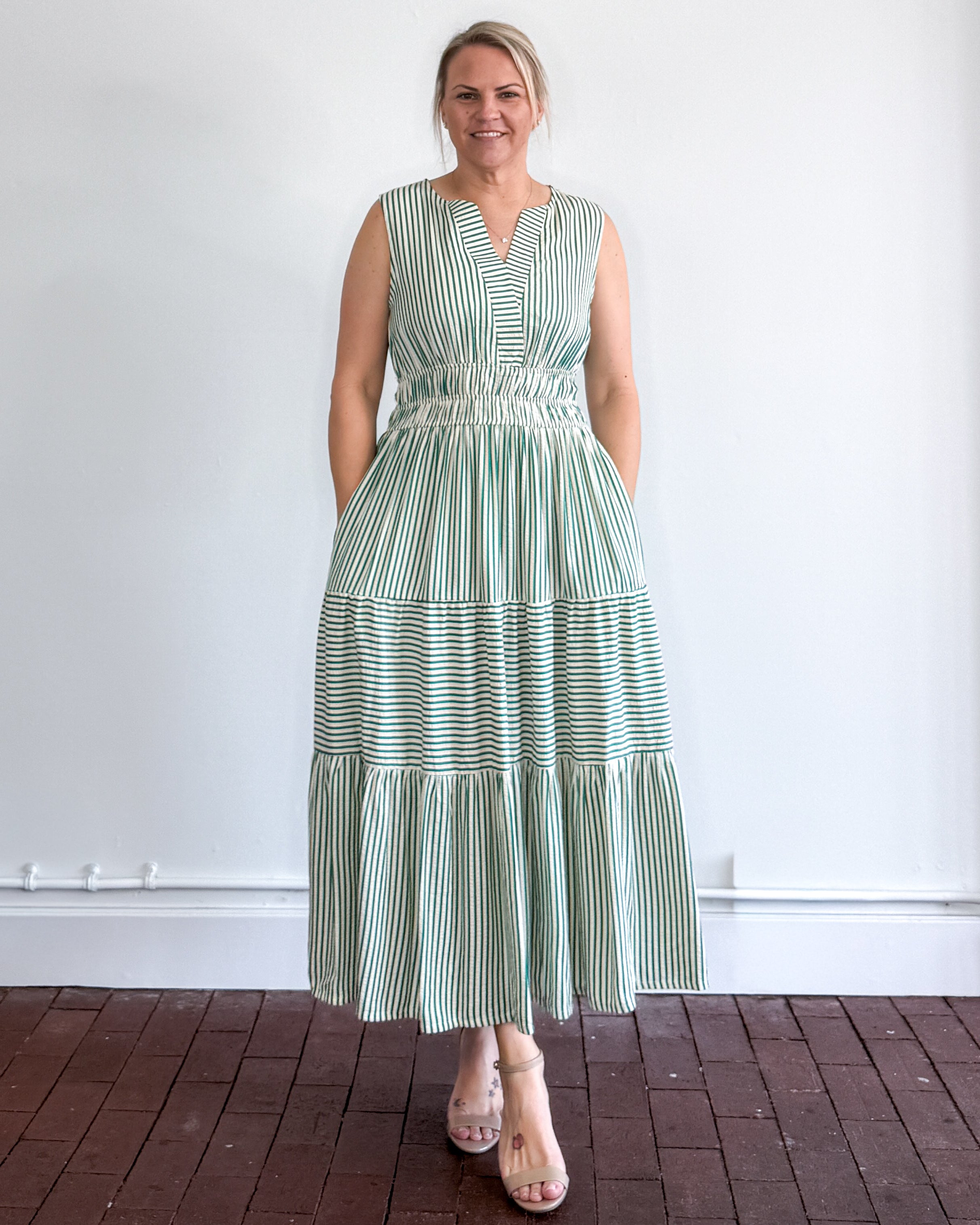 Sleeveless elastic waistband woven striped tiered midi dress with pockets.