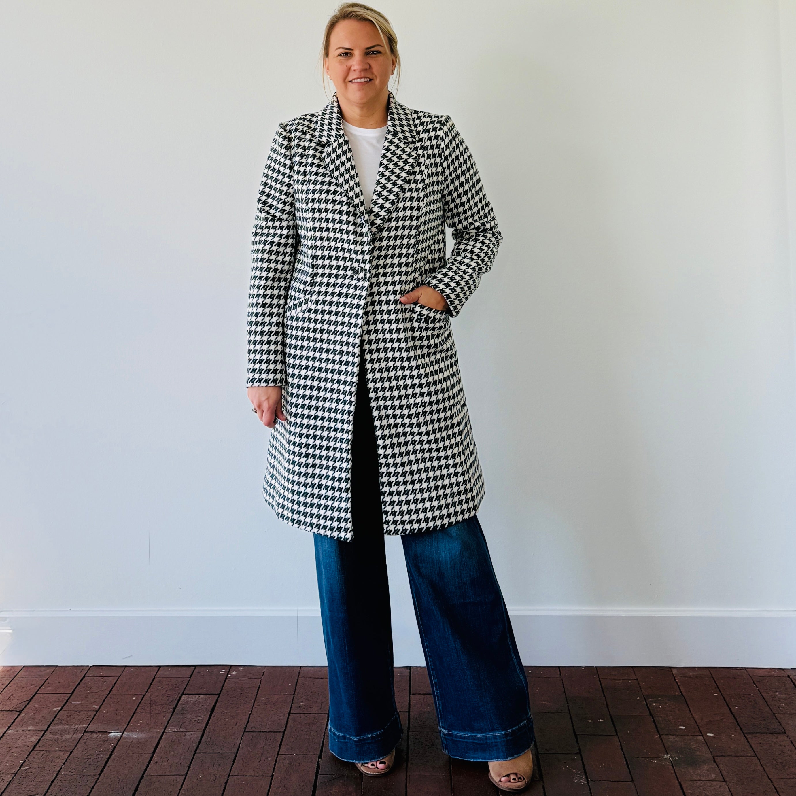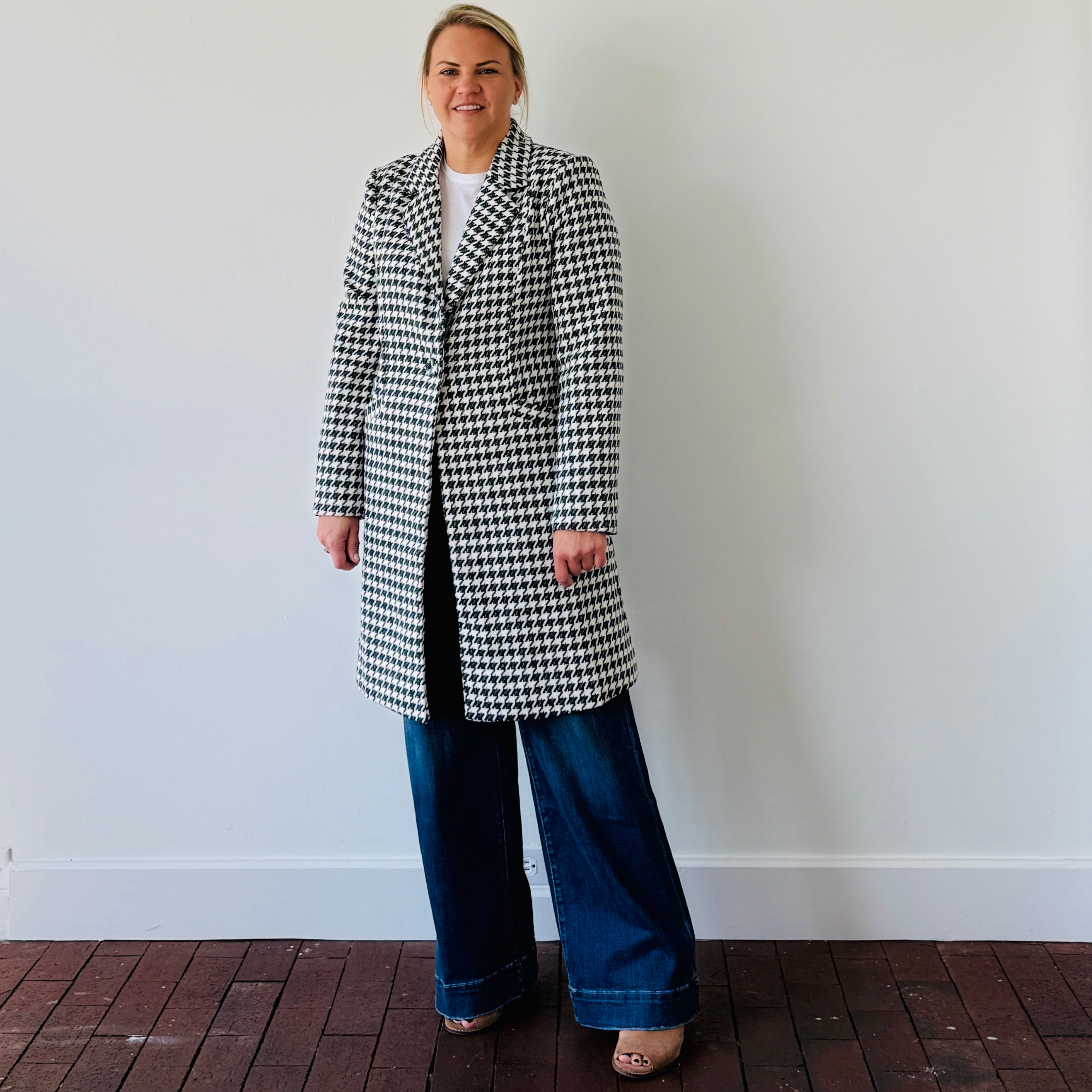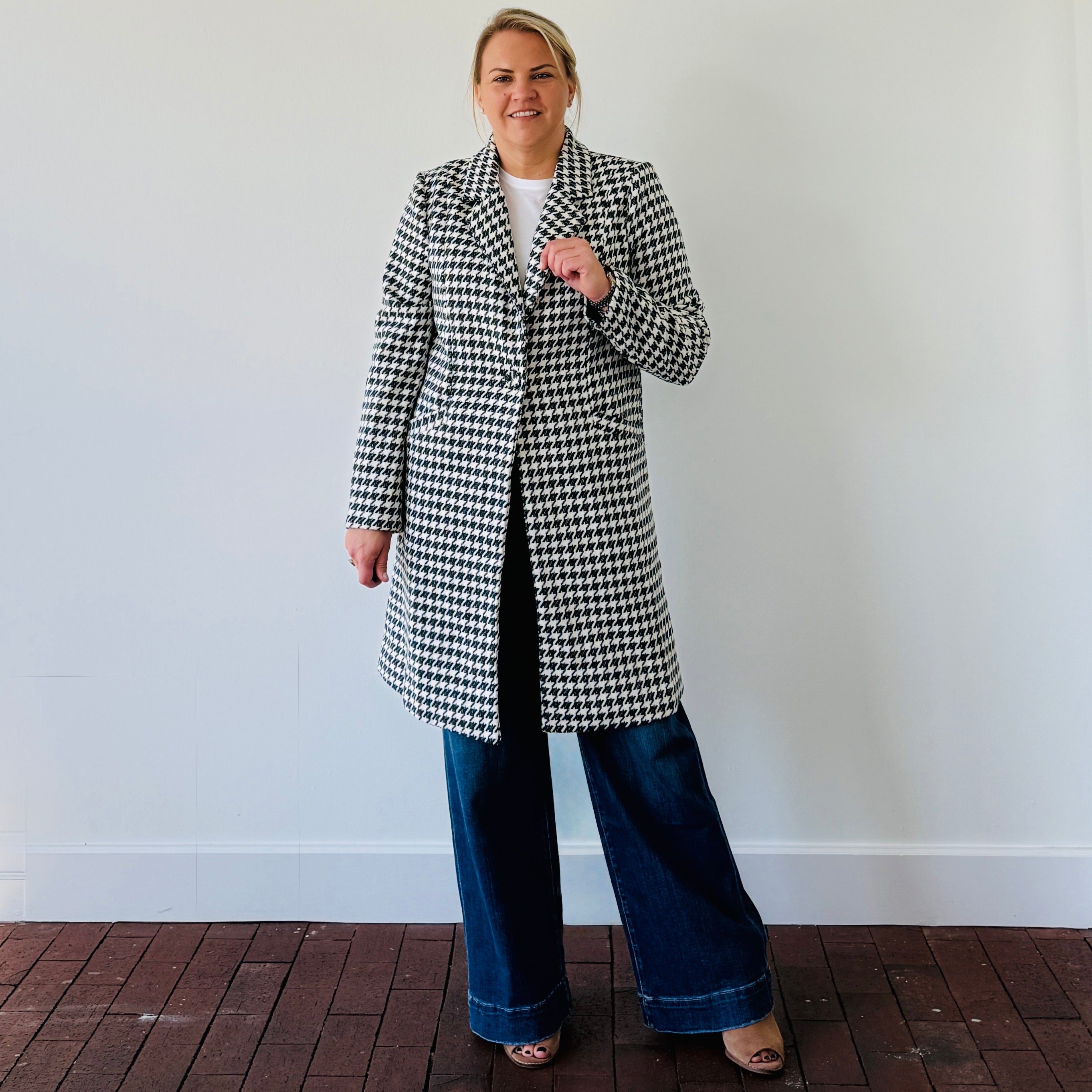 The statement coat your closet has been waiting for. The Hazel Coat features a bold green and ivory houndstooth print in a sleek, wear-anywhere silhouette.