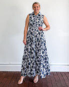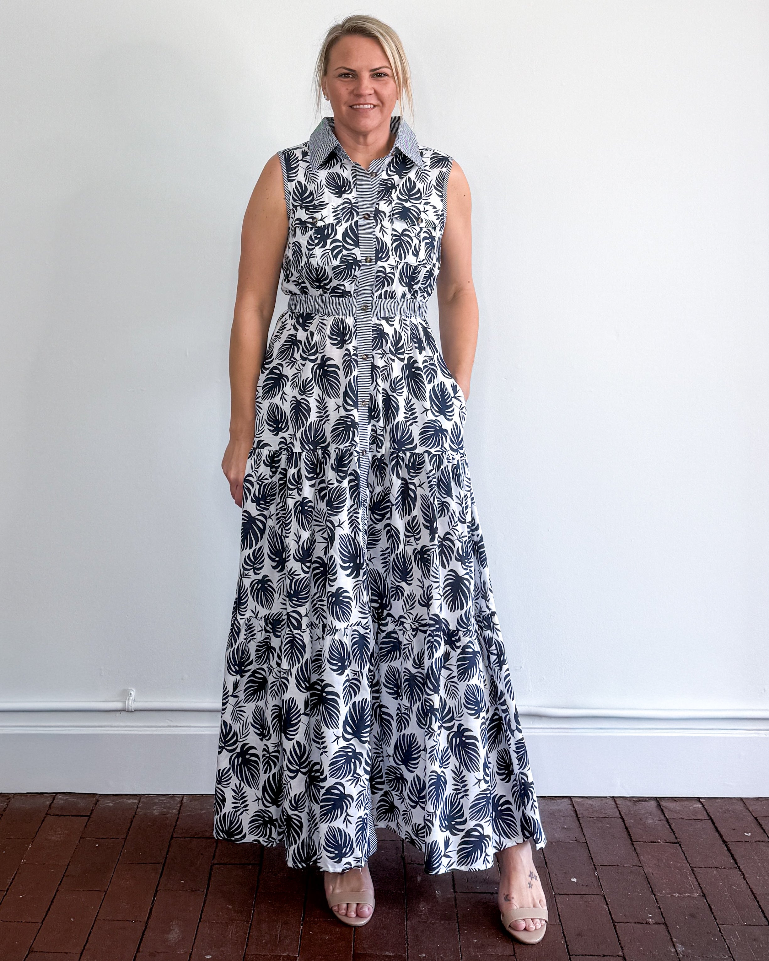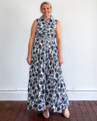 Sleeveless button down printed woven maxi shirt dress with contrast detail and pockets.