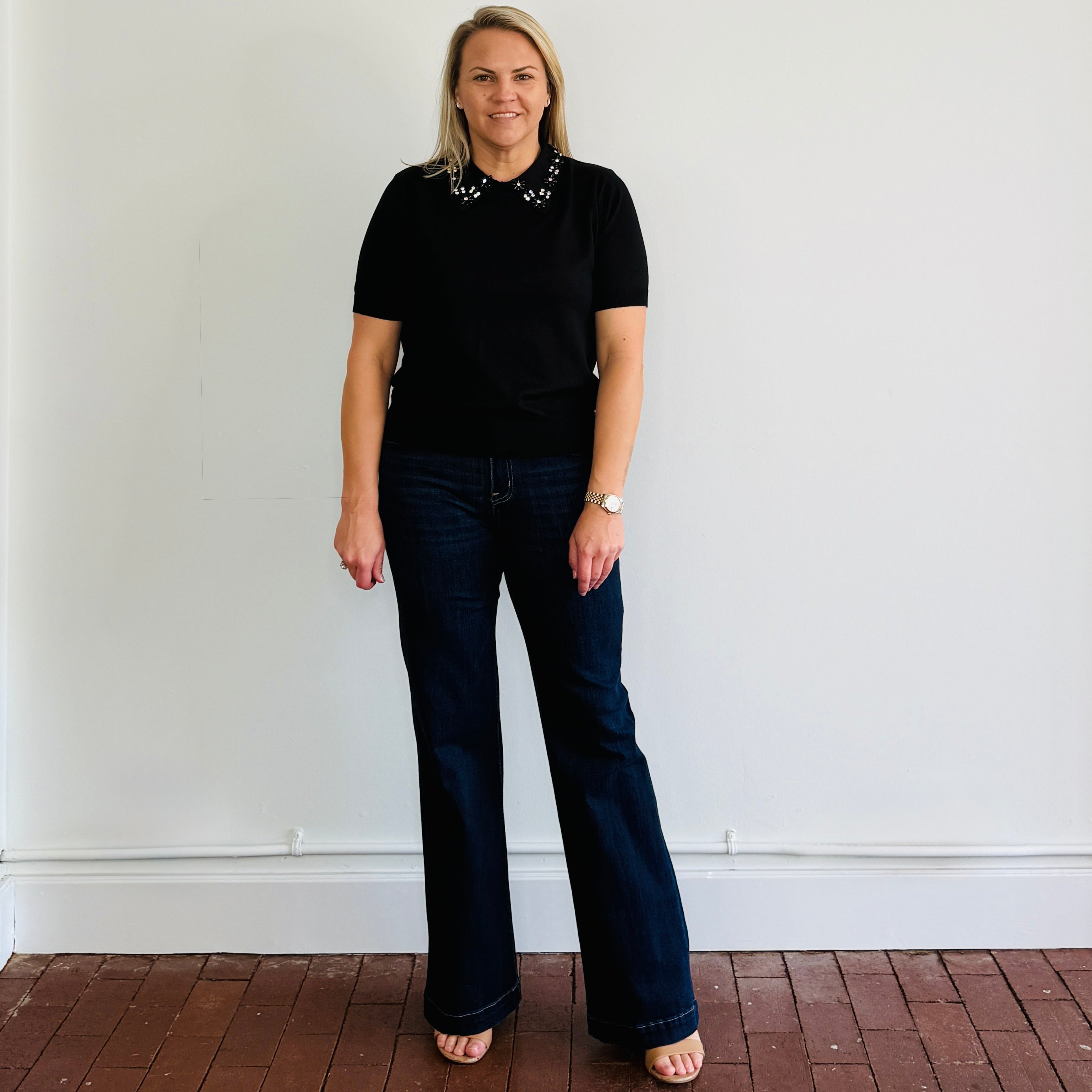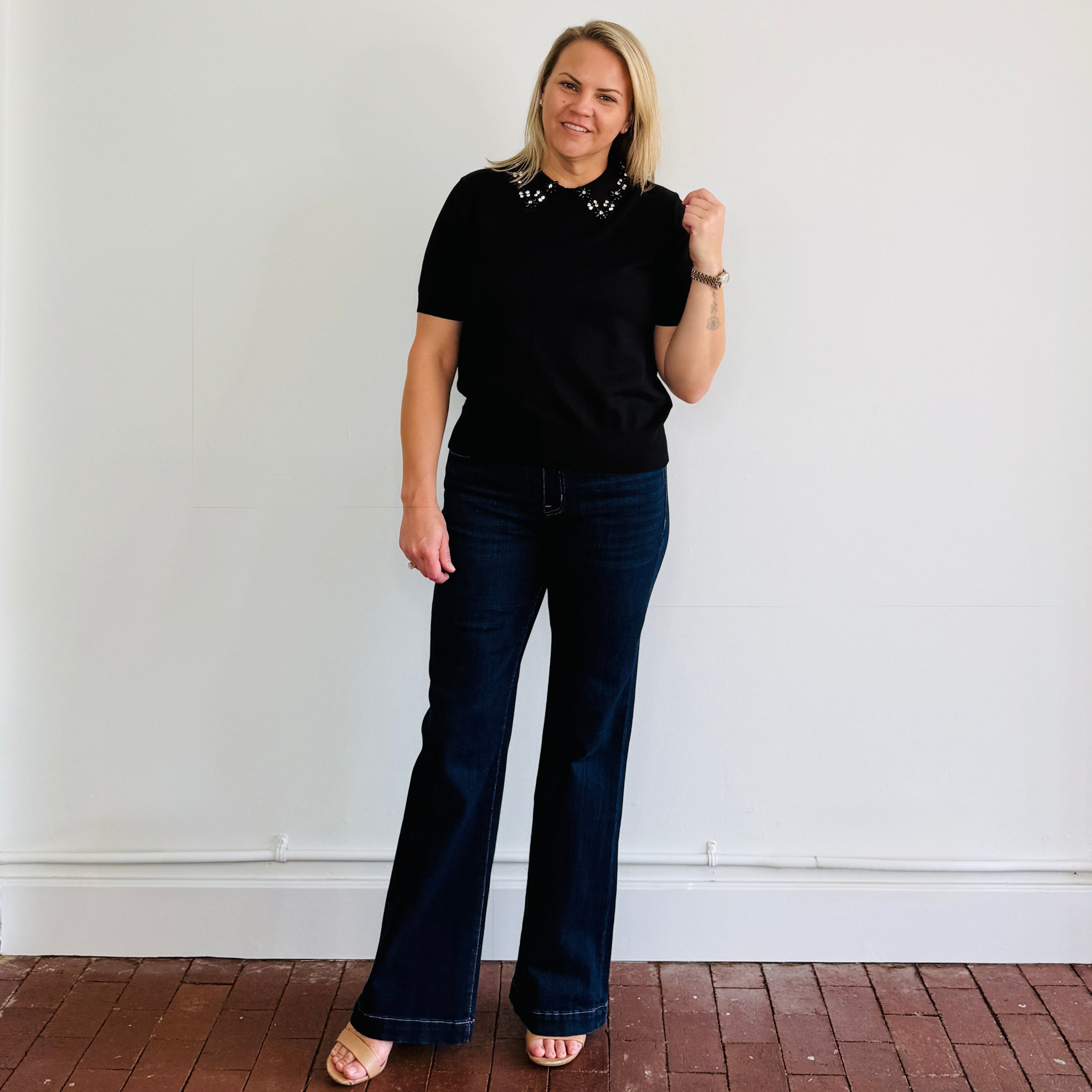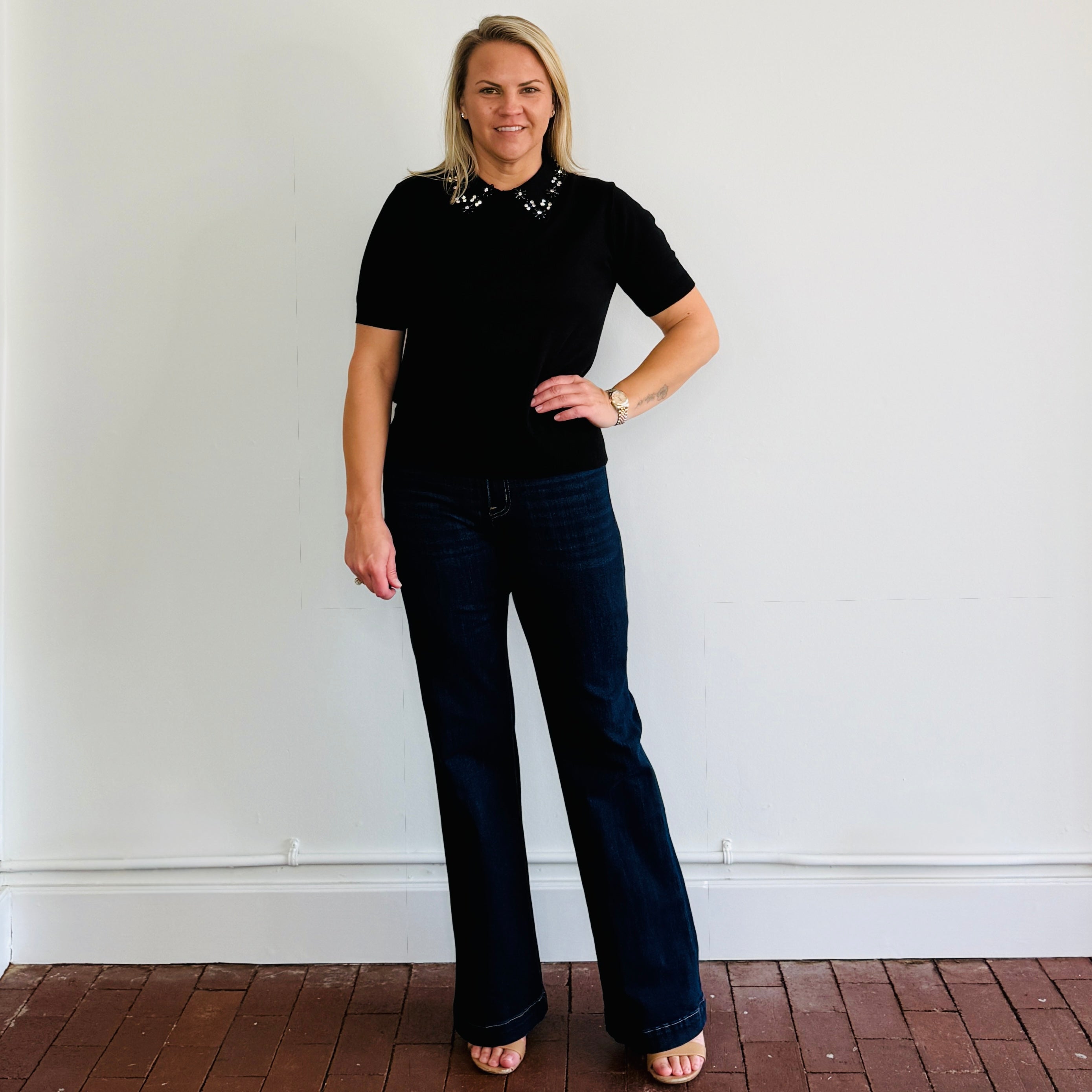 Style Tip: Tuck into dark denim or a mini skirt and let the collar do all the talking...no necklace needed.
