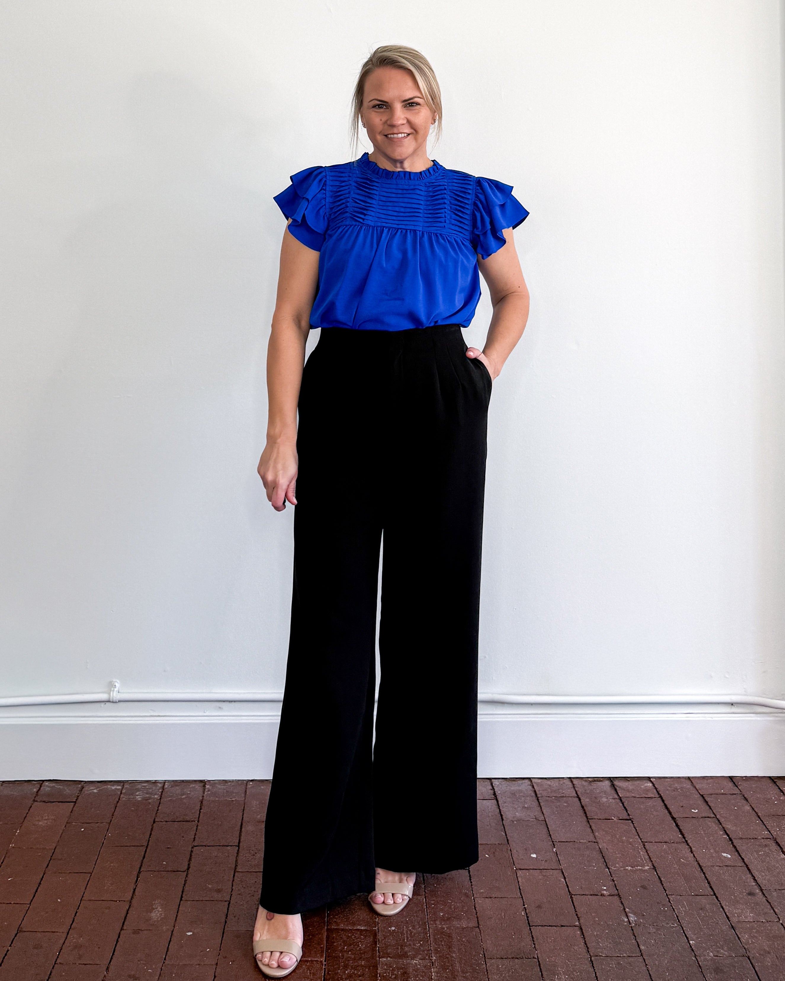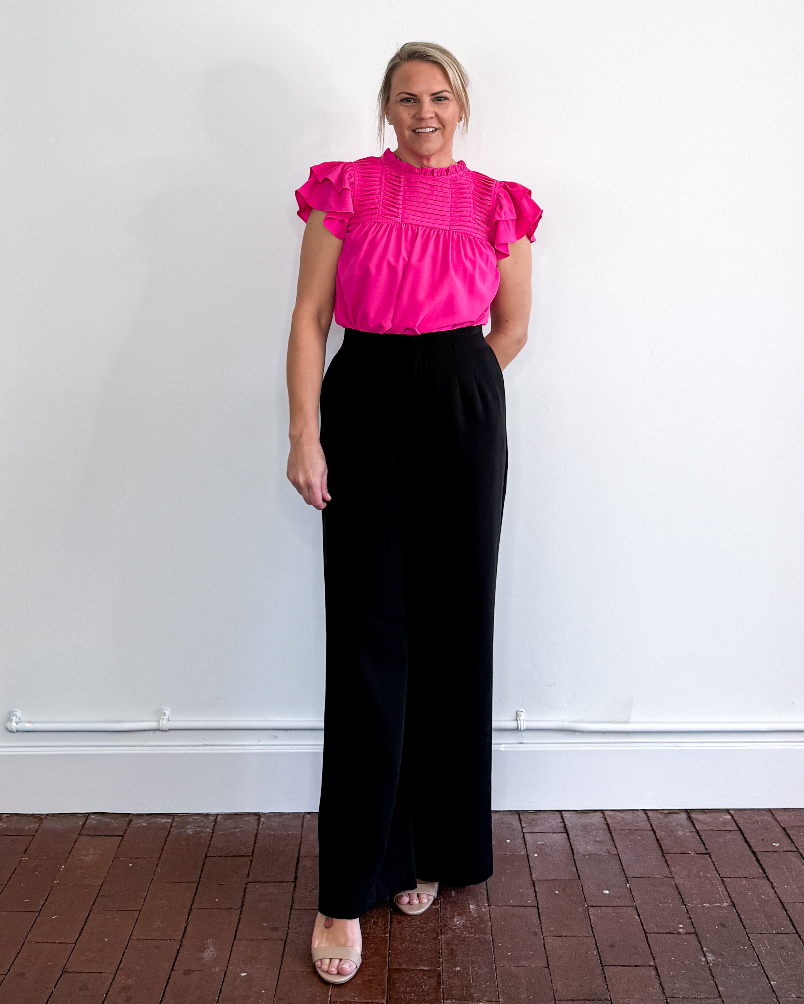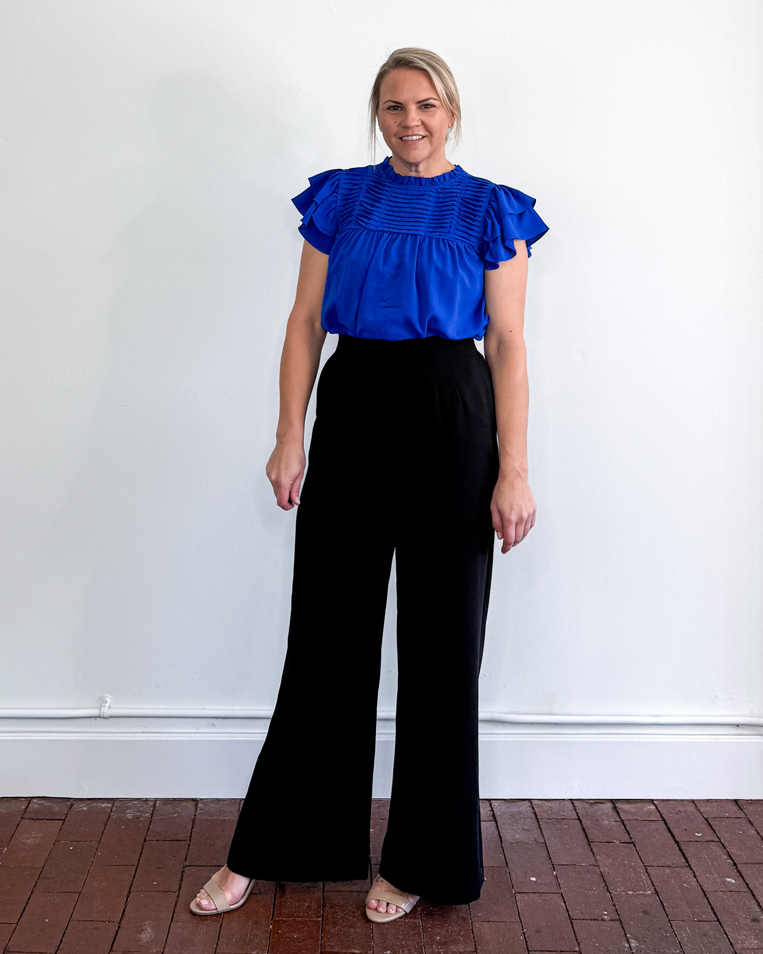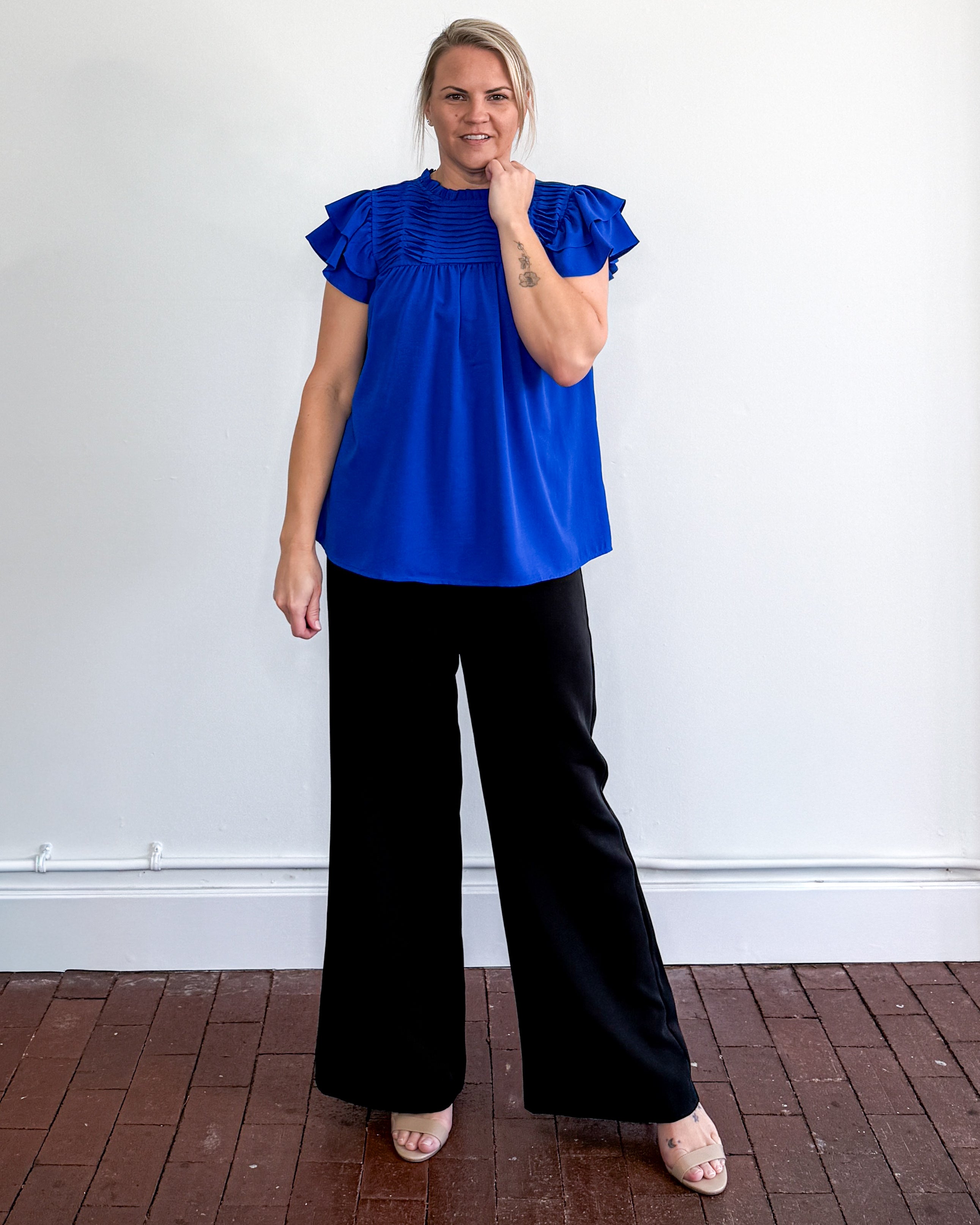 Ruffle sleeve pleated woven top. Single button closure at neck.