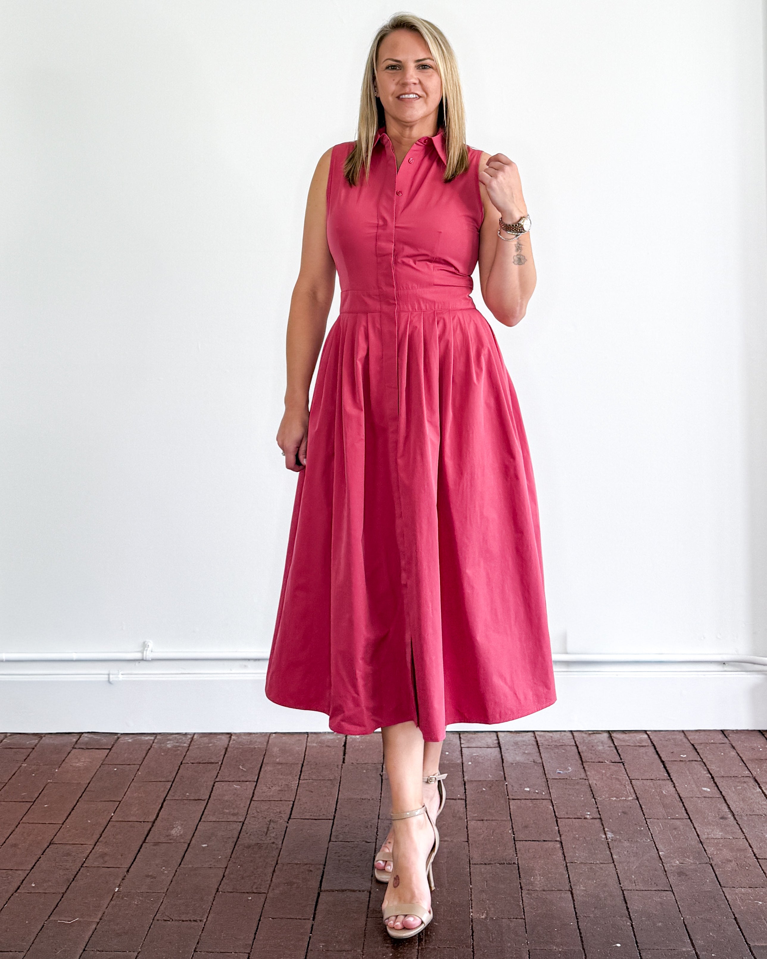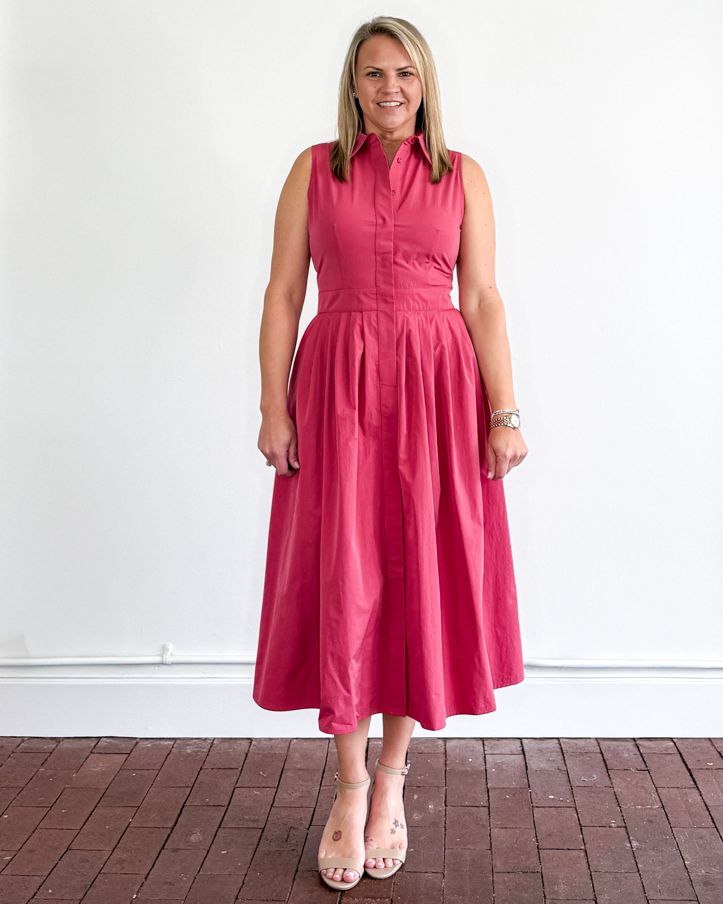 This is one of those dresses that instantly makes you feel put together. The classic shirt dress structure gives it a more elevated feel, while the fuller skirt keeps it feminine and easy to wear. The fabric has enough weight to hold its shape (no cling), which makes it a great option when you want something a little more polished without sacrificing comfort.