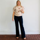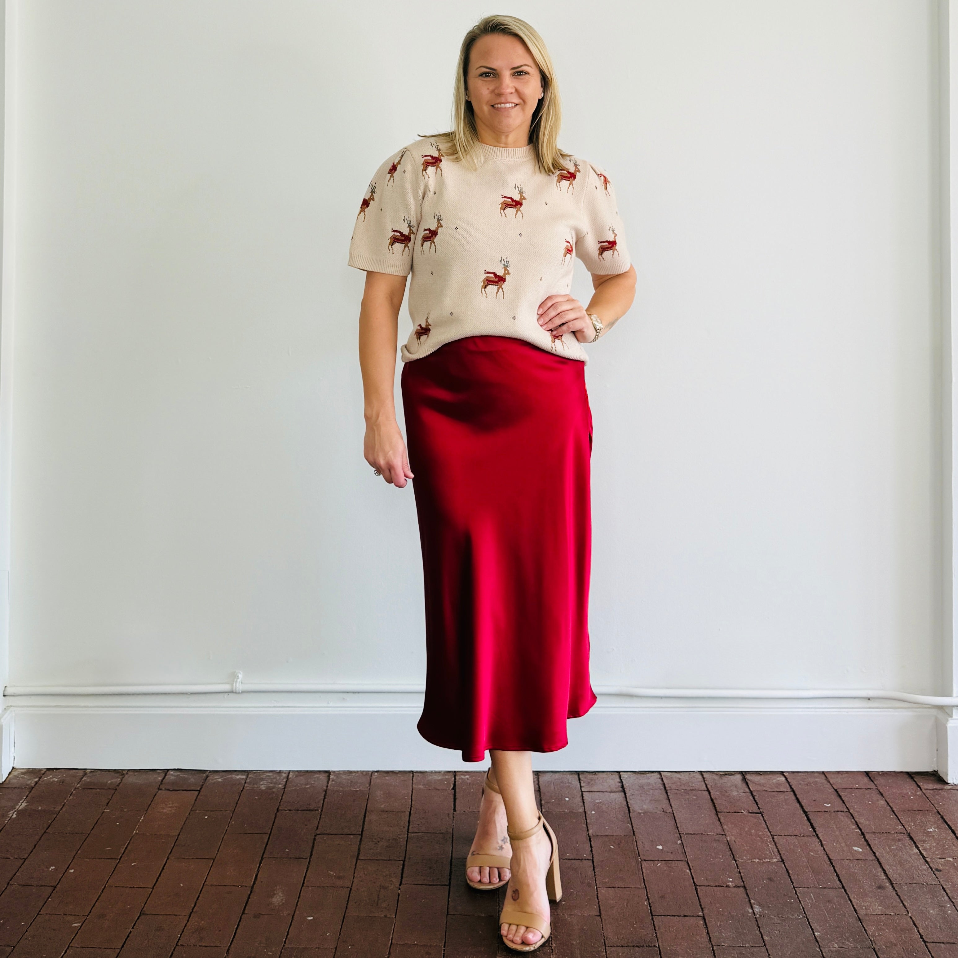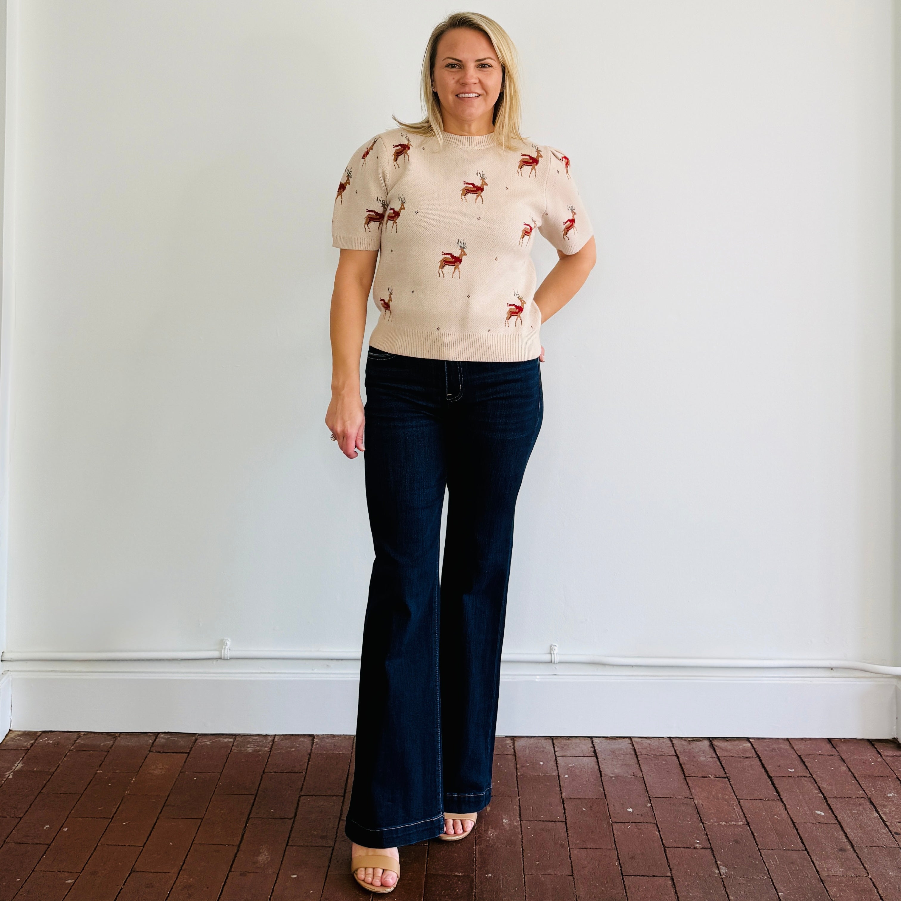 Short sleeve reindeer puff sleeve sweater. All over front & back print.
