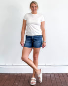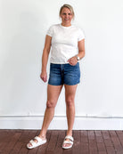 The Rowan Mid Rise Shorts deliver classic style in a sleek dark denim. Designed with a comfortable mid-rise fit and zero distressing for a polished look, these shorts transition seamlessly from casual to slightly elevated. The premium fabric blend of 83% cotton, 16% polyester, and 1% elastane ensures durability and a gentle stretch for all-day wearability.