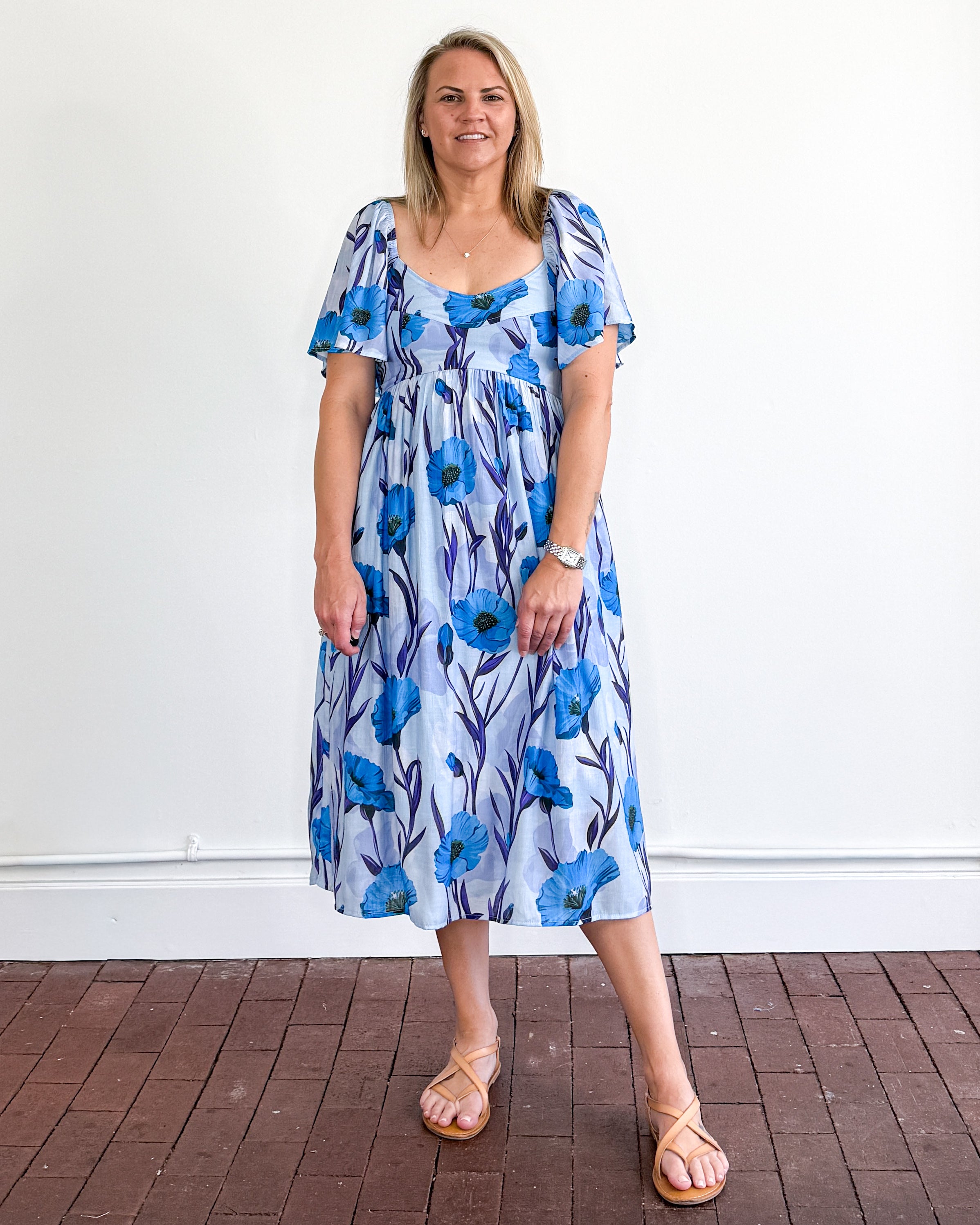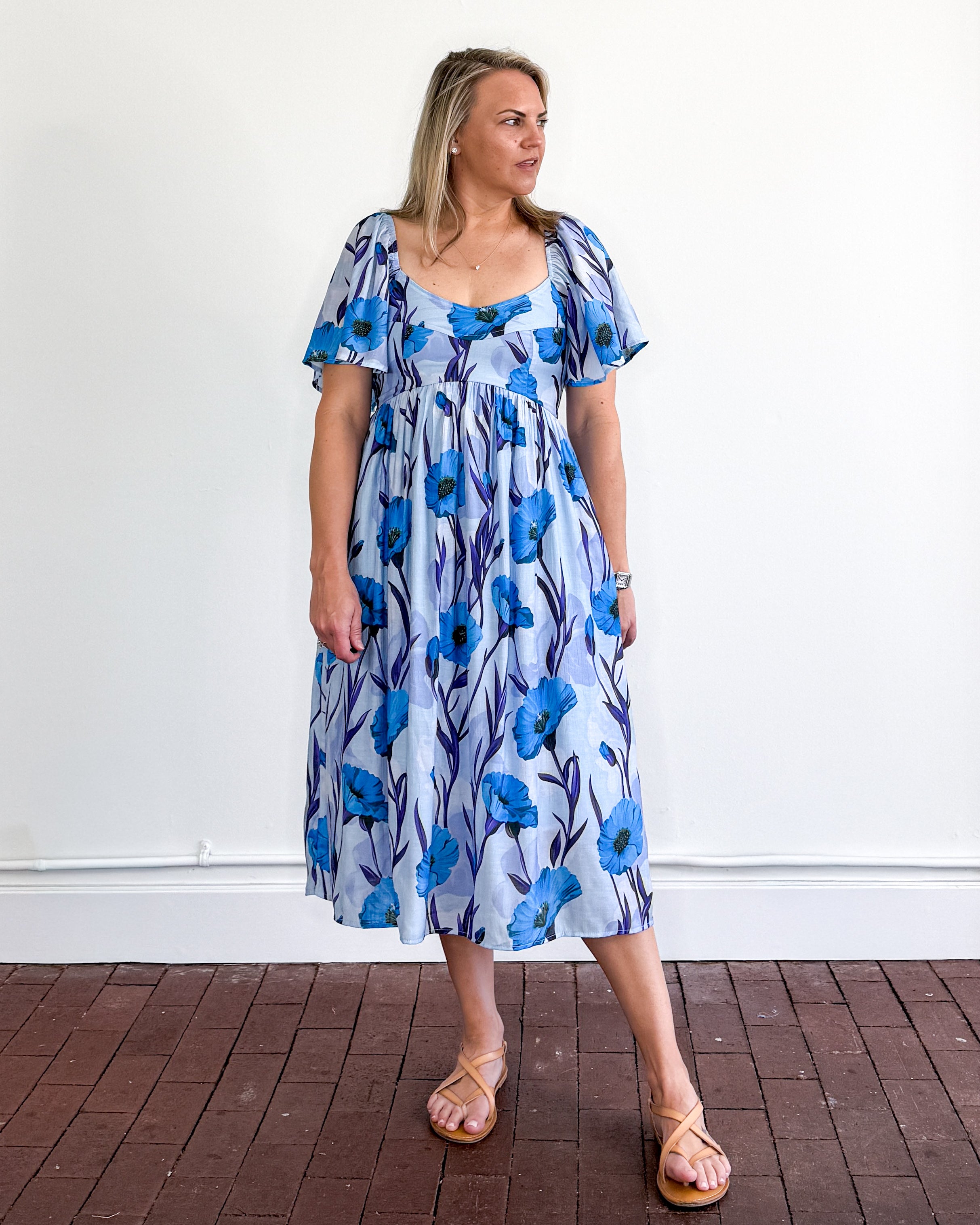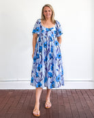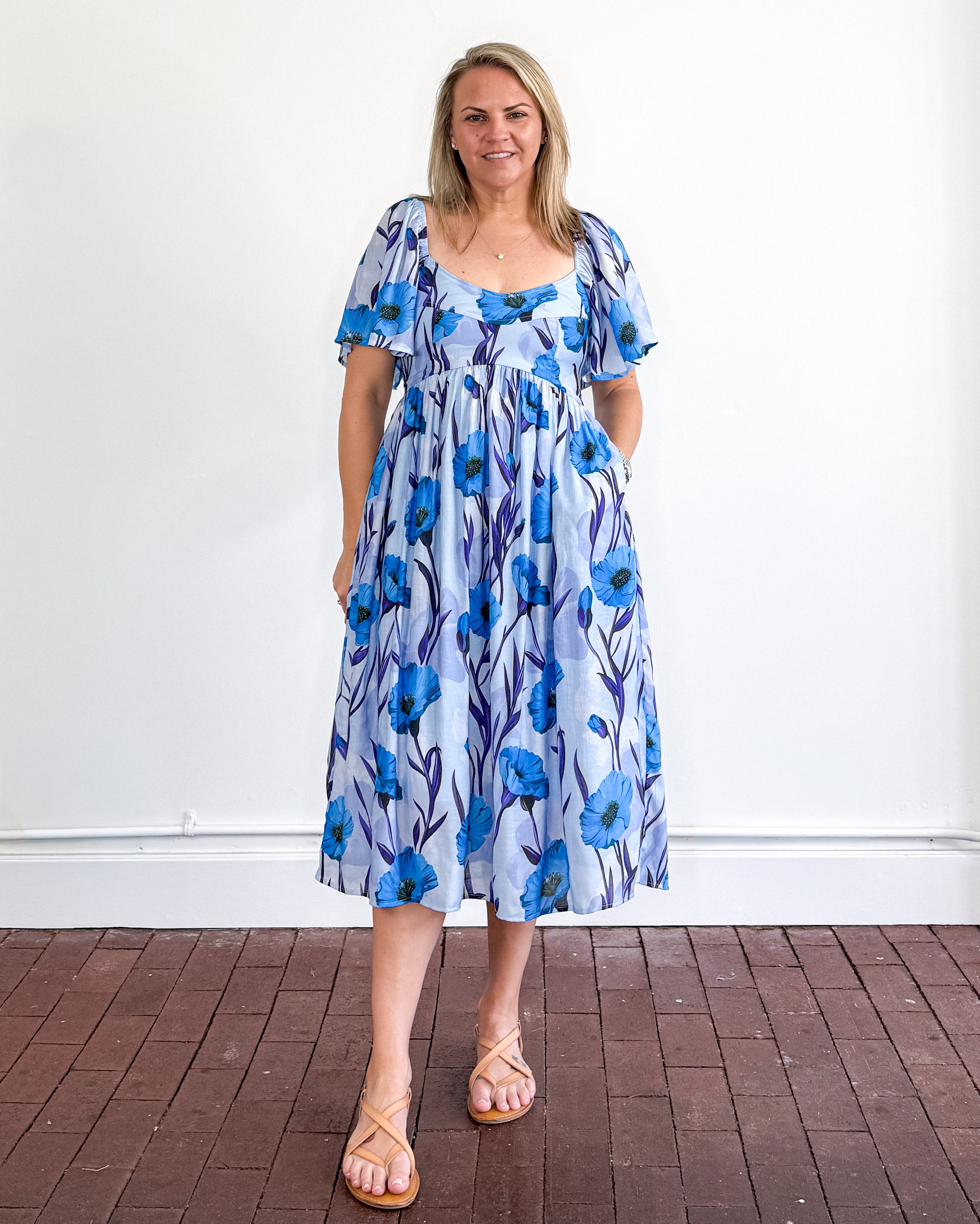 Short sleeve back smocking floral print woven midi dress with pockets. Lined.