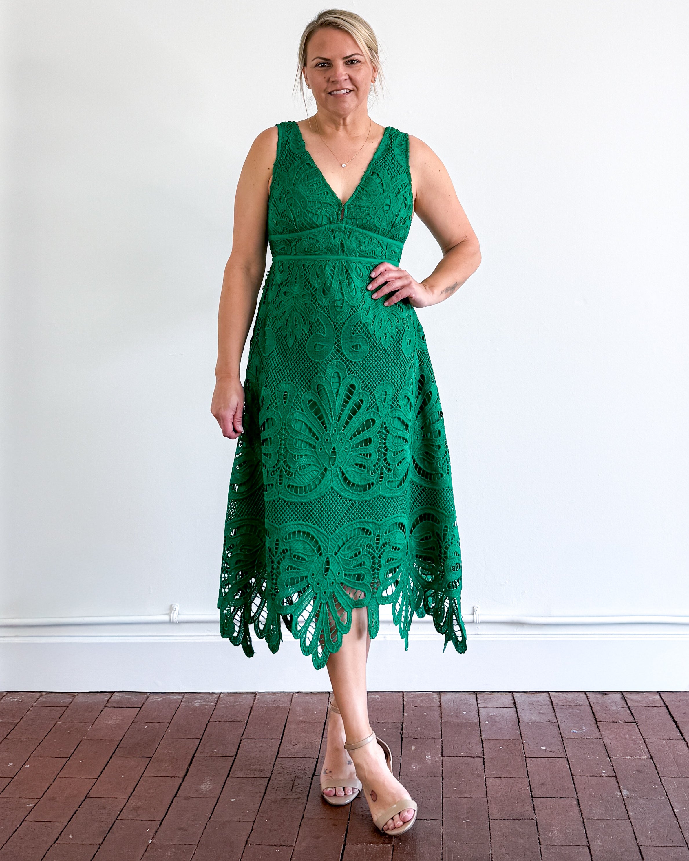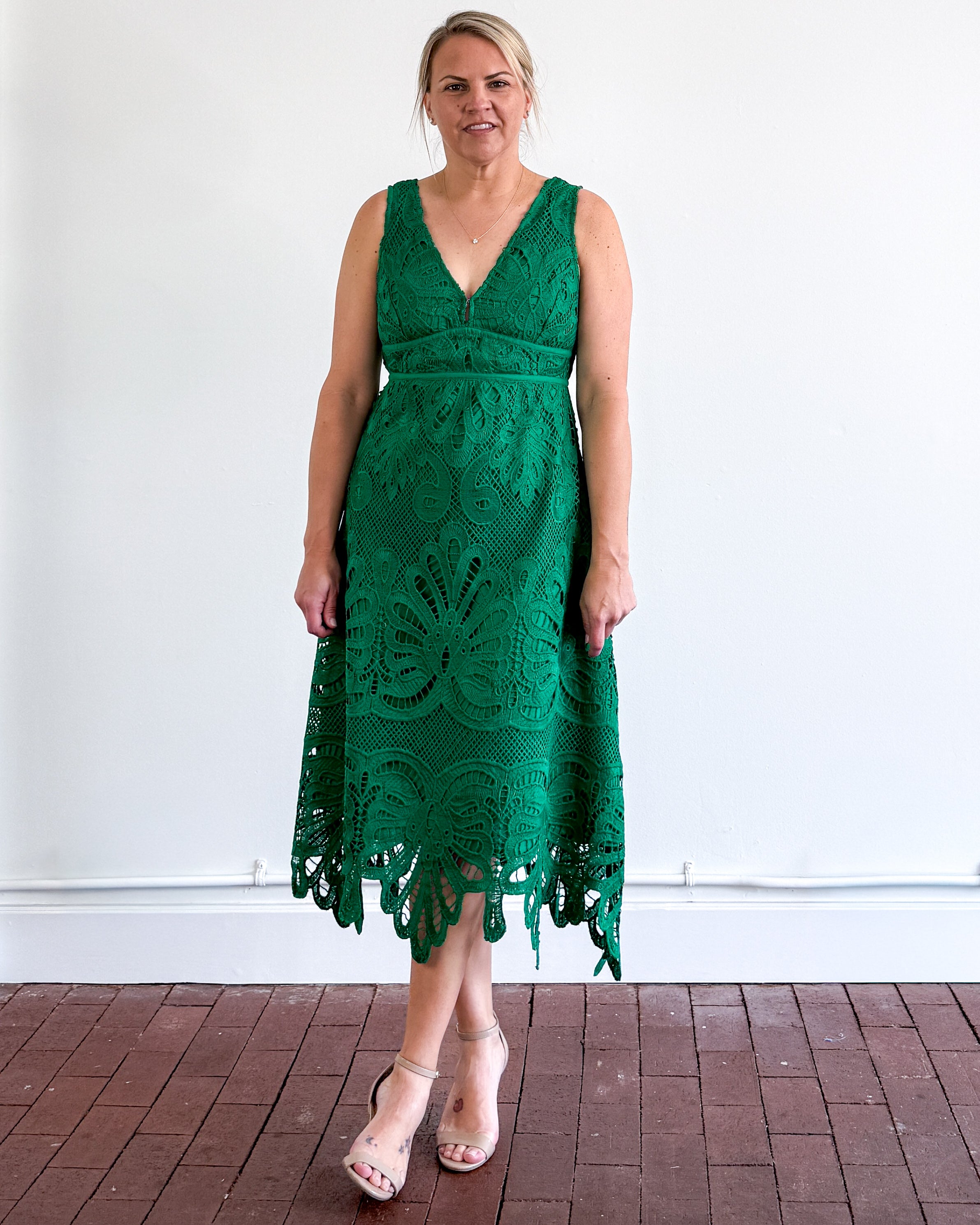 All over lace midi dress. Back zipper. Front eye hook. Lined.