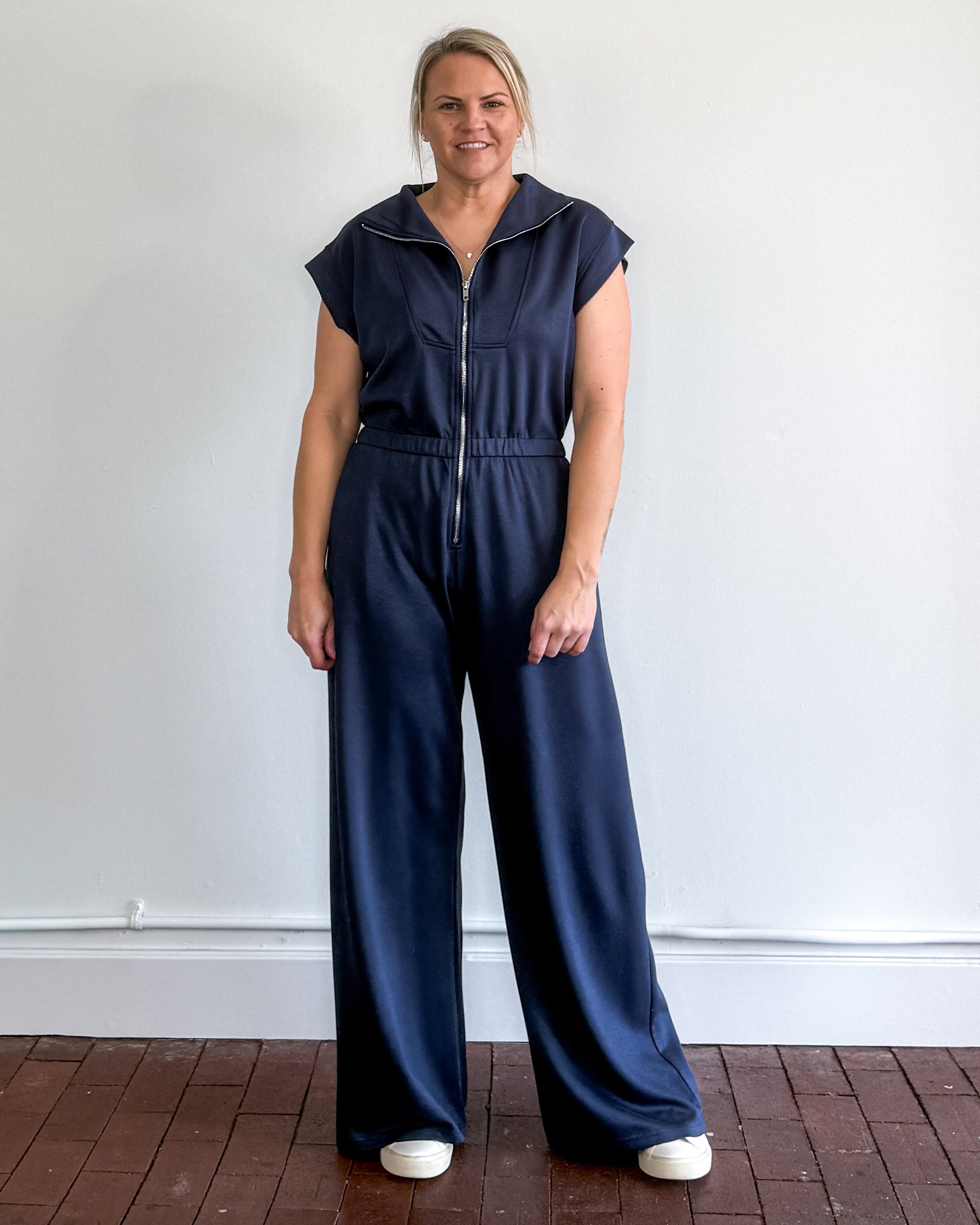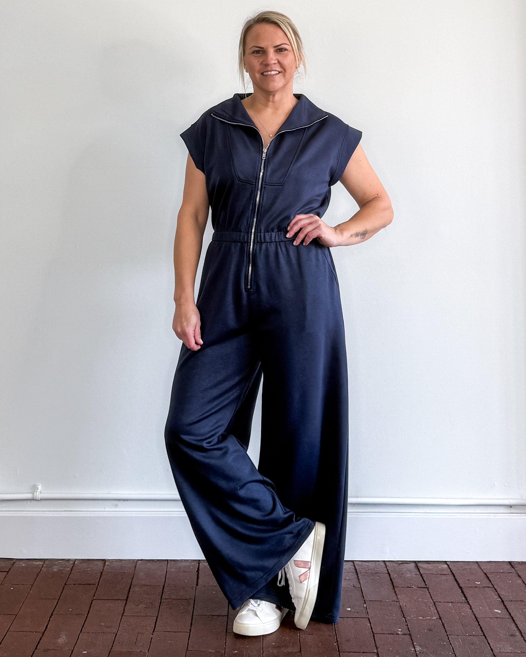 Drop shoulder half zip knit scuba jumpsuit.