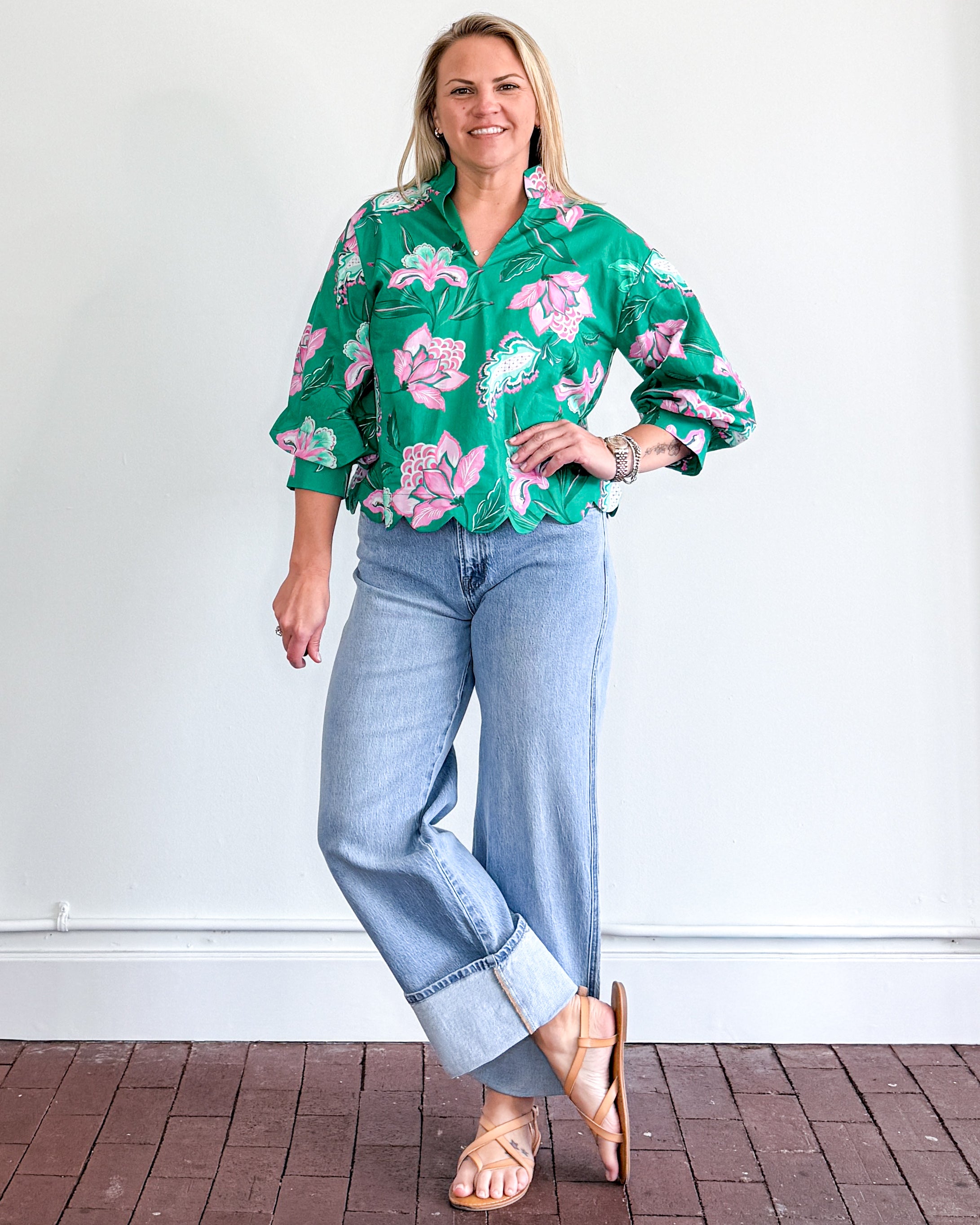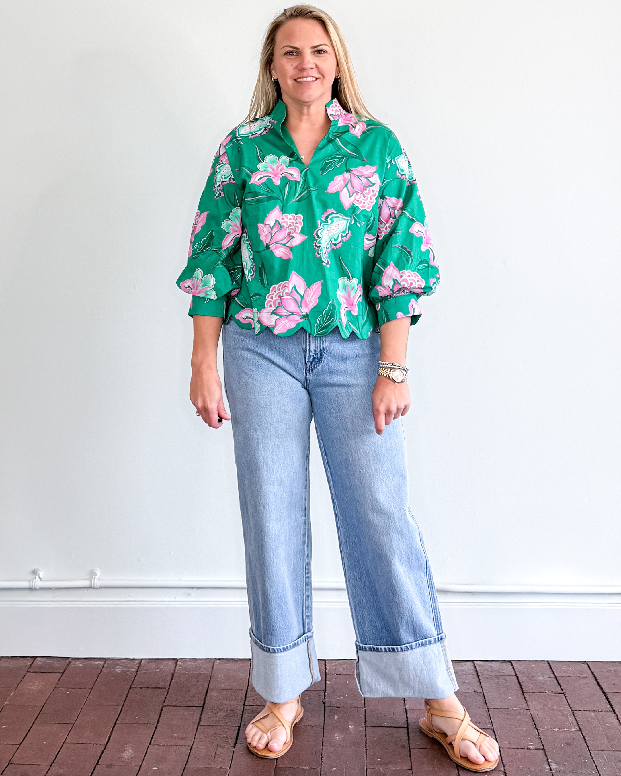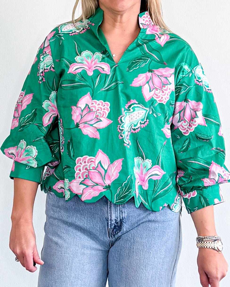 3/4 sleeve, floral print top with scalloped hemline.