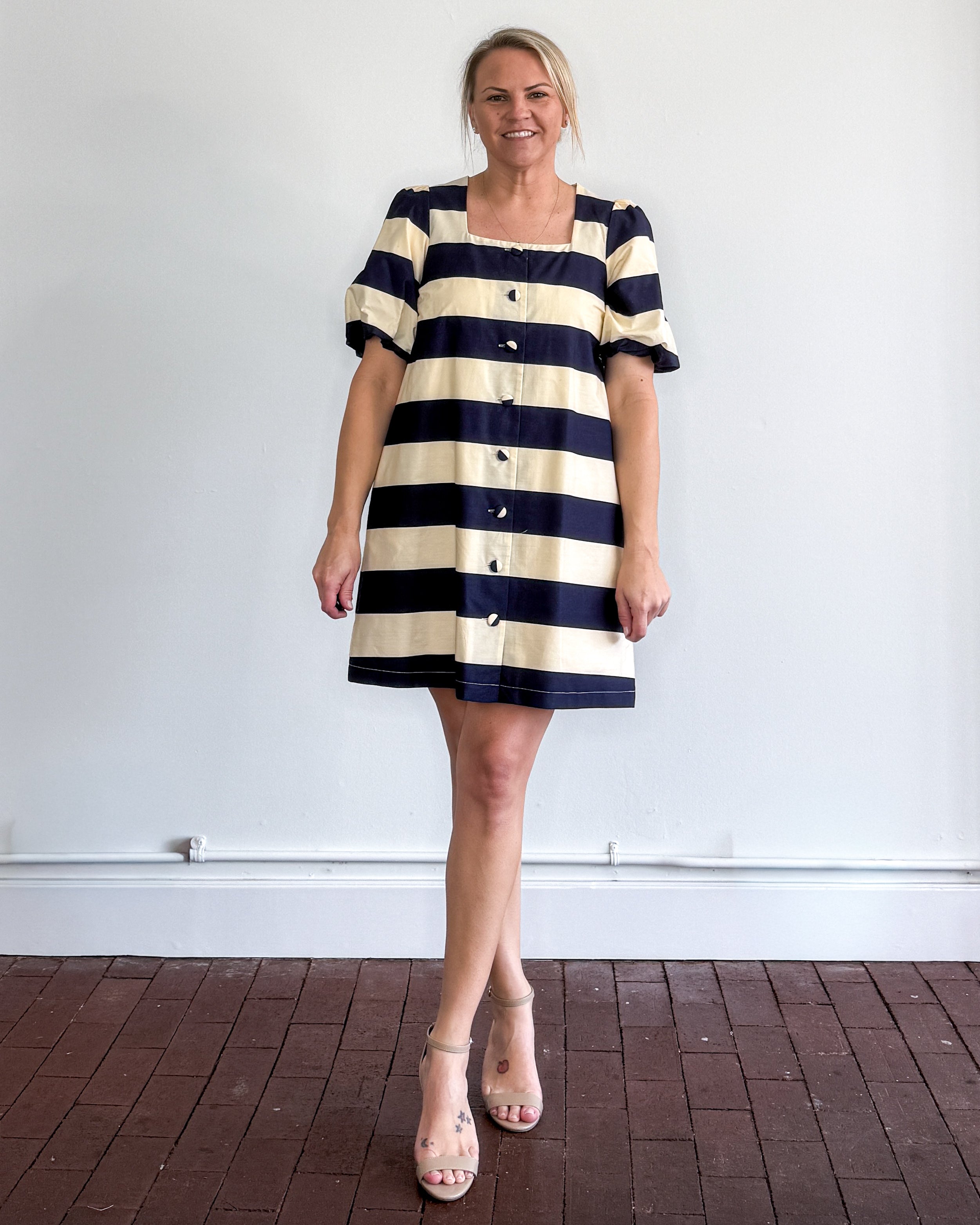 Striped, button down sheath mini dress. Lined. Functioning side pockets.