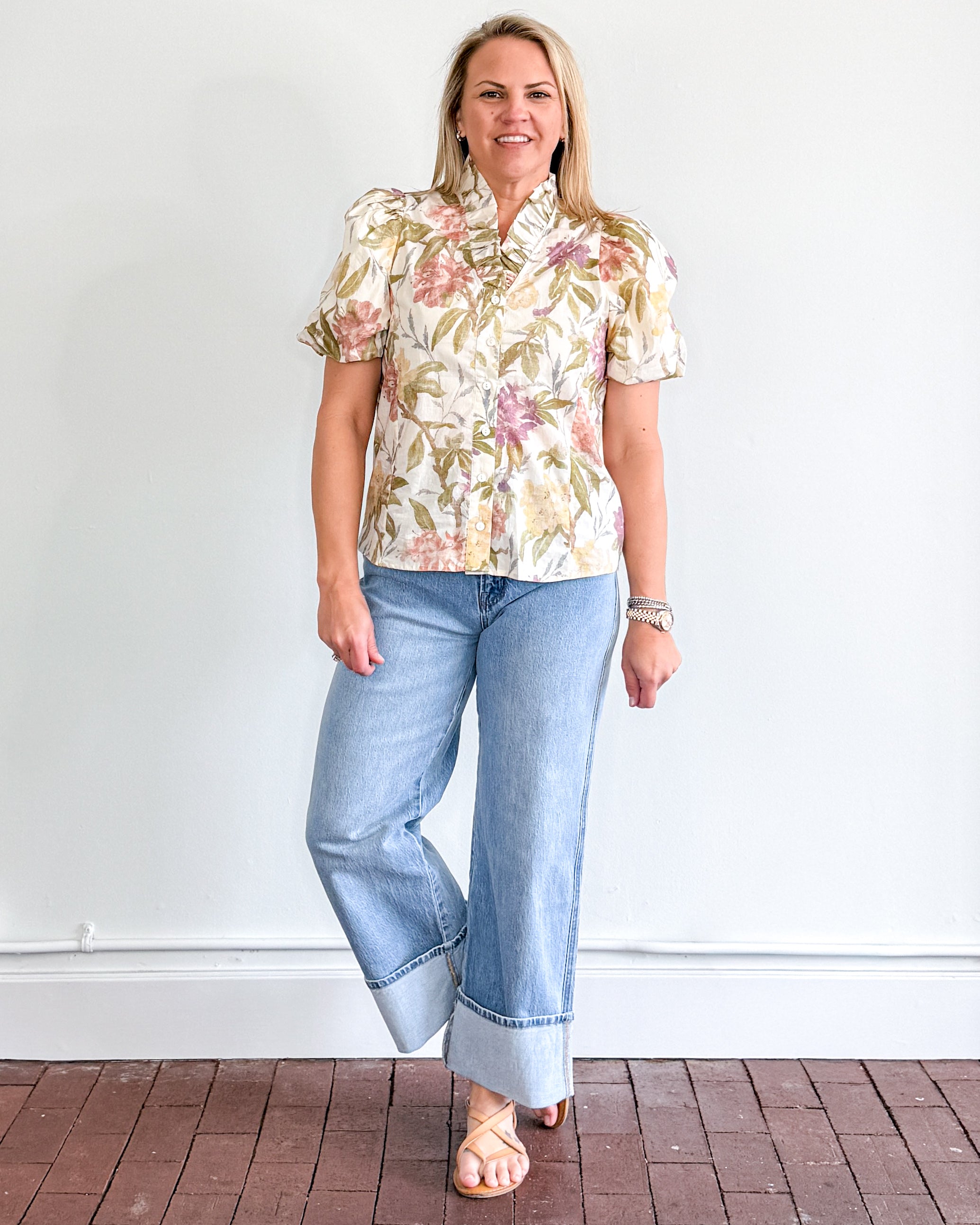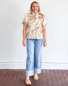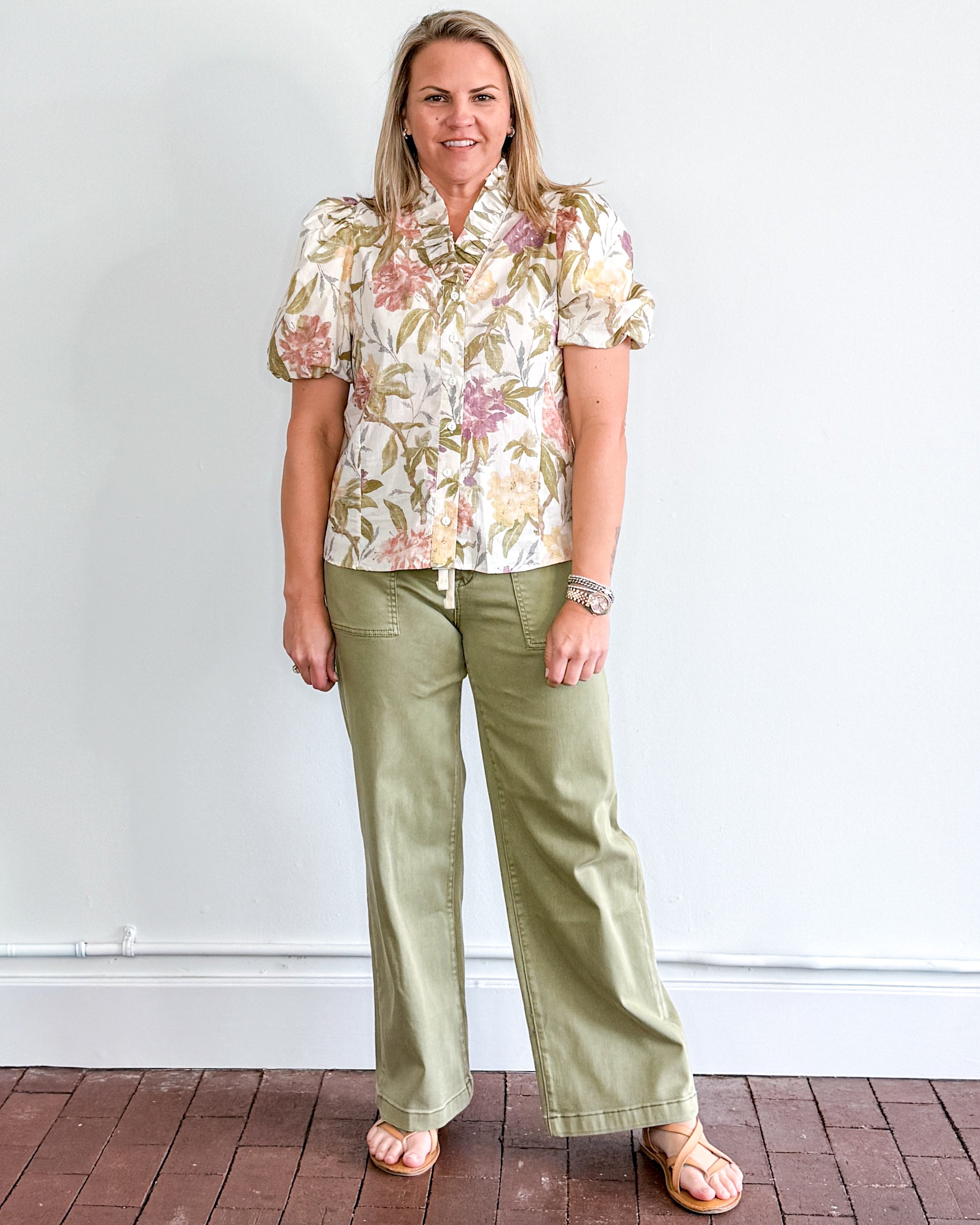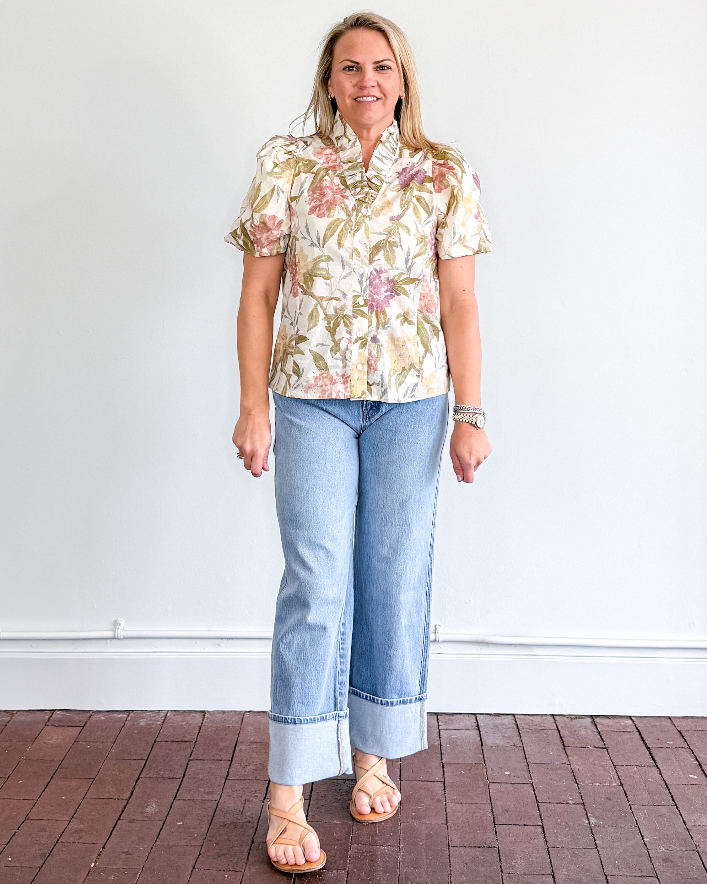Pastel floral, short puff sleeve, button down top with ruffled neckline.