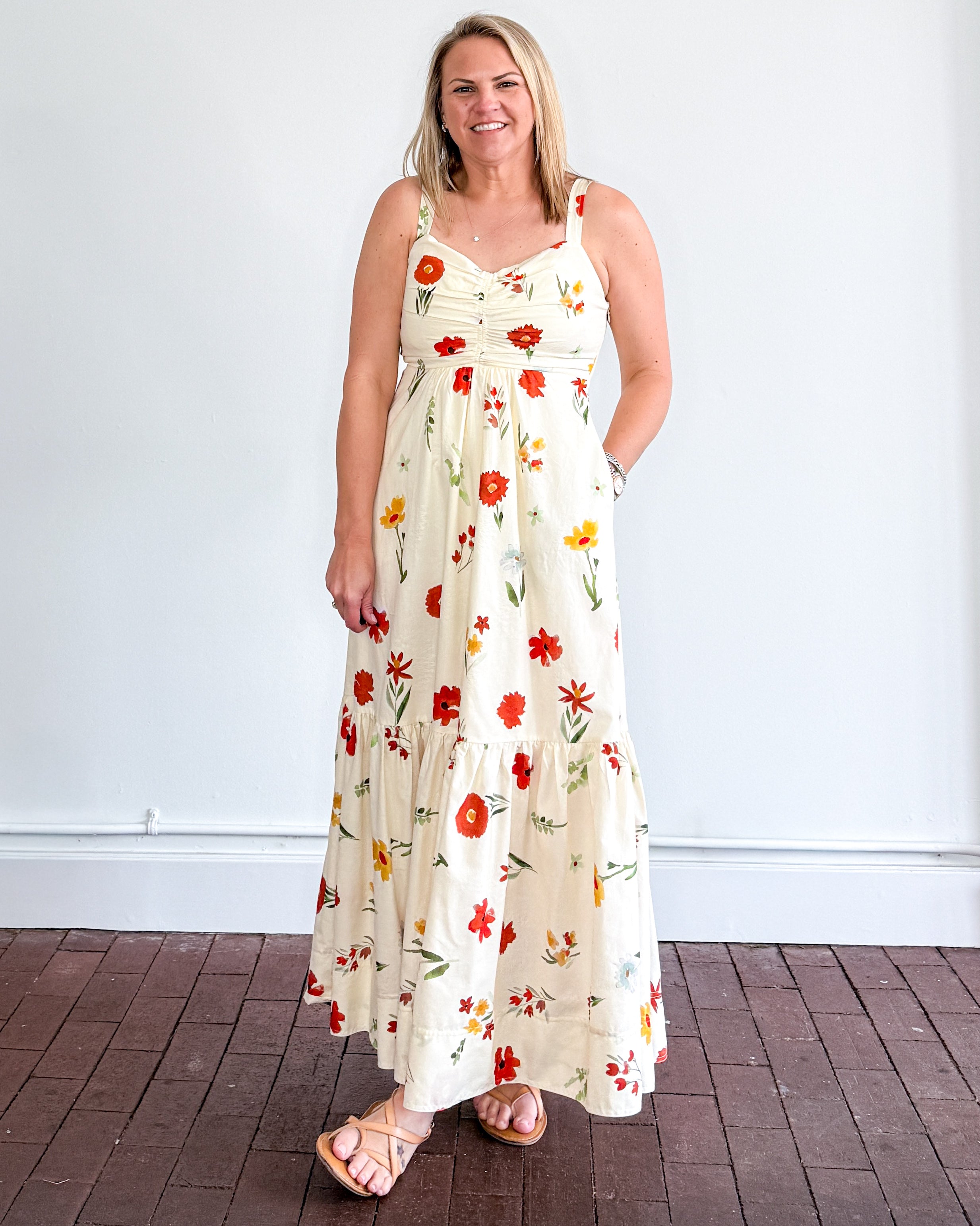 Tiered floral maxi dress. Thin, adjustable straps. Side zipper. Lined.