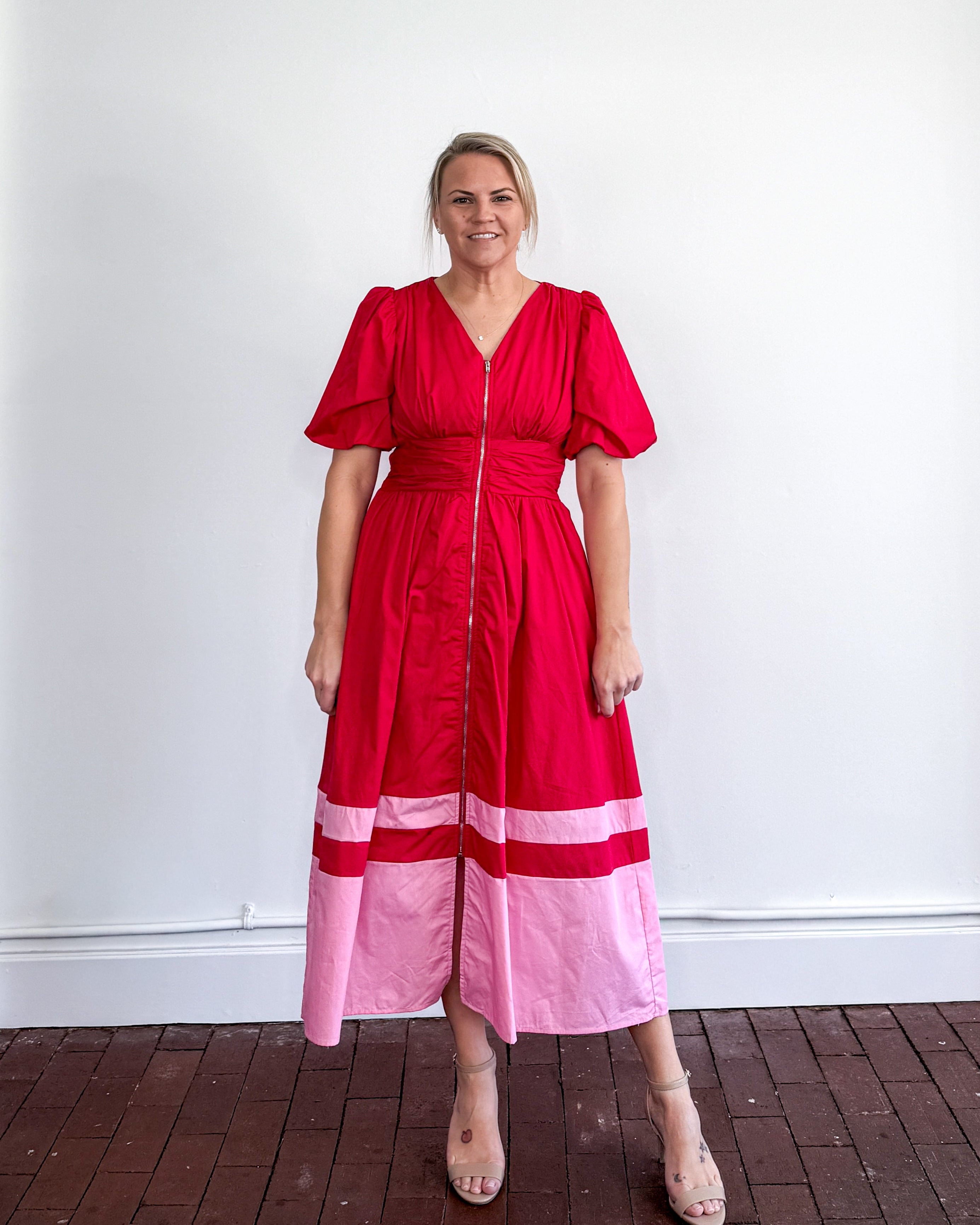 Bubble sleeve front zip color block midi dress with side pockets. Lined.