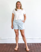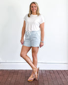 High rise, drawstring striped shorts. Comfort stretch denim, slant pockets & a finished hem.