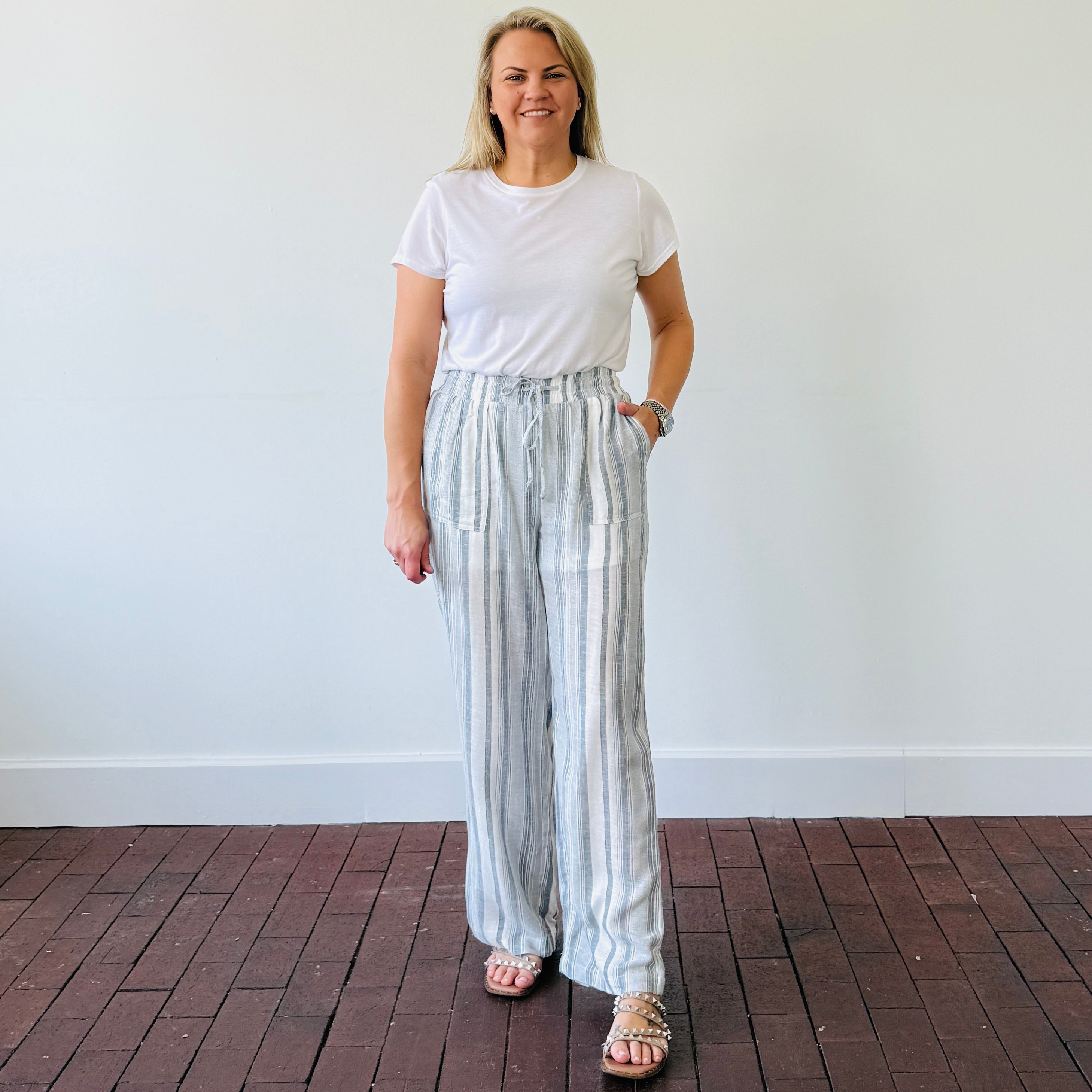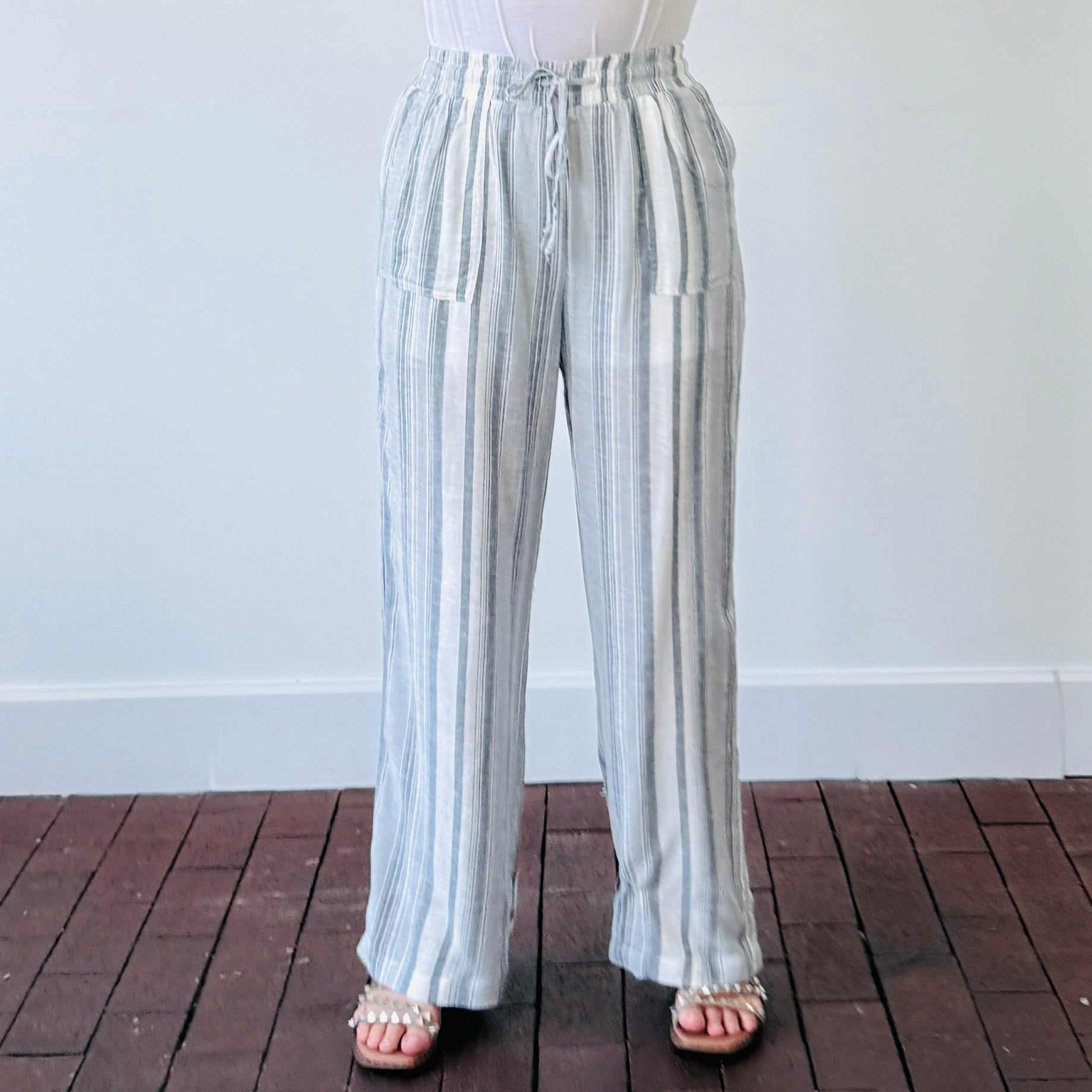 Keywords: striped linen pants, pull-on summer pants, drawstring waist trousers, lightweight lined pants, casual linen blend pants, South Tampa boutique fashion