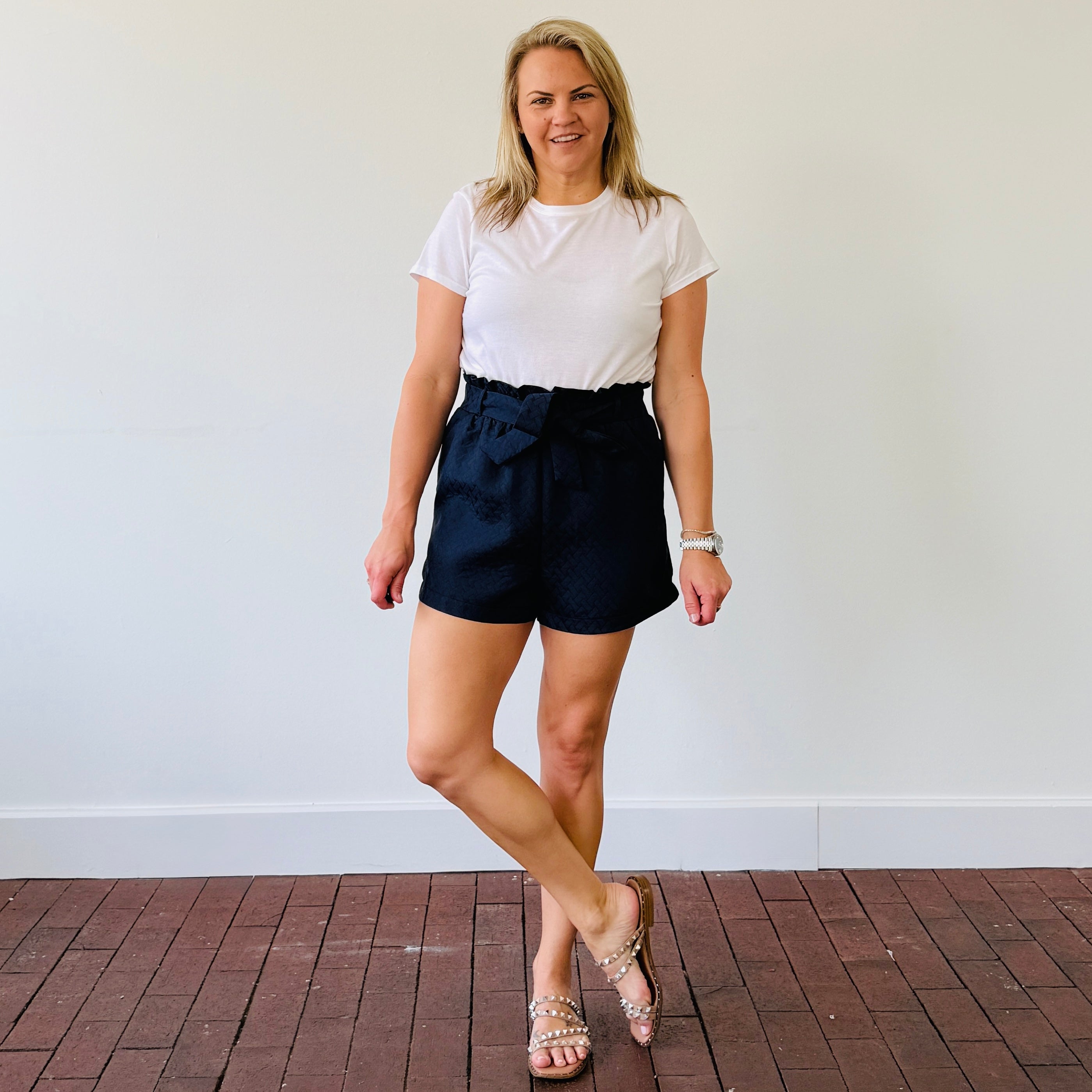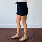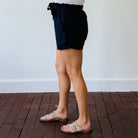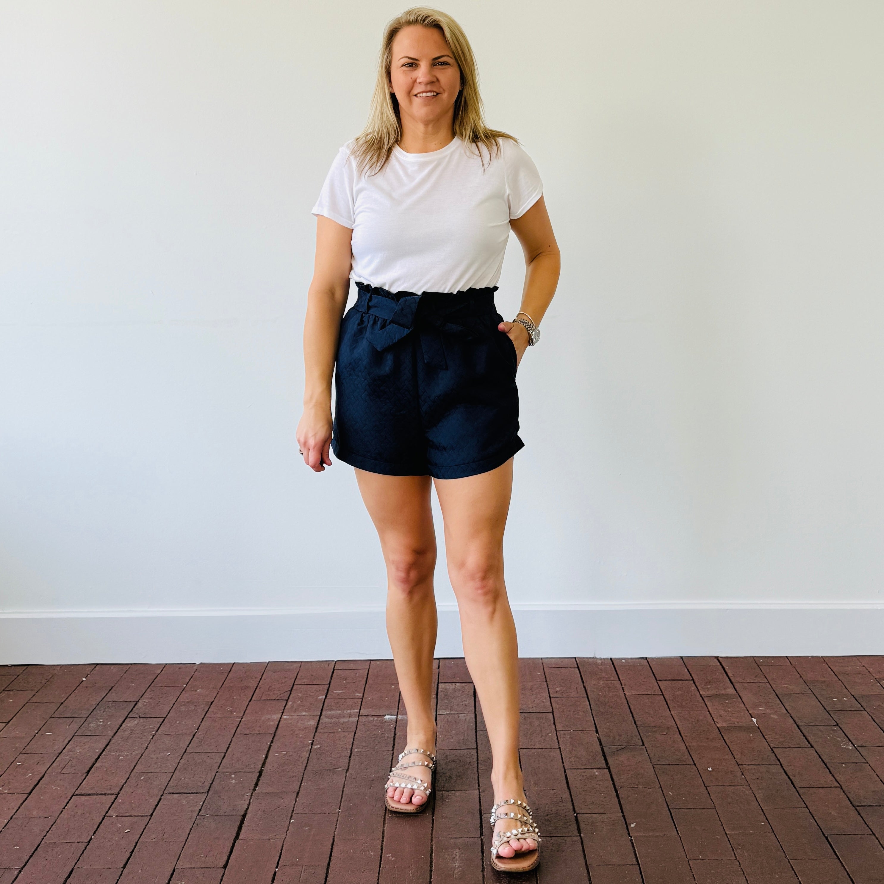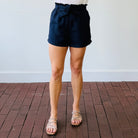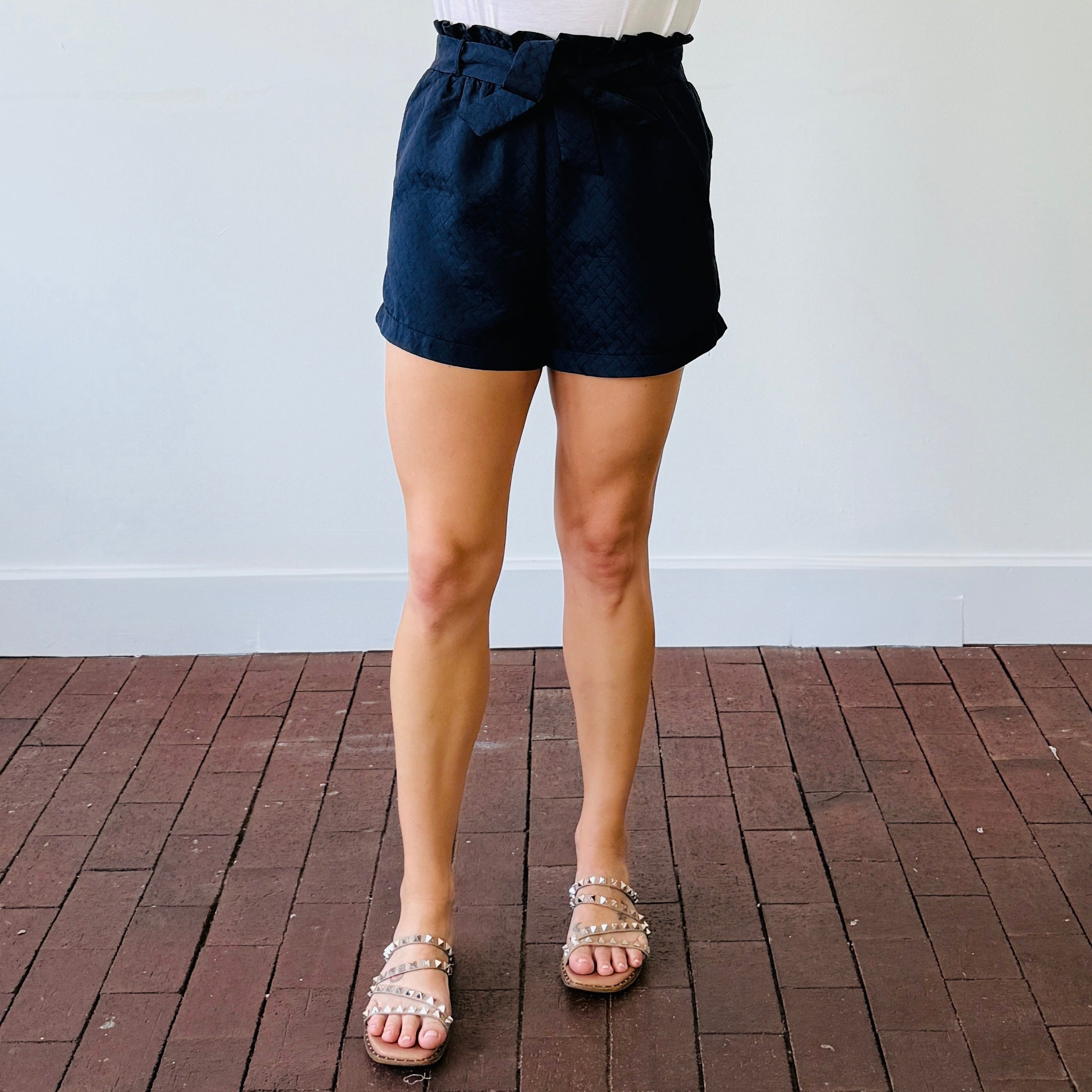 Keywords: high waist summer shorts, textured woven shorts, ruffle waist shorts, tie front shorts, casual chic shorts, South Tampa boutique fashion
