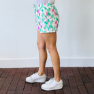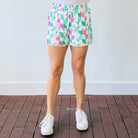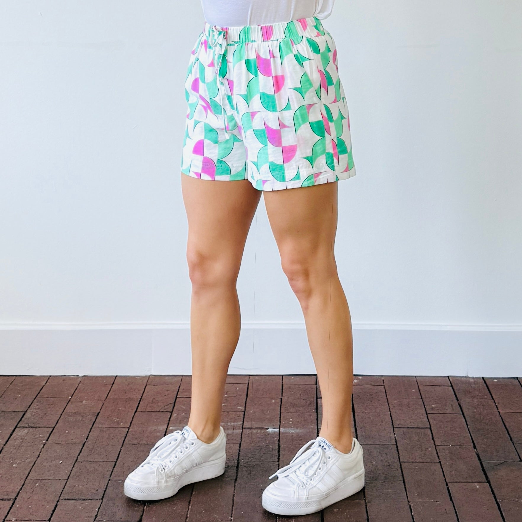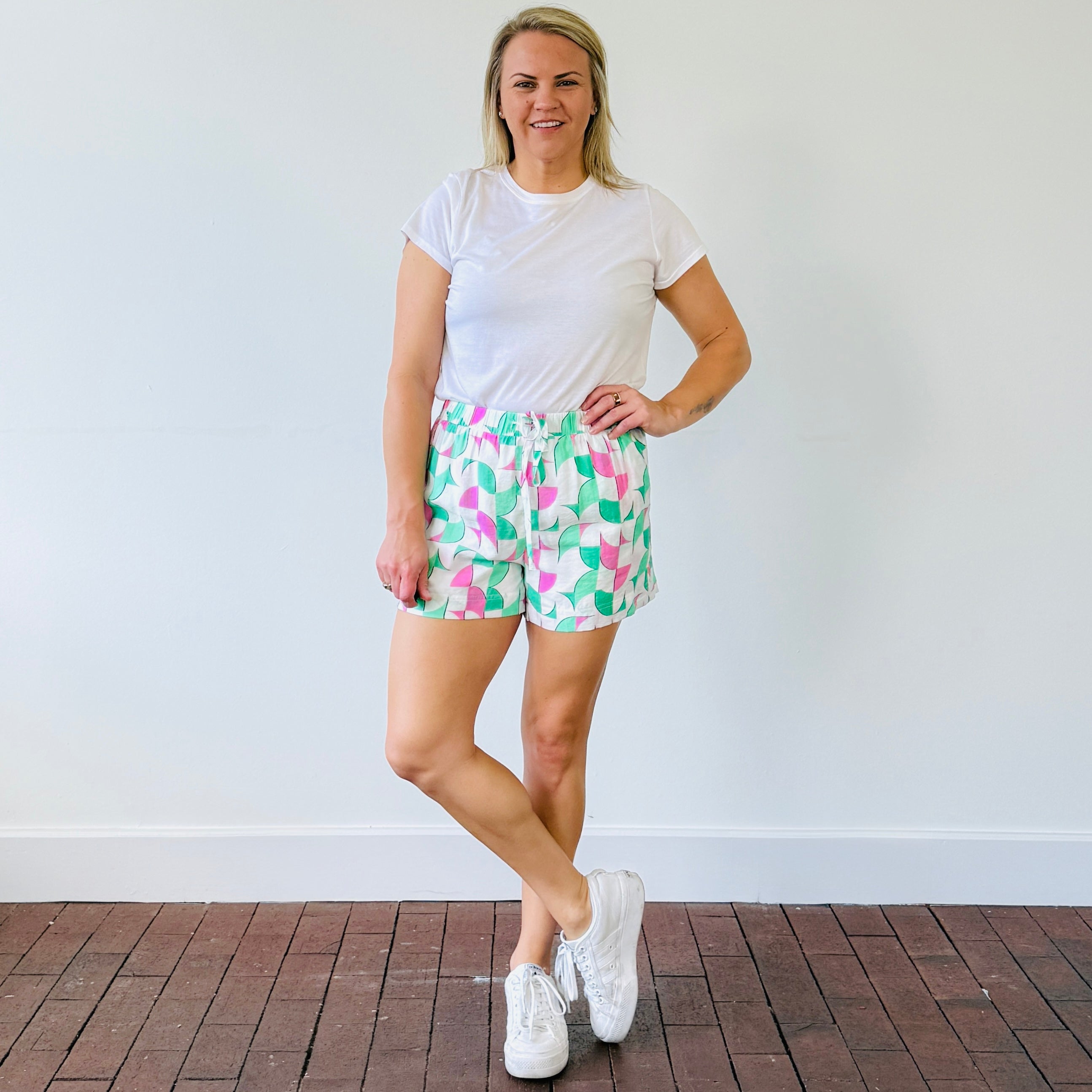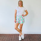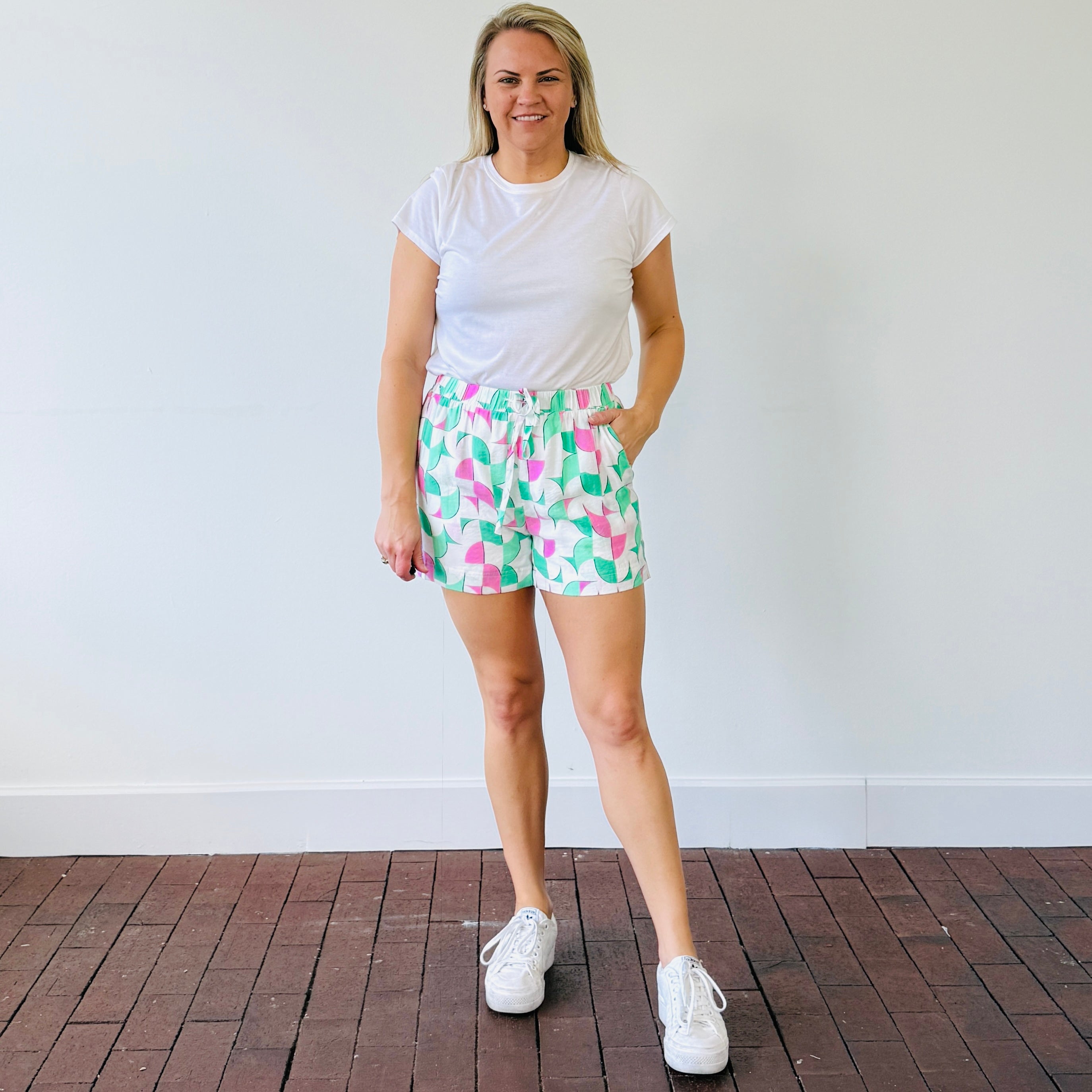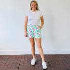 Keywords: high waisted summer shorts, printed shorts with tie waist, elastic waist shorts, stylish women’s shorts with pockets, boutique vacation wear, South Tampa boutique style