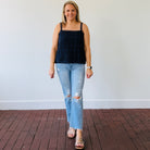 Why Not Boutique owner Jennifer is 5'4”, 36C bust, size 8 or 28 jean. She is modeling the Medium. Fits true to size.