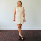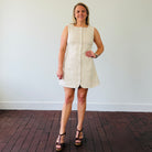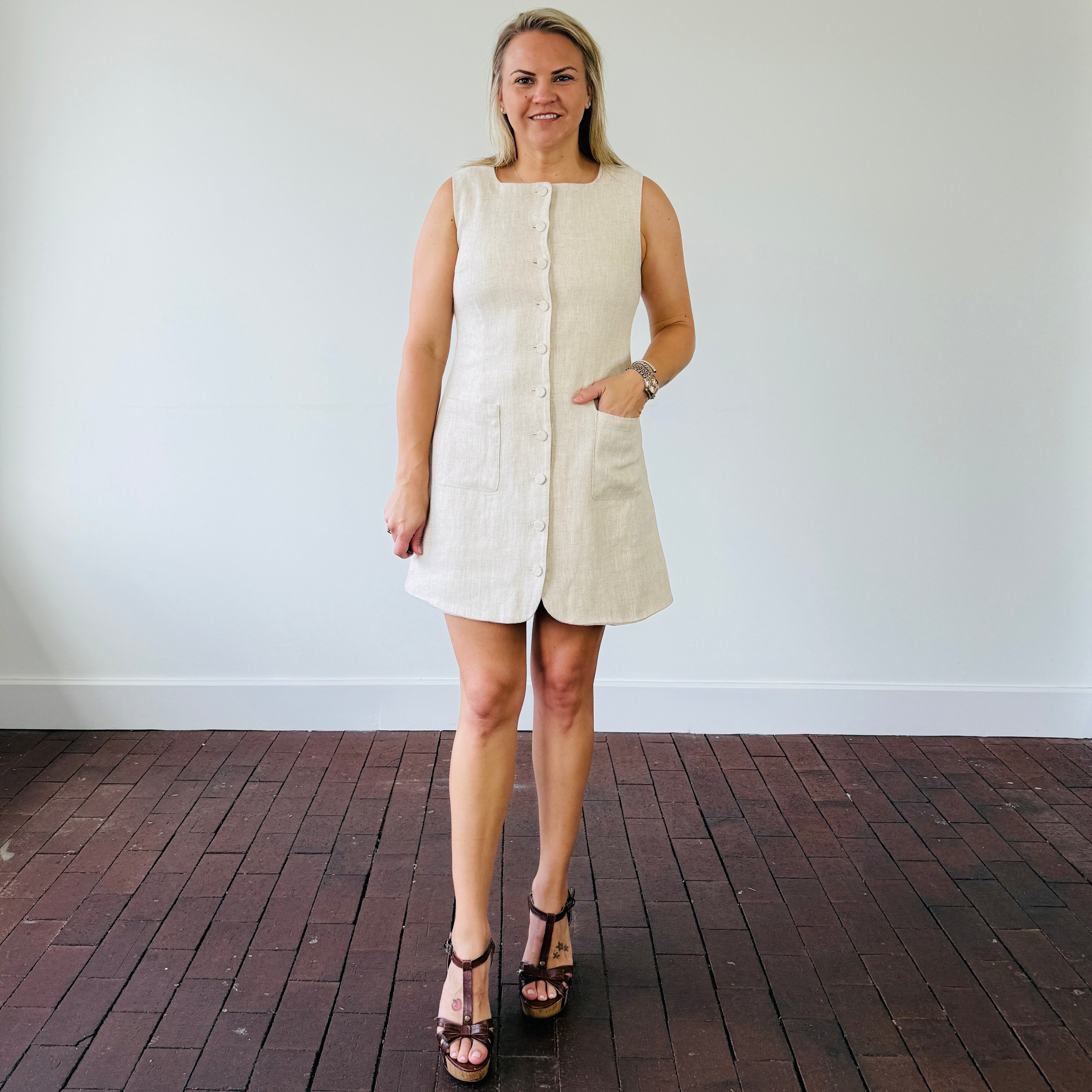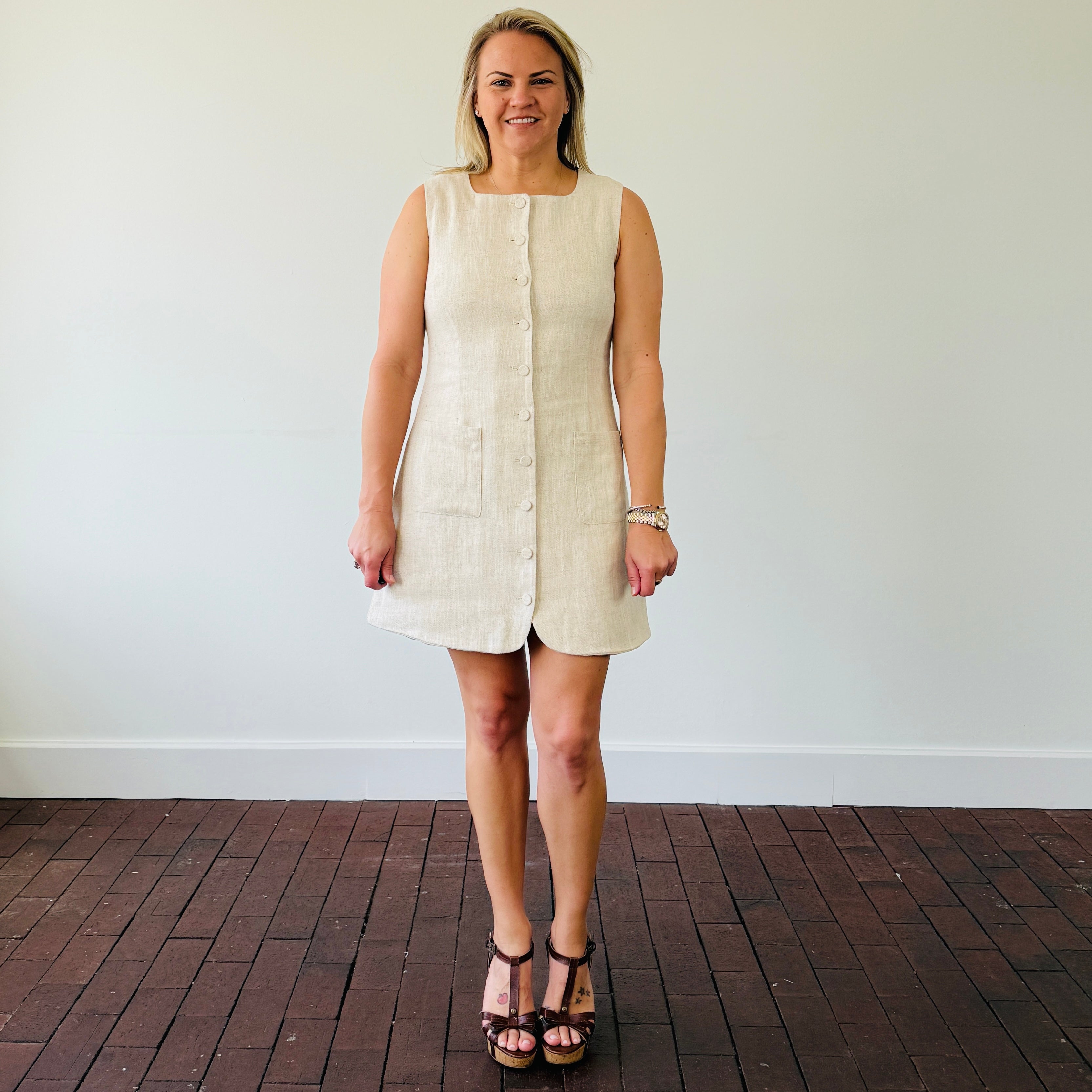 Keywords: linen blend mini dress, square neck summer dress, button down sleeveless dress, casual linen dress with pockets, warm weather mini dress, South Tampa boutique fashion