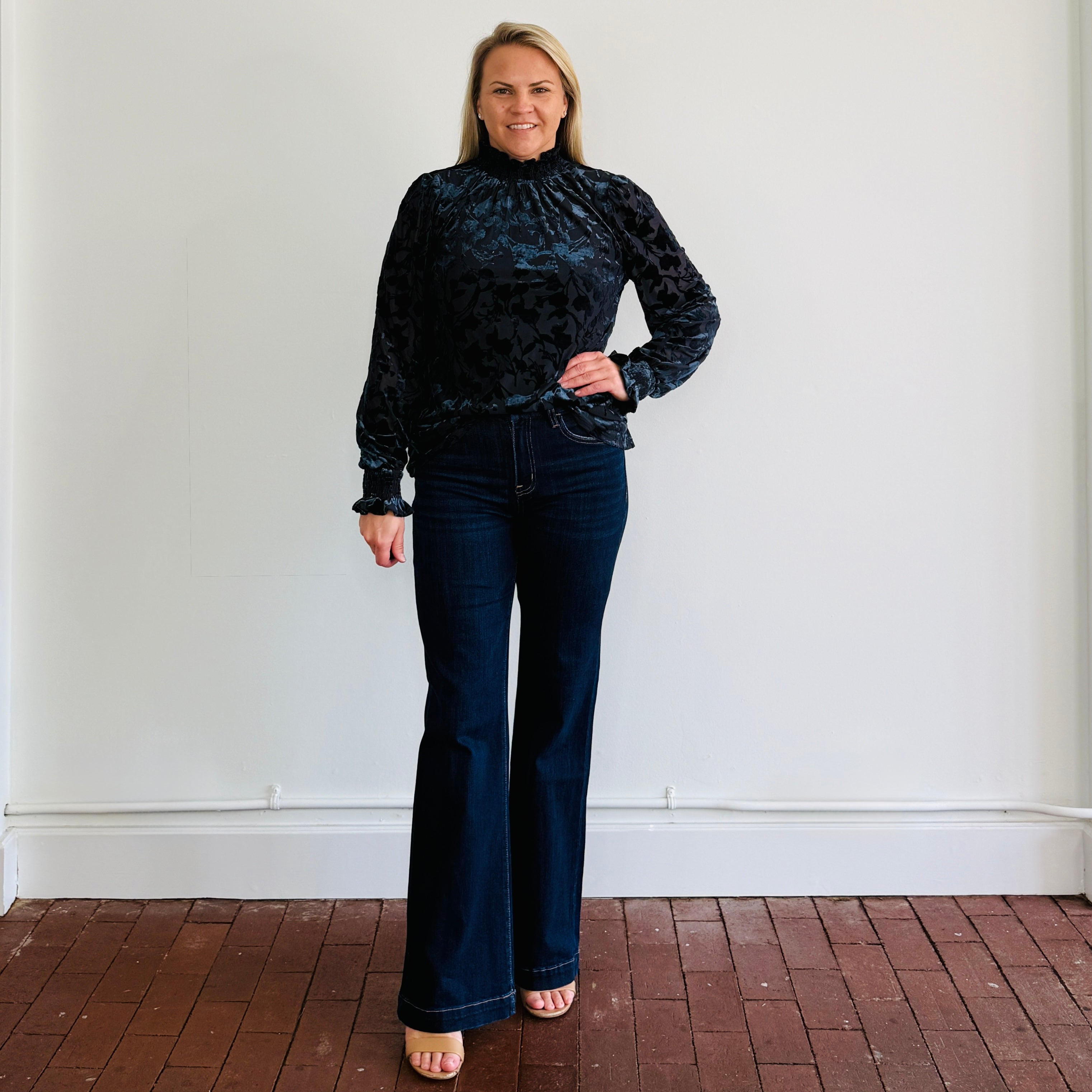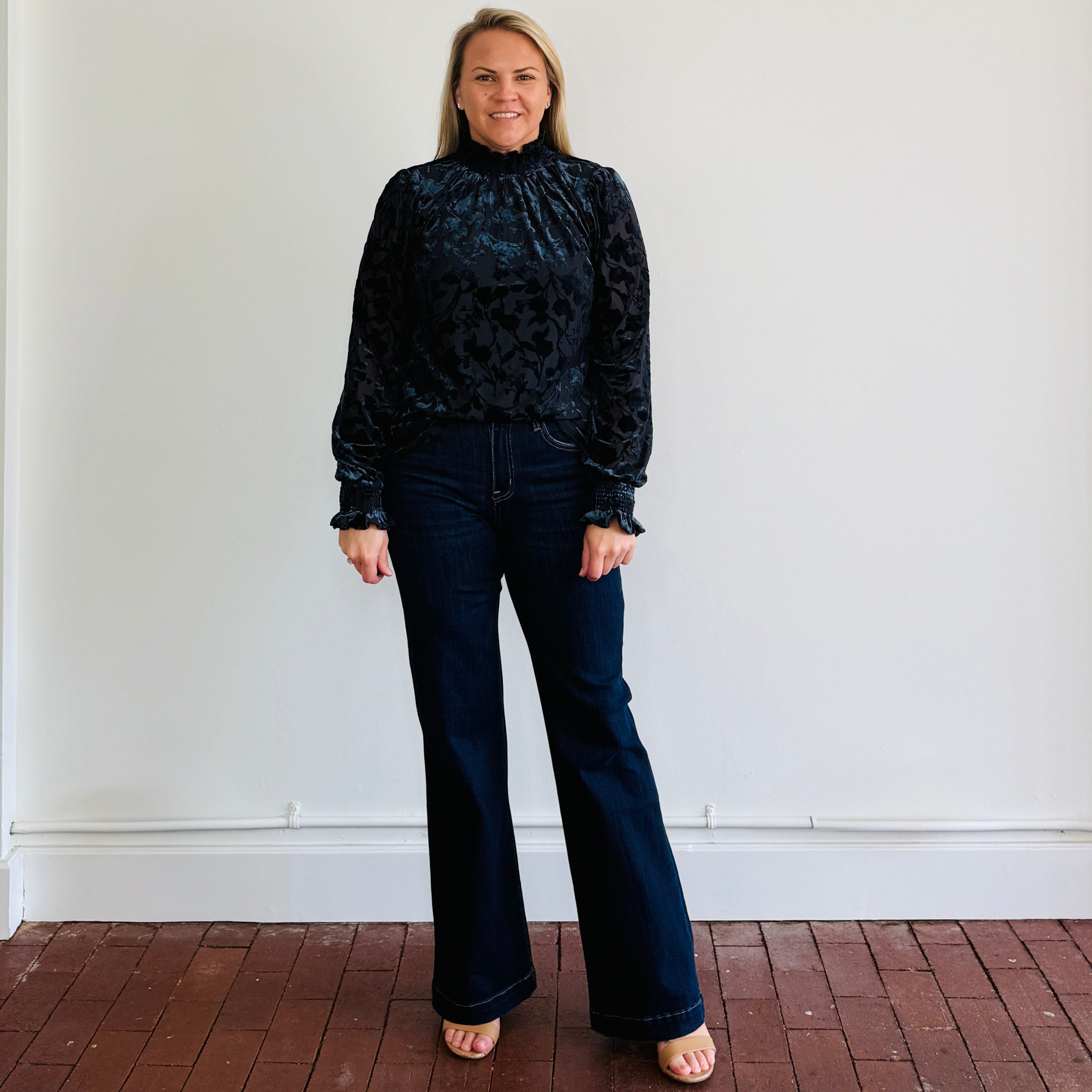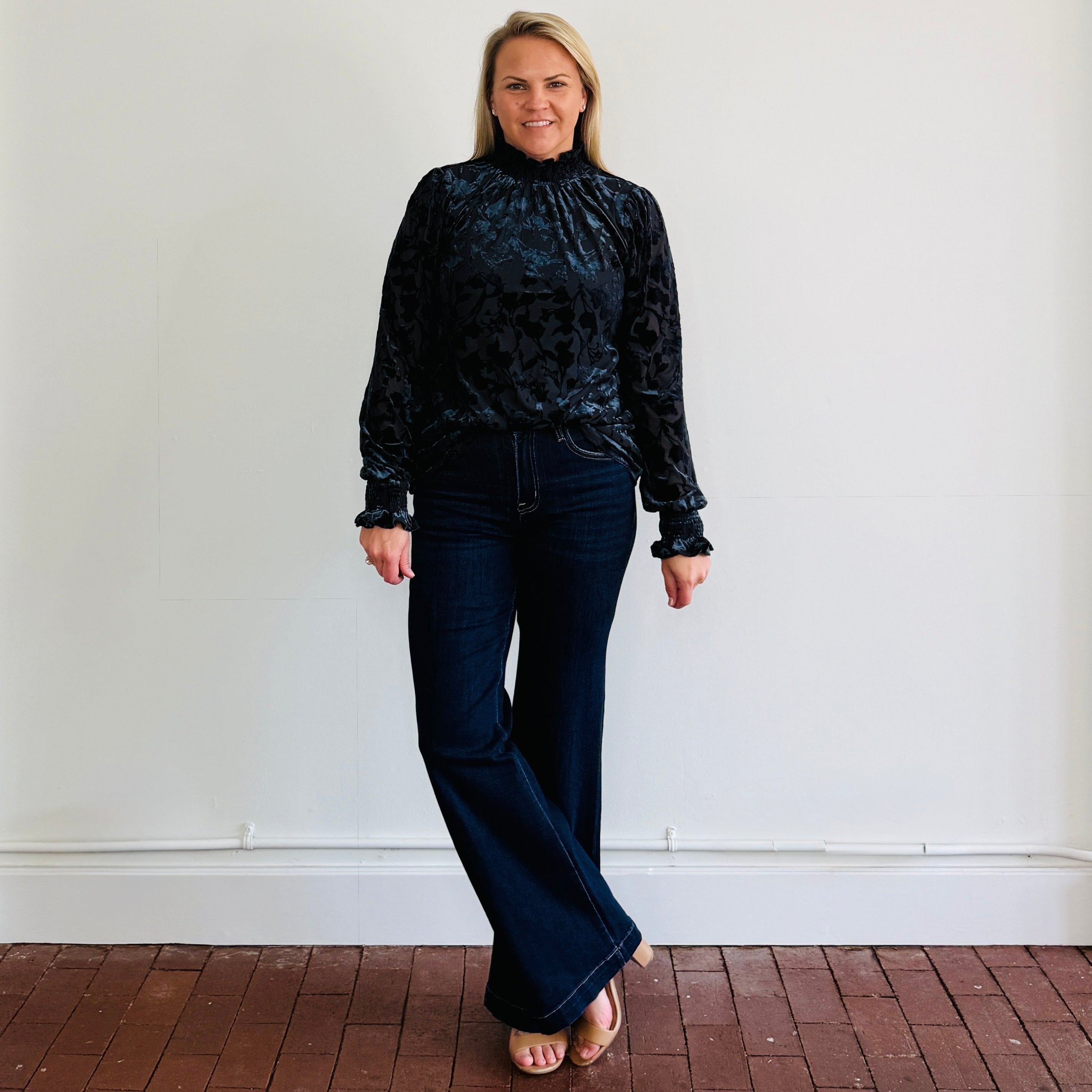Smocked mock neck long sleeve mixed material velvet flower top.