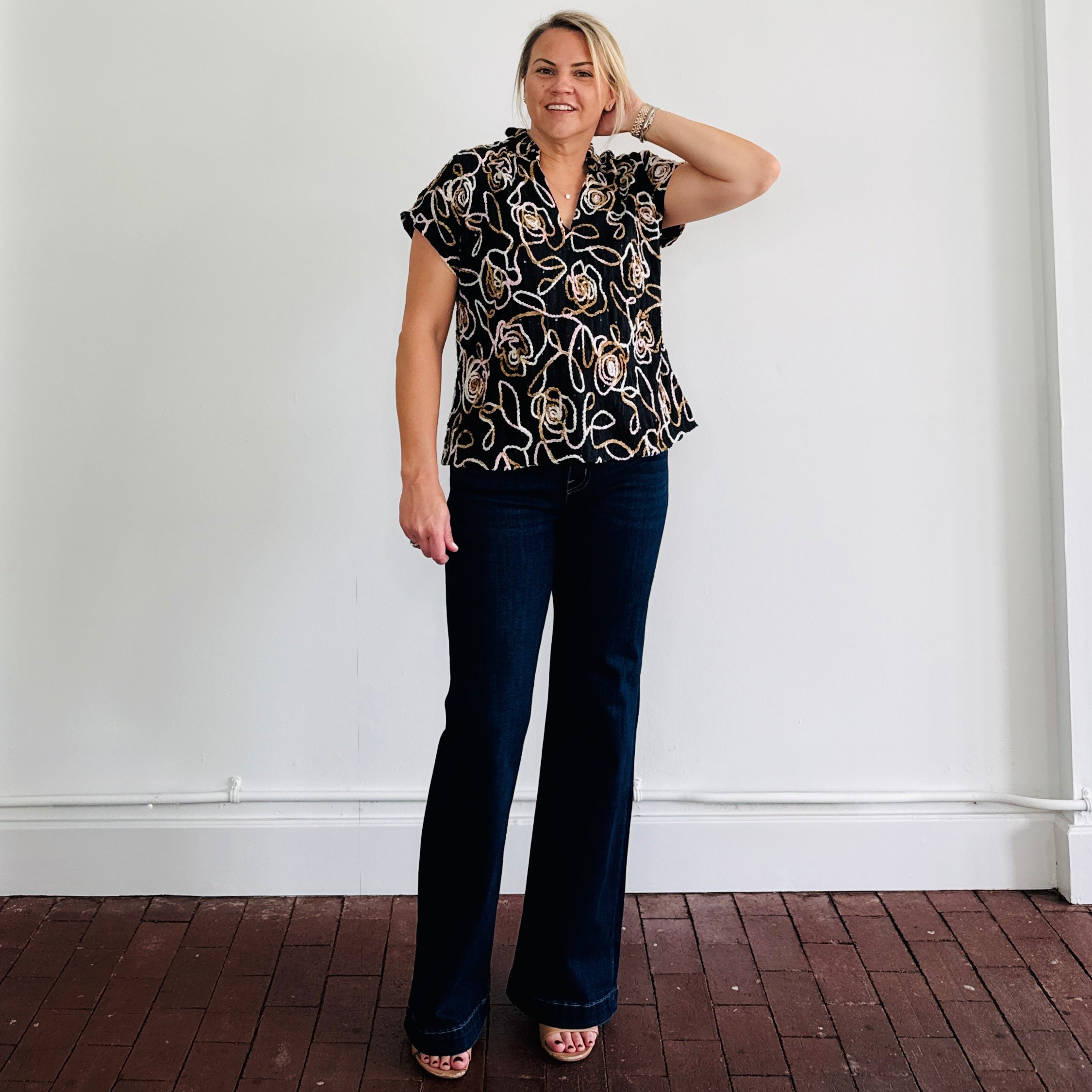 Embroidered v neck top with subtle sequins.