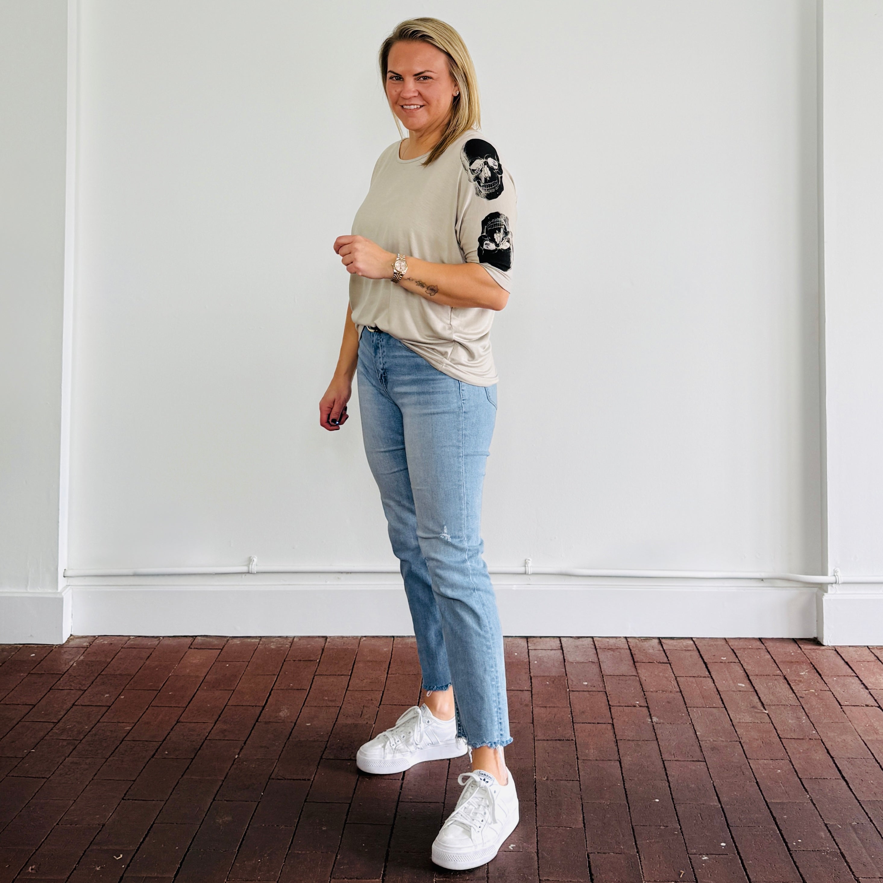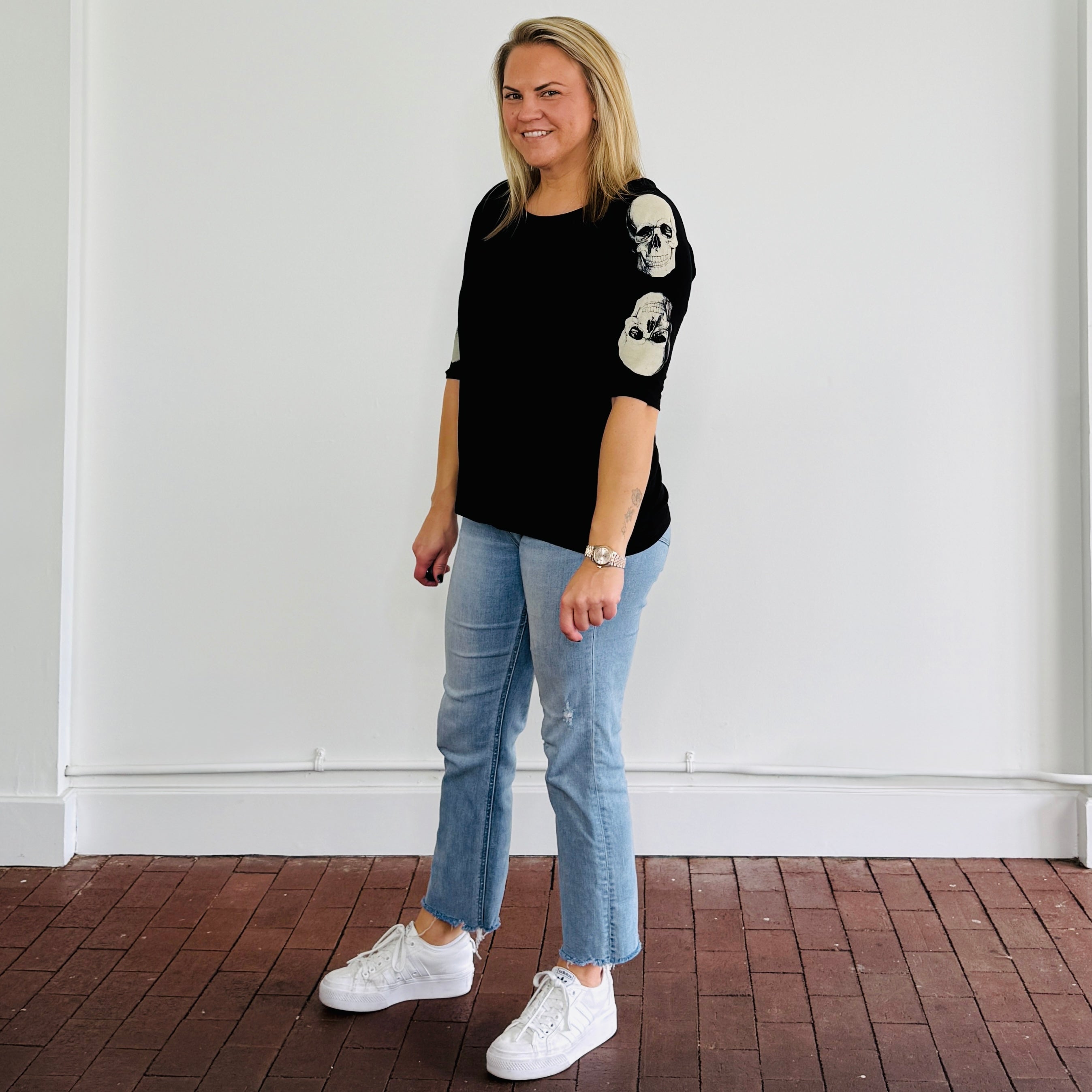 Round neck dolman sleeve top with skull faces on both sleeves.