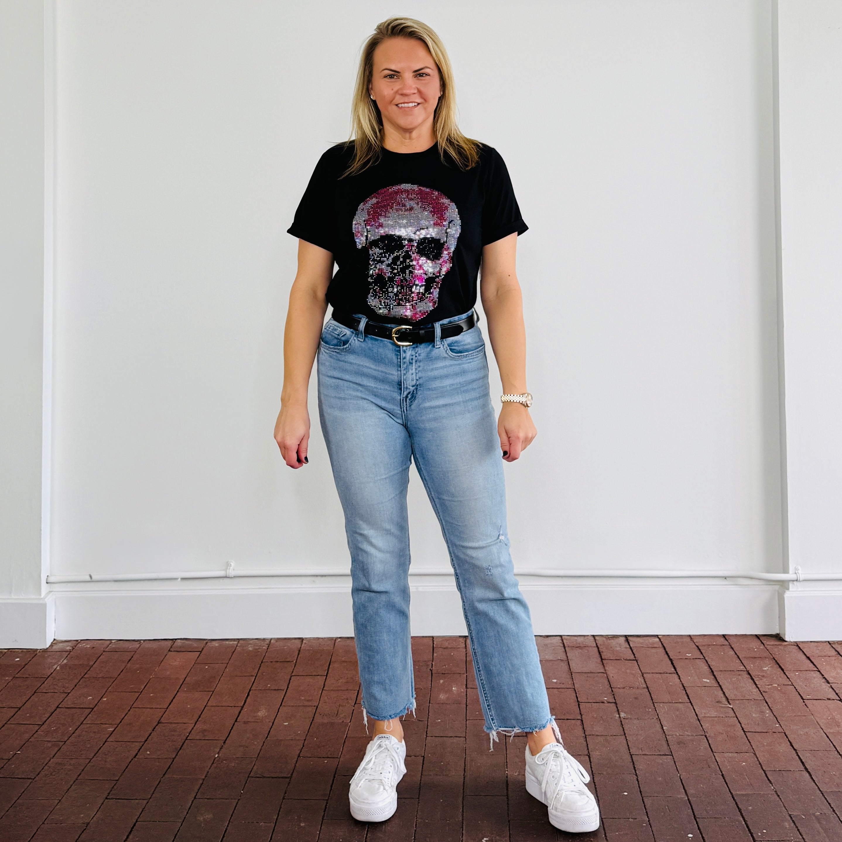 This short sleeve top provides comfort and style. Edgy skull graphic for a bold statement. Sparkling rhinestones add a touch of glamour.