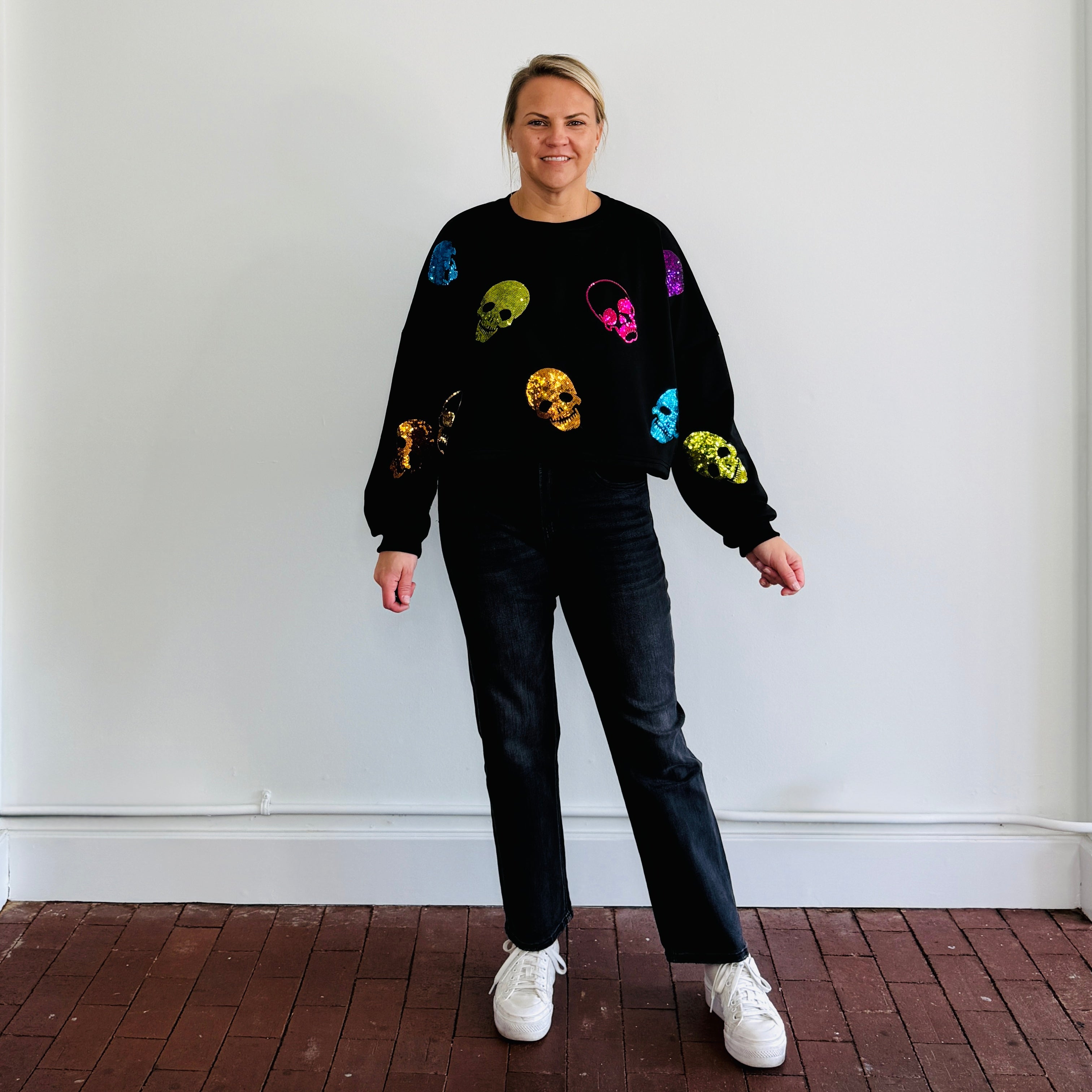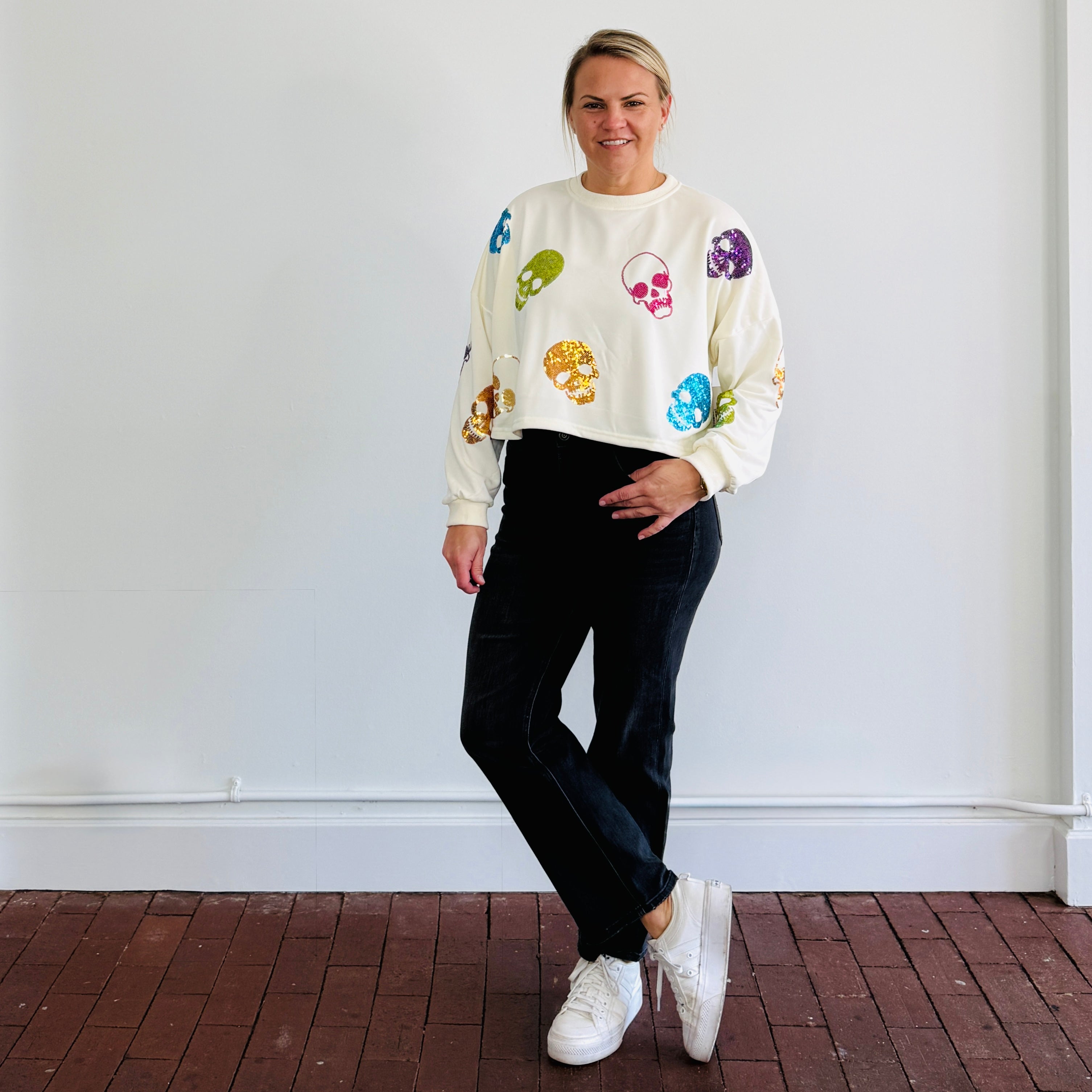 Round neck multi colored sequin skull lightweight cropped sweatshirt