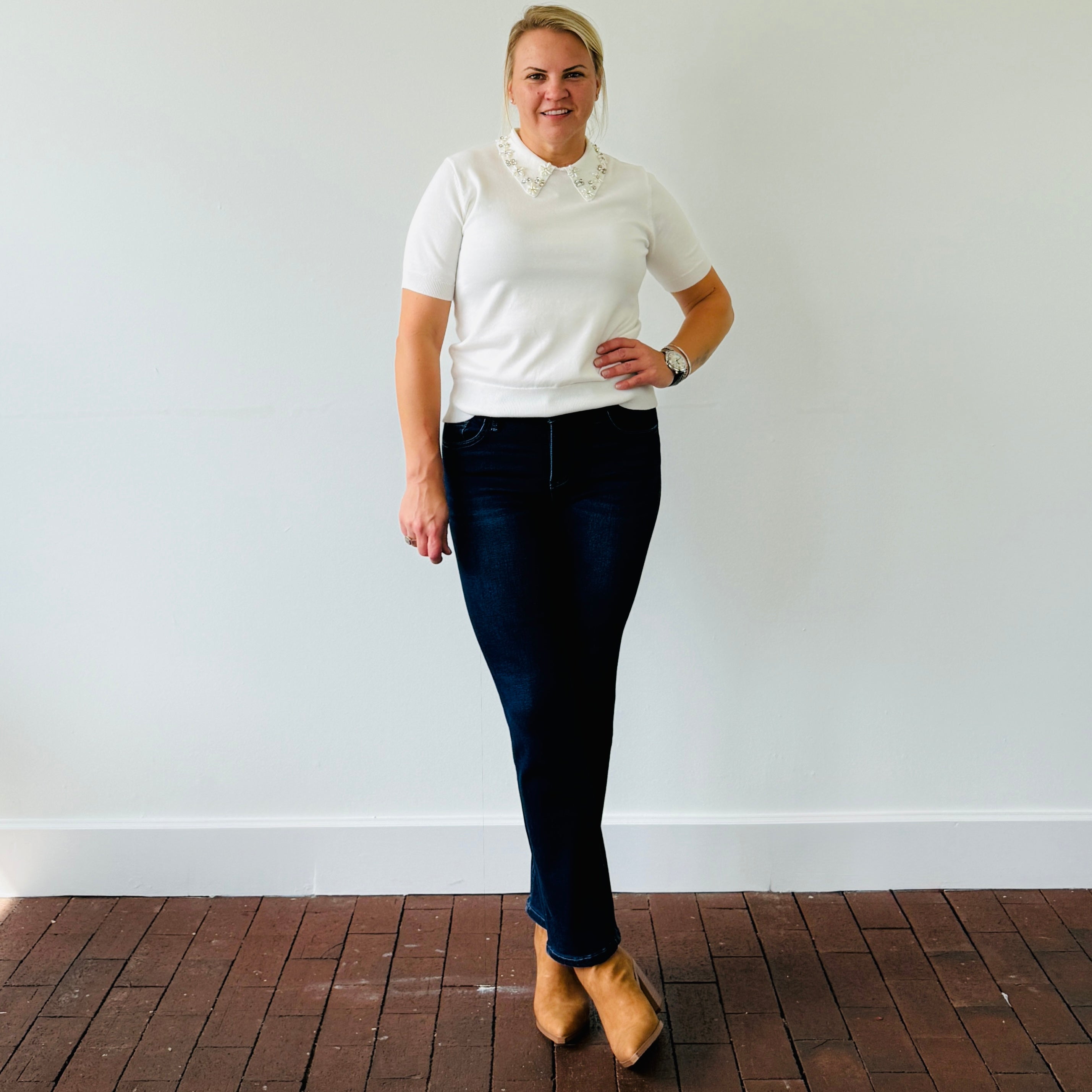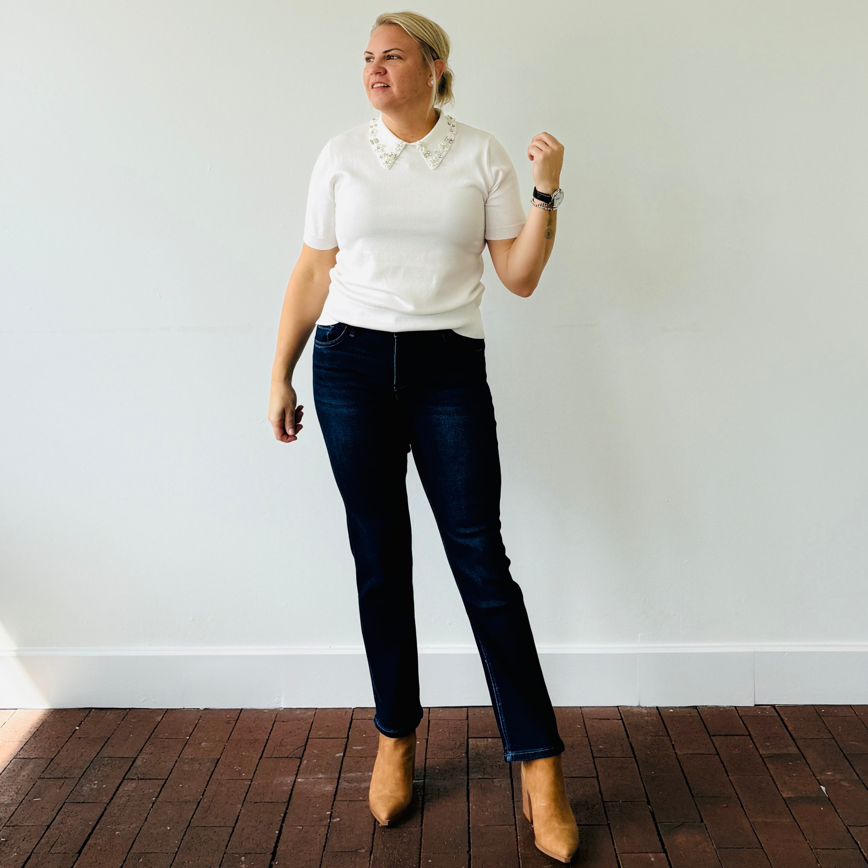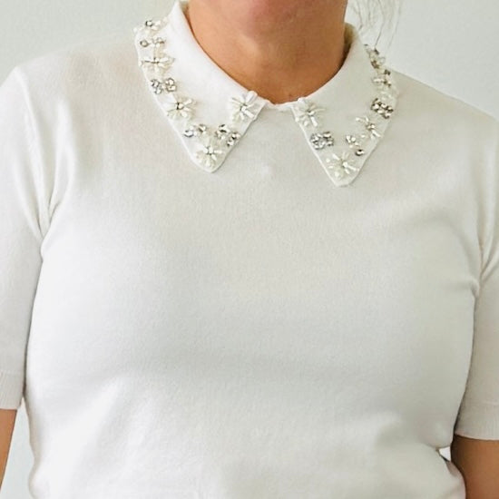Style Tip: Tuck into dark denim or a mini skirt and let the collar do all the talking...no necklace needed.